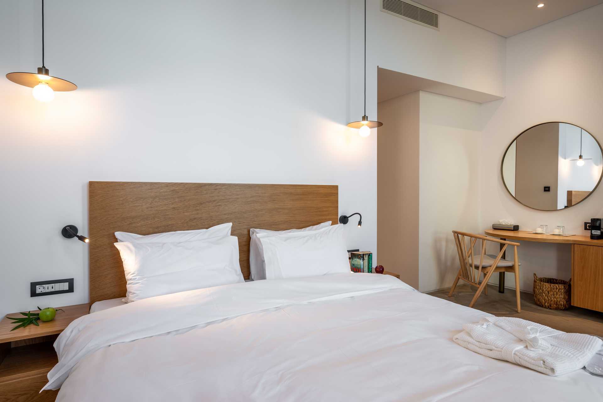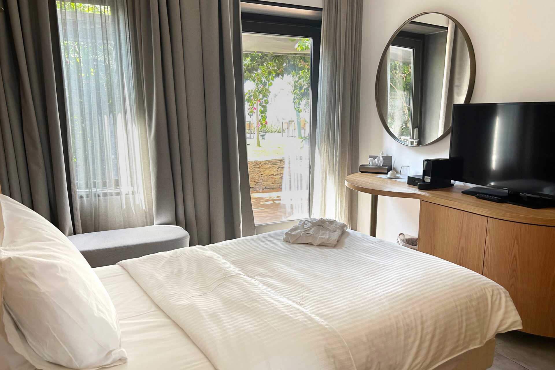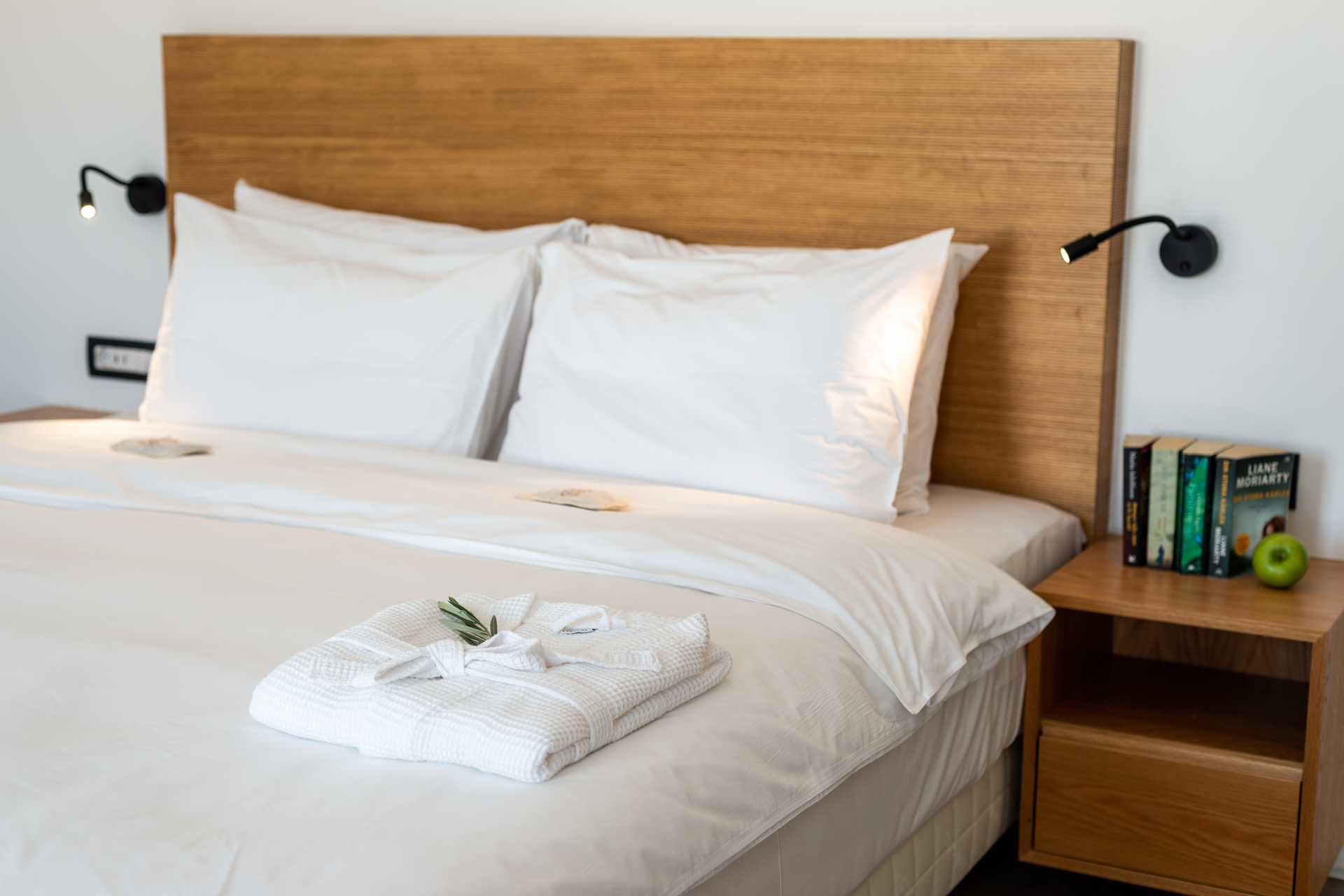 Tweepersoonskamer met balkon of grondterras, sommige balkons hebben zeezicht. Slaapcomfort is uitzonderlijk met een comfortabel tweepersoonsbed en linnengoed van hoge kwaliteit. Wifi, airconditioning en kluisje inbegrepen. Minibar/koelkast. Nespresso-apparaat, vier koffiecapsules zijn inbegrepen, extra capsules zijn te koop bij de receptie. Bluetooth speakers zijn te leen bij de receptie tegen een toeslag. Haardroger. Badkamer met douche en toilet. Om de dag schoonmaak.