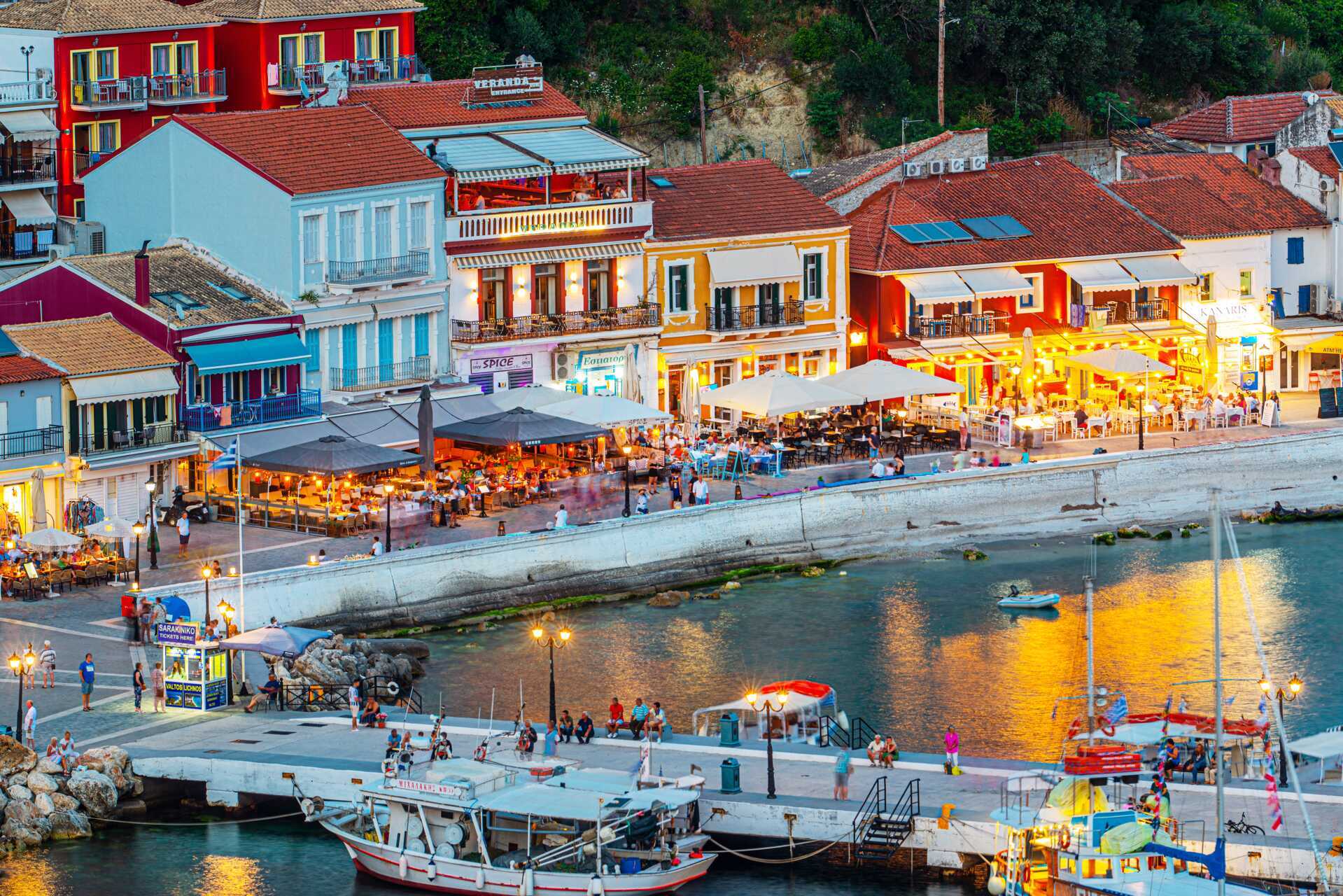 Parga ligt als een prachtig amfitheater aan de haven. 's Avonds is de haven een drukte van belang, met de gezellige verlichting dankzij de populaire taverna's die dicht bij elkaar liggen. Het ruikt er naar barbecue, en vakantievierende stelletjes slenteren rond in de warme avondbries.
