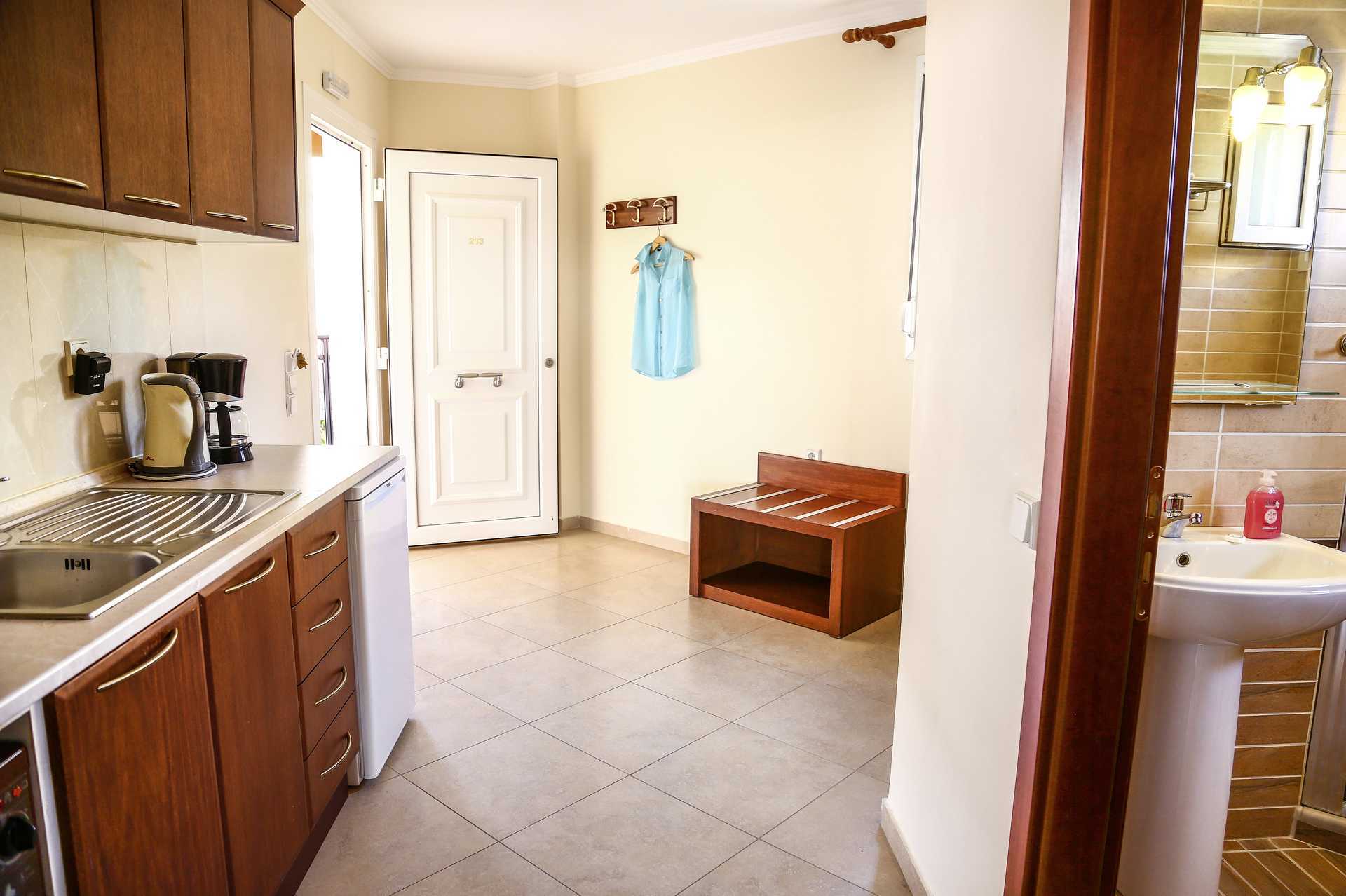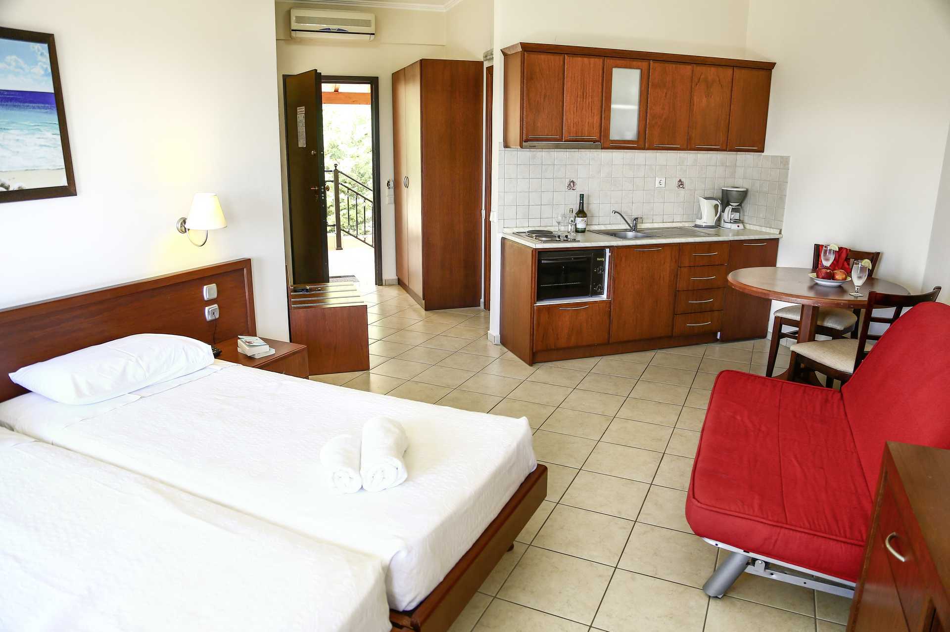 Studios met balkon of terras. Slaapkamer gecombineerd met minikeuken. Mogelijkheid voor extra bedden in slaapbank. Minikeuken met koelkast, kookplaten, koffiezetapparaat, waterkoker, kleine oven en eenvoudig keukengerei. Wifi en kluisje inbegrepen. Airconditioning tegen betaling. Tv met lokale zenders.. Föhn. Badkamer met douche en toilet. Schoonmaak 7 keer/week.