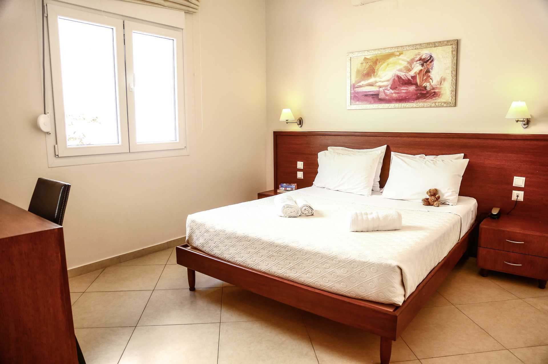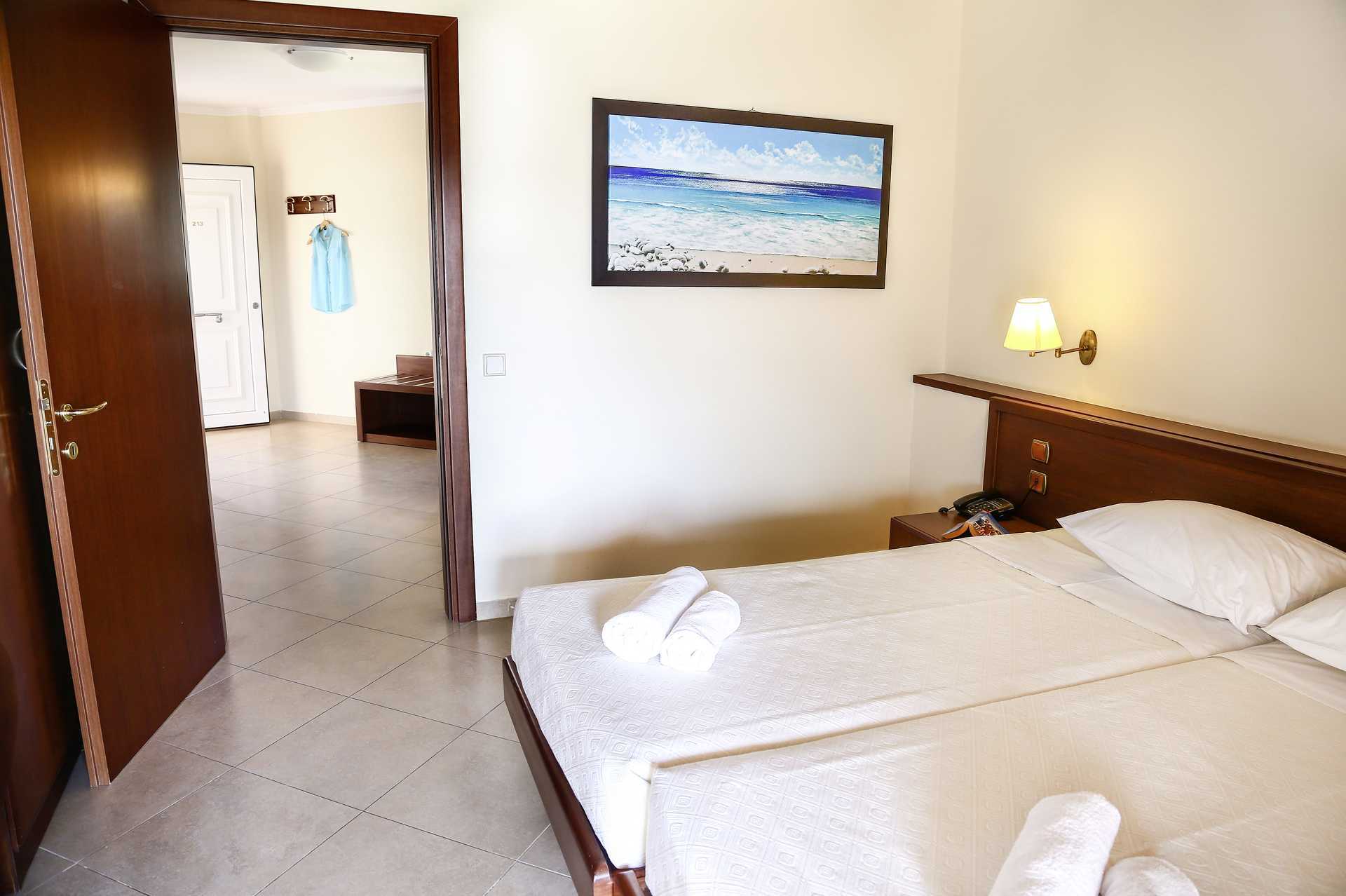 Deluxe tweekamerappartement met terras op de begane grond. Slaapkamer en gecombineerde woonkamer met minikeuken. Een tweepersoonsbed. Mogelijkheid voor extra bedden in slaapbank en eenpersoonsbed. Minikeuken met koelkast, kookplaat, koffiezetapparaat, waterkoker, kleine oven en basiskeukengerei. Wifi en kluisje inbegrepen. Airconditioning tegen betaling. Tv met lokale zenders. Föhn. Badkamer met douche en toilet. Schoonmaak 7 keer per week.