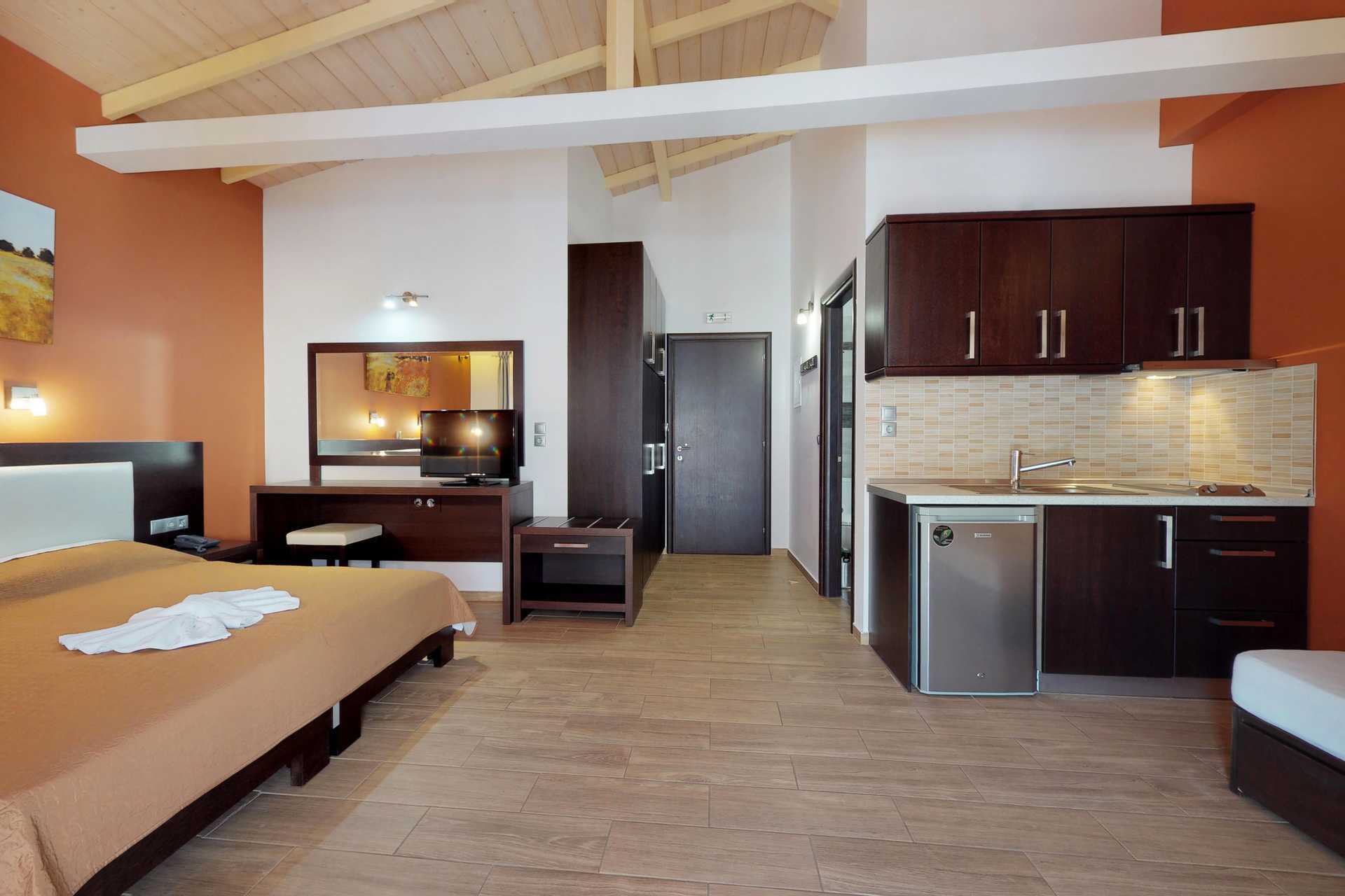 Studio deluxe met balkon of met groot balkon en zeezicht. Slaapkamer met kitchenette. Een tweepersoonsbed. Mogelijkheid tot een extra bed in de vorm van een slaapbank. Kitchenette met koelkast, kookplaat, waterkoker en basiskeukengerei. Wifi, airconditioning en kluisje inbegrepen. Tv met internationale zenders. Föhn. Badkamer met douche en toilet. Schoonmaak 7 keer per week.