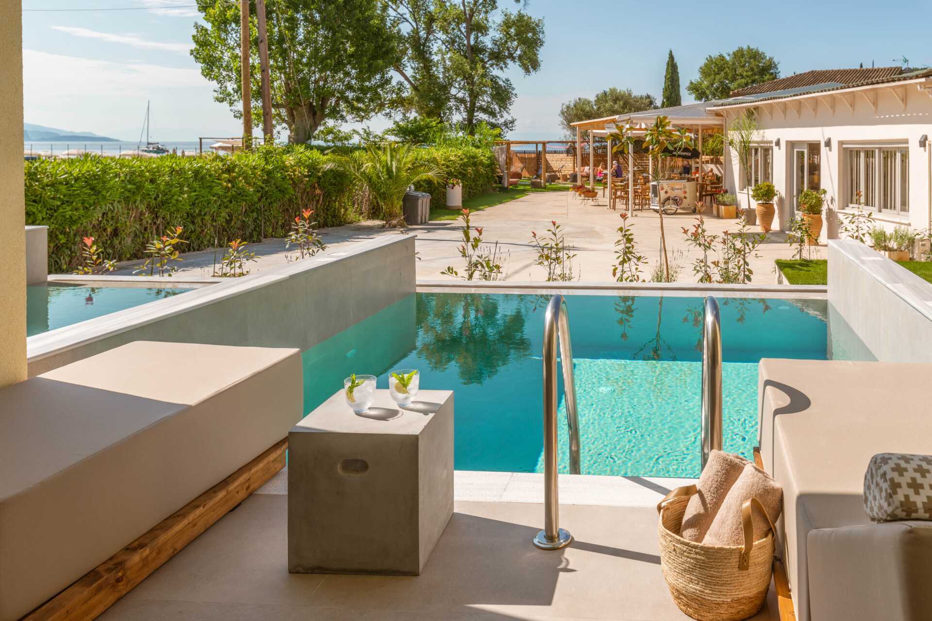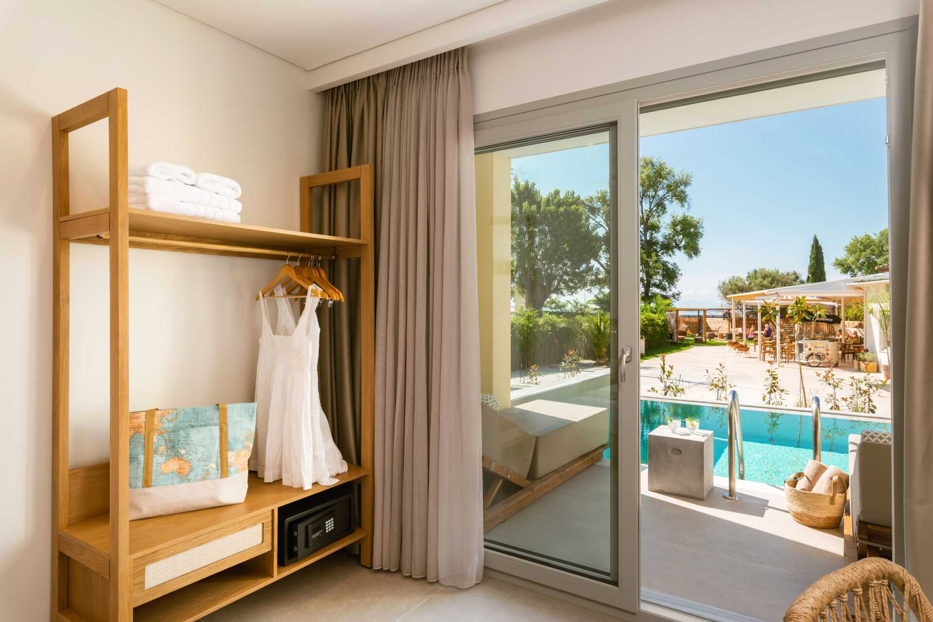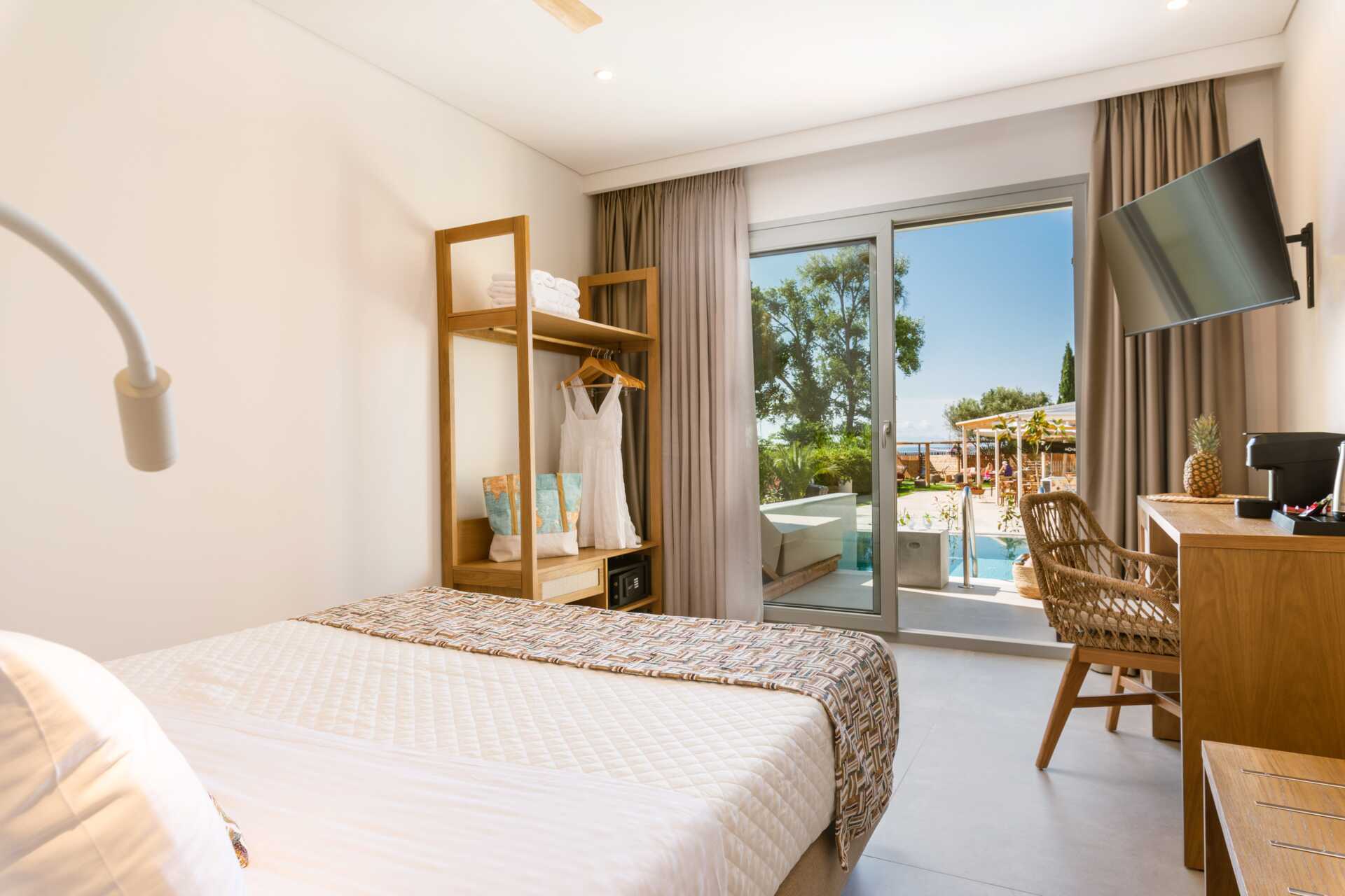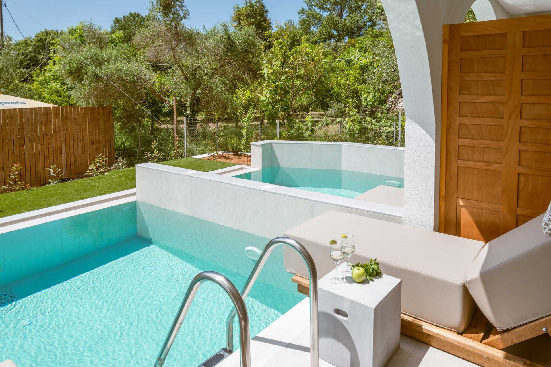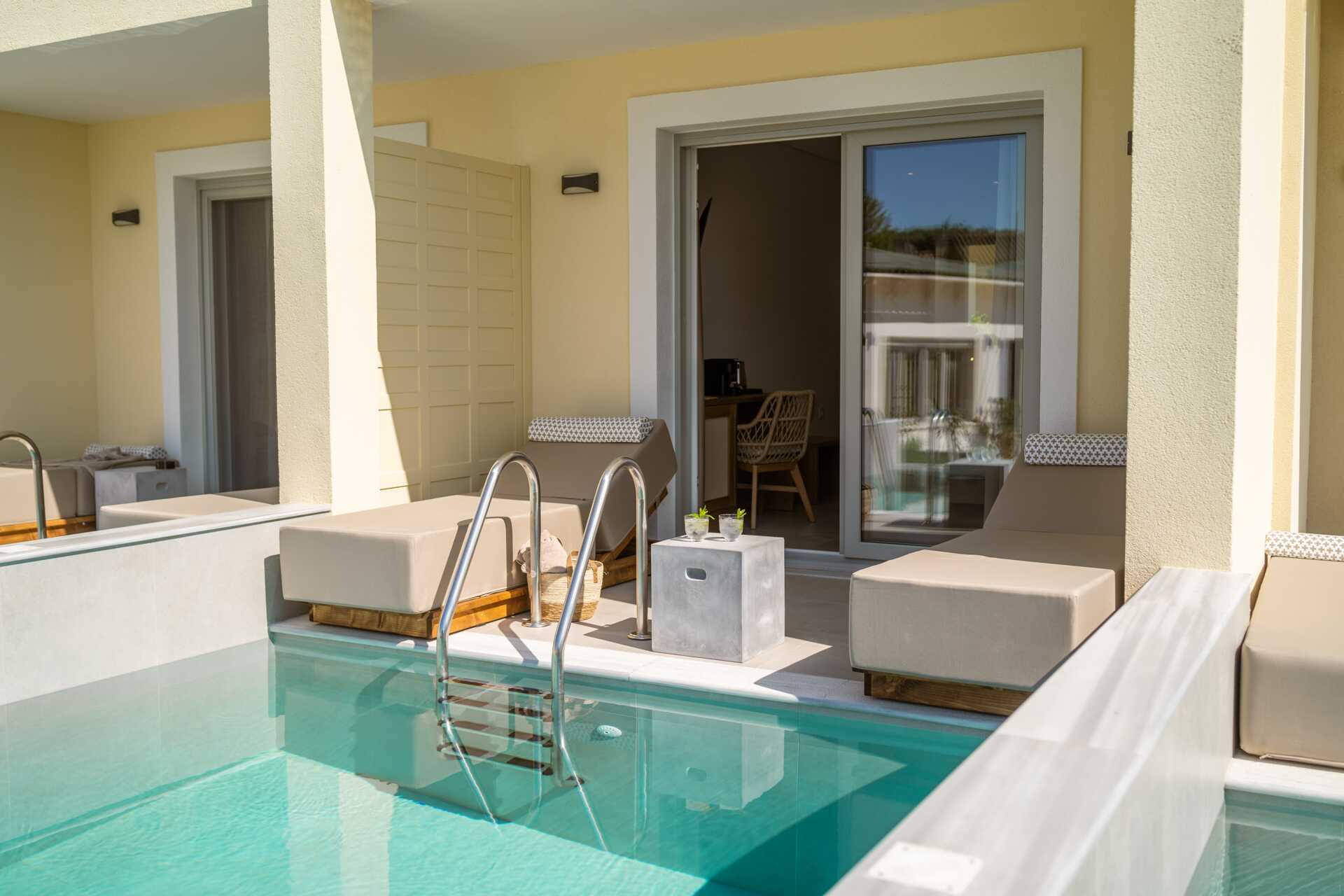 Tweepersoonskamer met een privézwembad op het gelijkvloerse terras. Het terras heeft twee ligbedden en een ladder naar het zwembad. Een tweepersoonsbed. Wifi, airconditioning en kluisje inbegrepen. Koelkast. Waterkoker en koffie en thee. Illy koffiezetapparaat - capsules inbegrepen bij aankomst en daarna te koop bij de receptie. Tv met internationale zenders. Föhn. Hotelslippers. Badkamer met douche en toilet. Schoonmaak 7 keer / week.