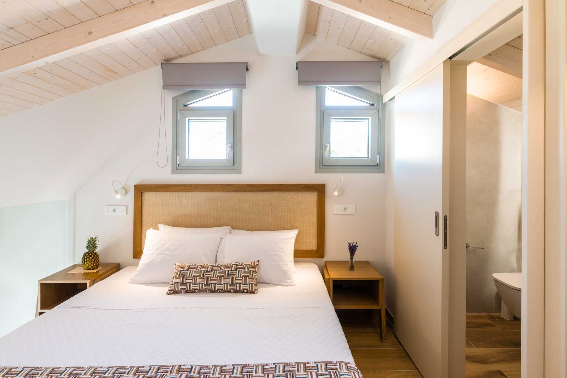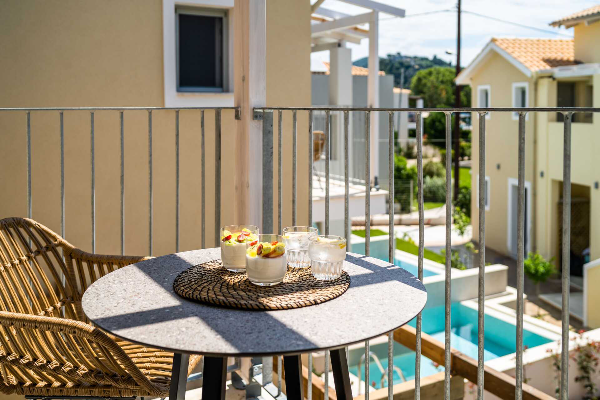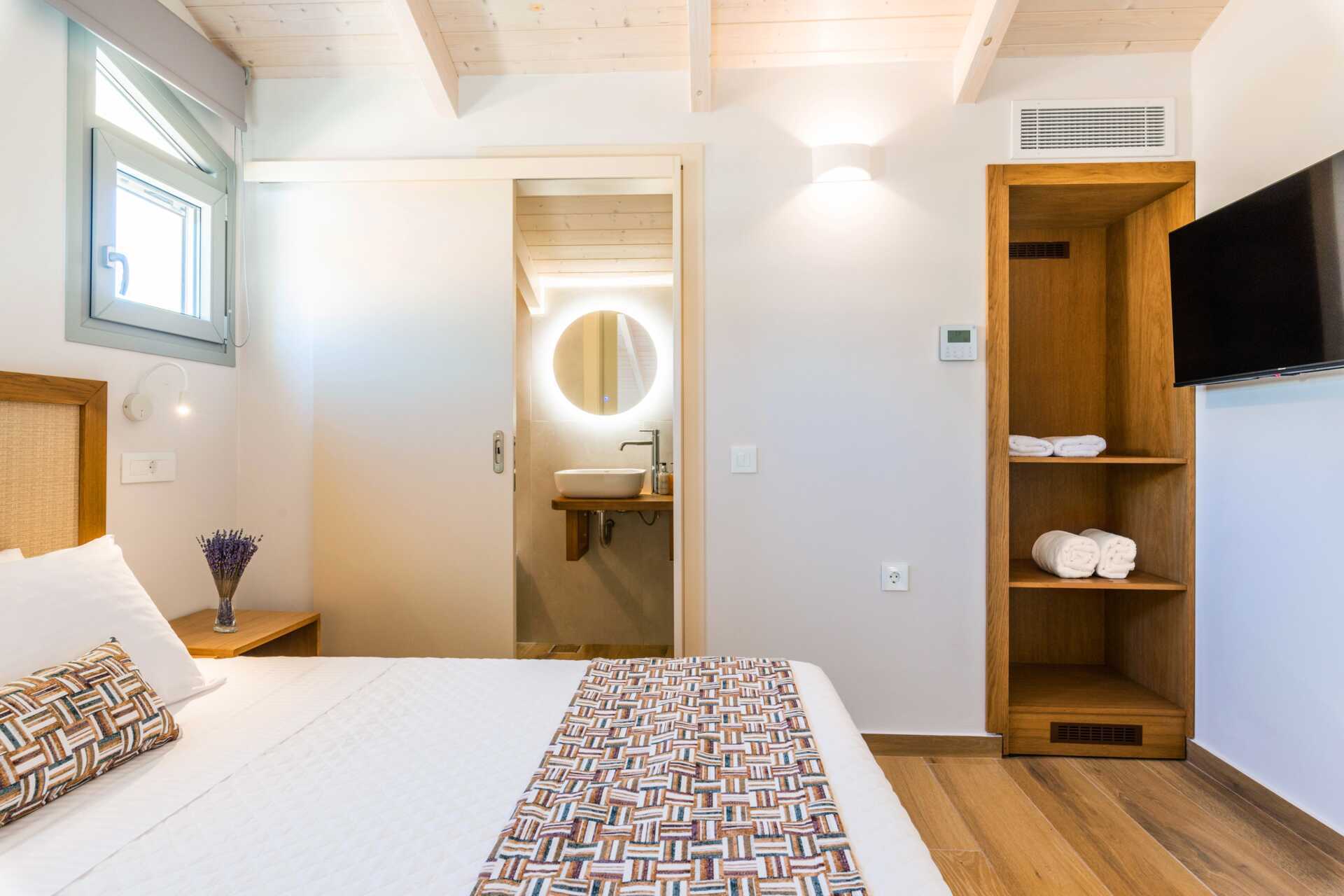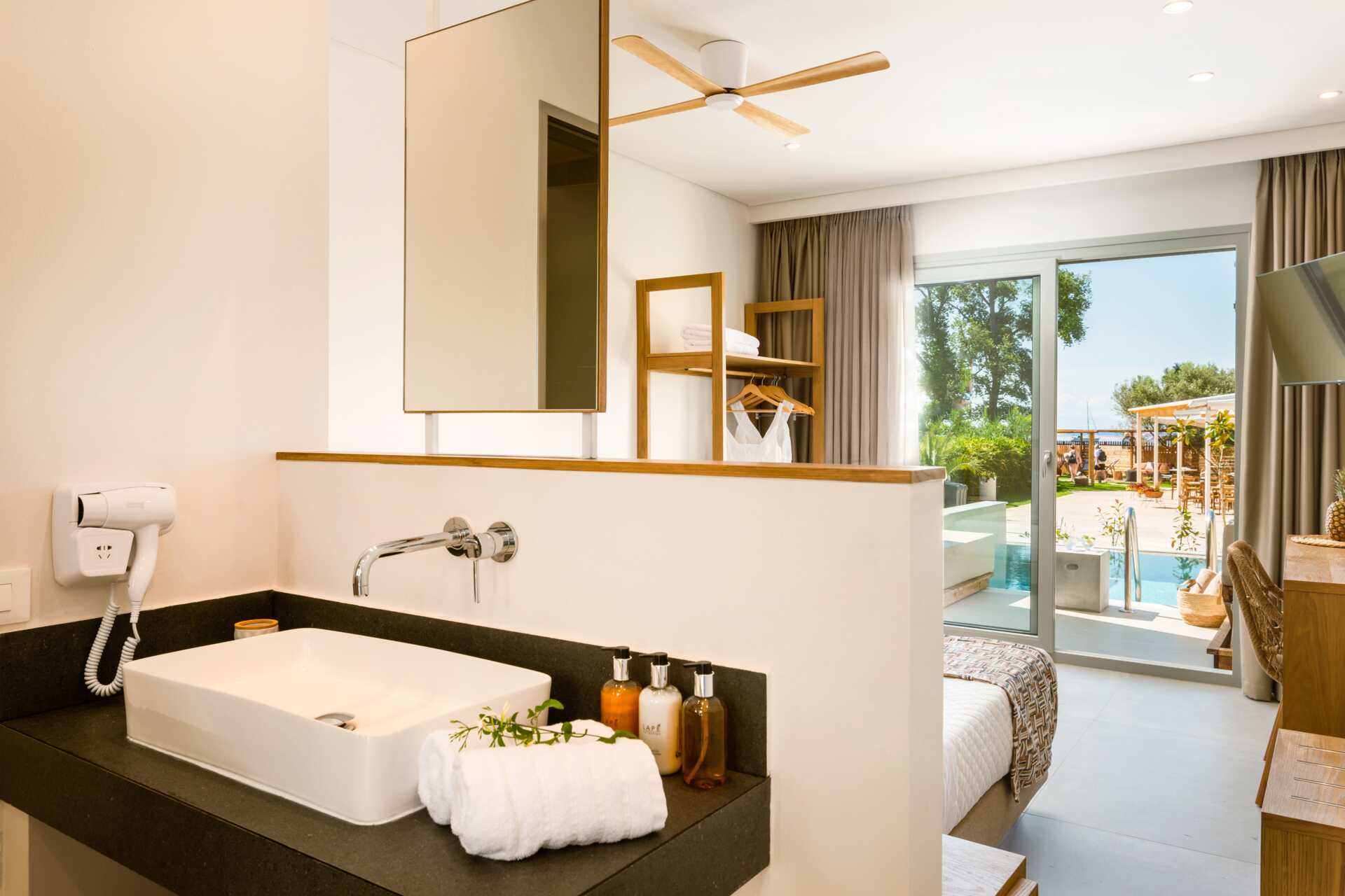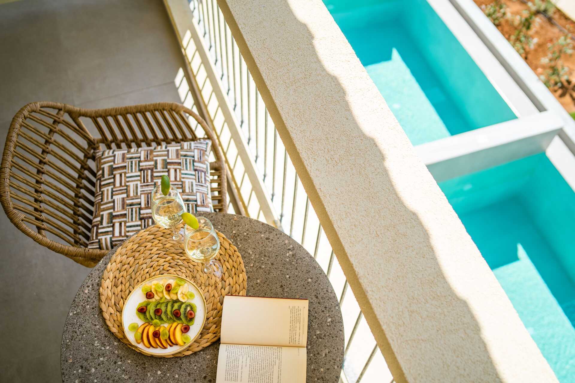 Tweepersoonskamer met een privézwembad op het gelijkvloerse terras. Het terras heeft twee ligbedden en een ladder naar het zwembad. Een tweepersoonsbed. Wifi, airconditioning en kluisje inbegrepen. Koelkast. Waterkoker en koffie en thee. Illy koffiezetapparaat - capsules inbegrepen bij aankomst en daarna te koop bij de receptie. Tv met internationale zenders. Föhn. Hotelslippers. Badkamer met douche en toilet. Schoonmaak 7 keer / week.