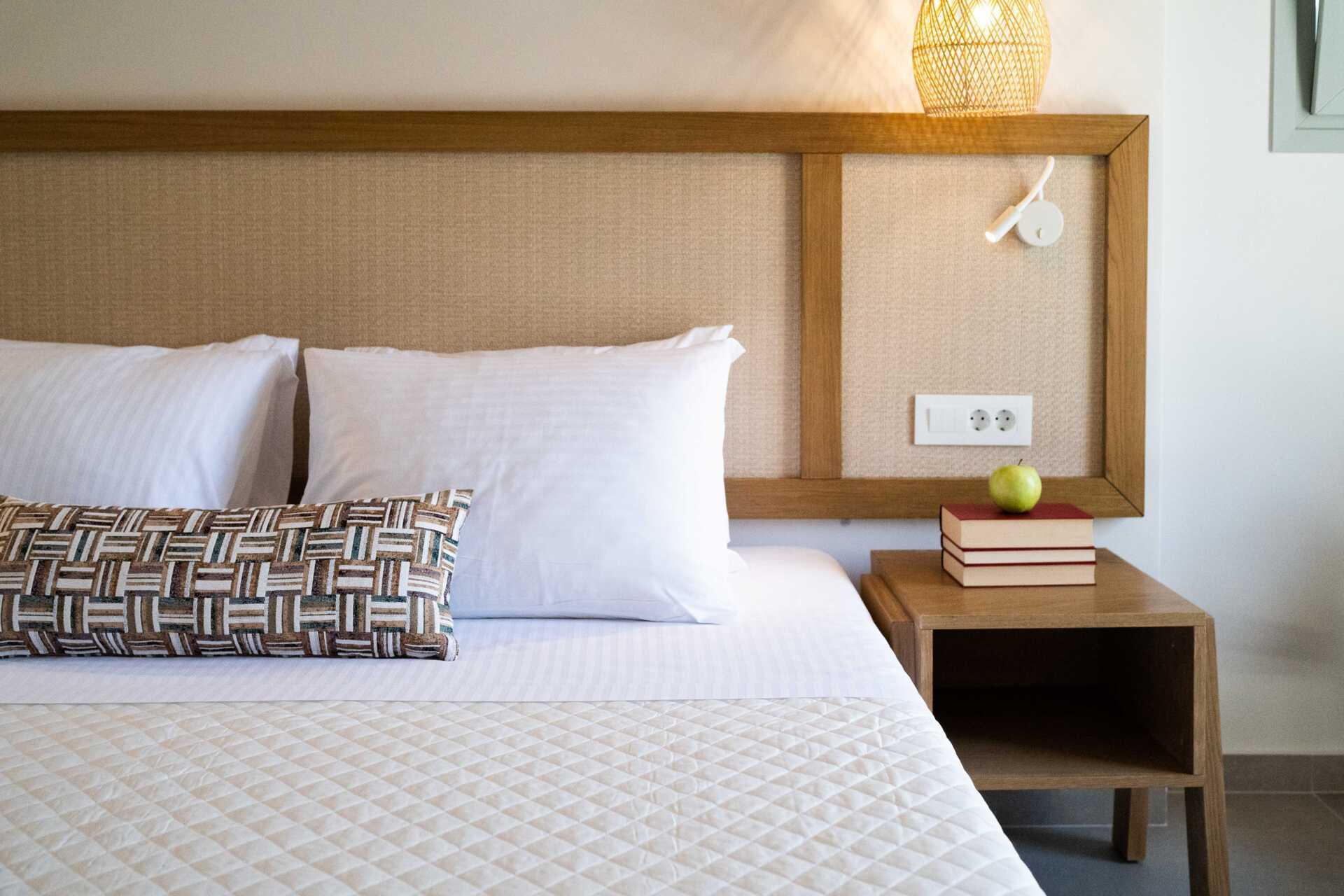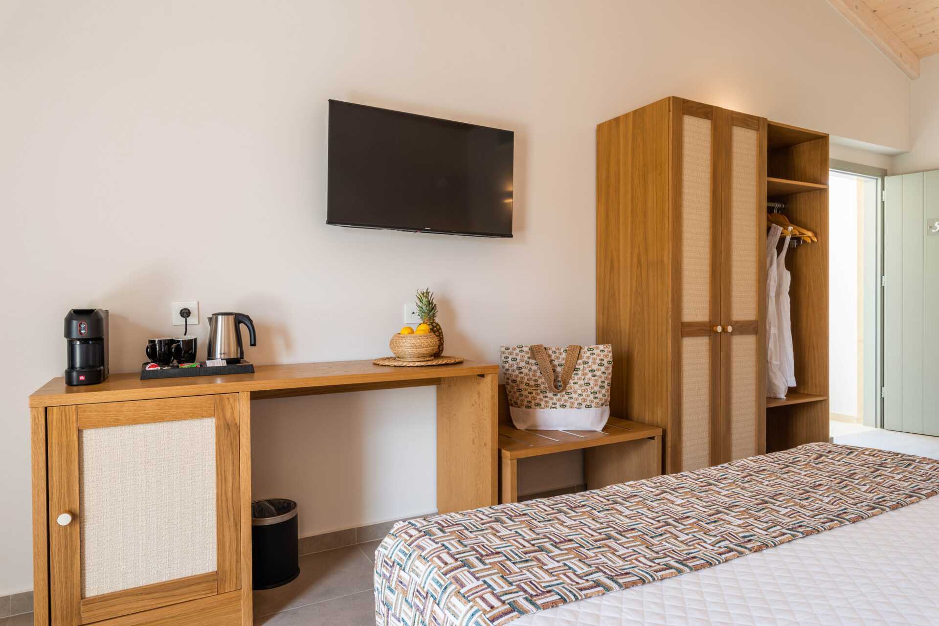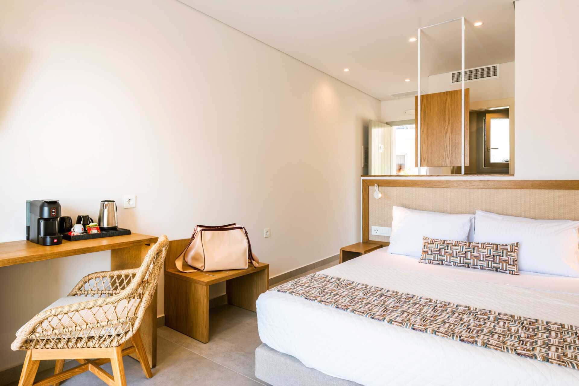 Tweepersoonskamer met balkon, sommige met uitzicht op zee. Een tweepersoonsbed. Wifi, airconditioning en kluis inbegrepen. Koelkast. Elektrische waterkoker en koffie en thee. Illy koffiezetapparaat - capsules inbegrepen bij aankomst en daarna te koop bij de receptie. Tv met internationale zenders. Föhn. Hotelslippers. Badkamer met douche en toilet. Schoonmaak 7 keer / week.