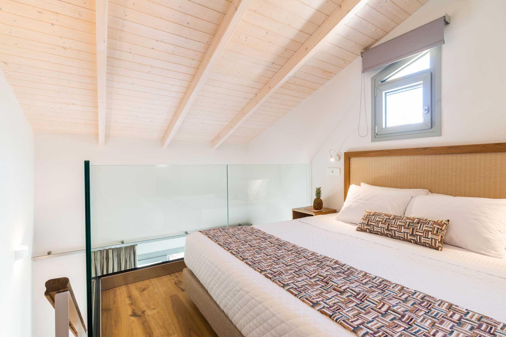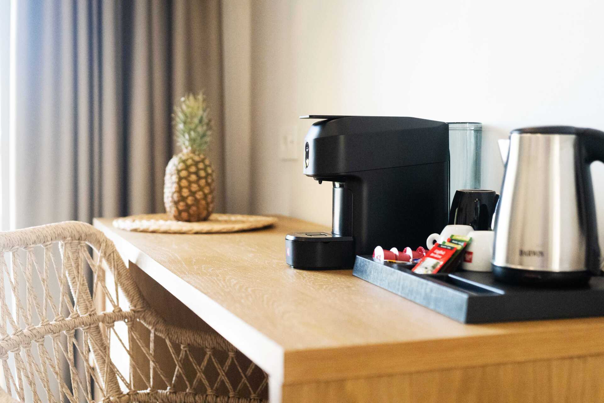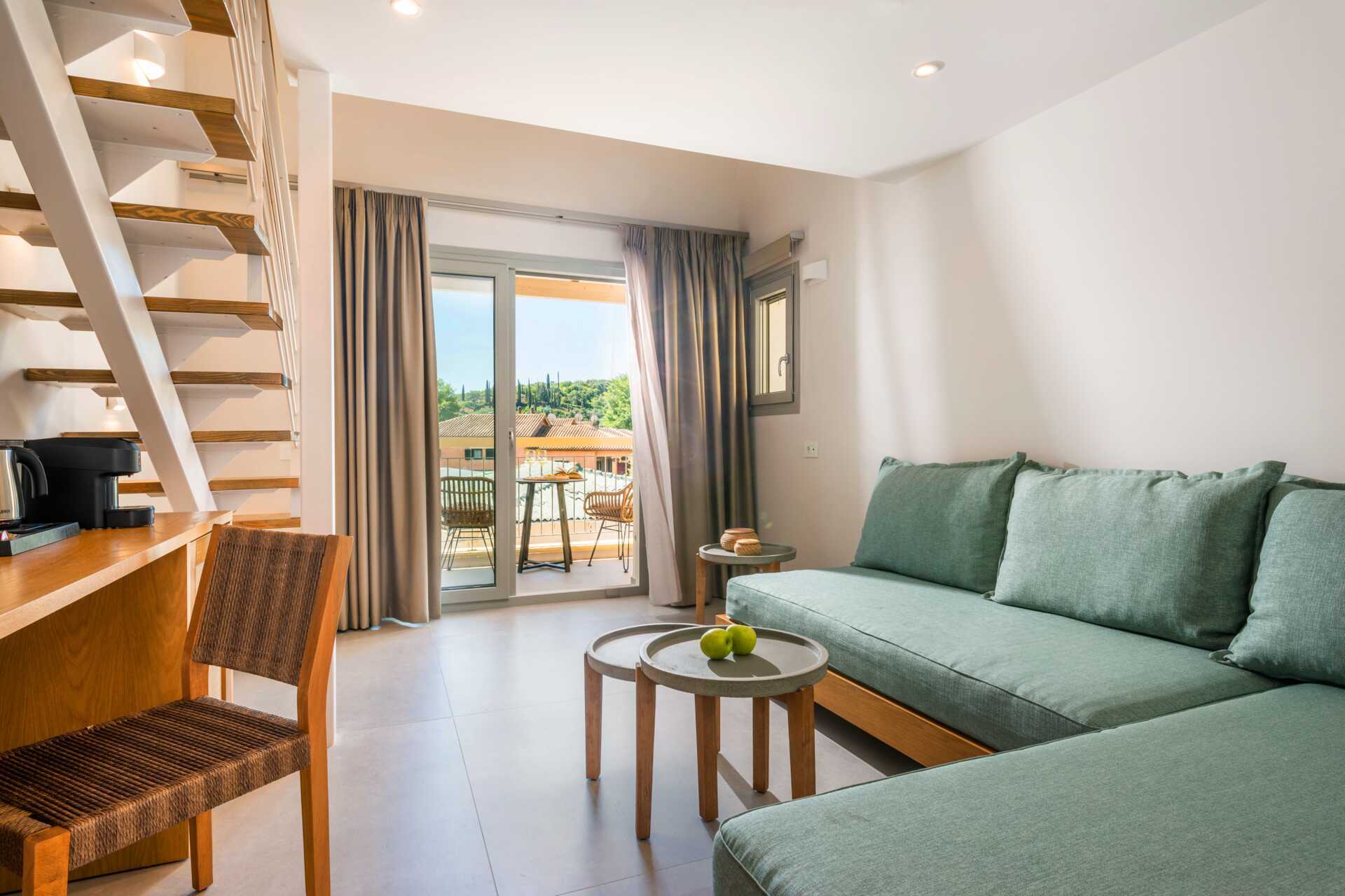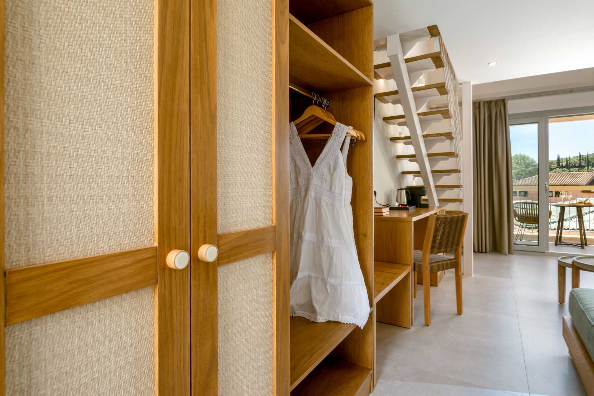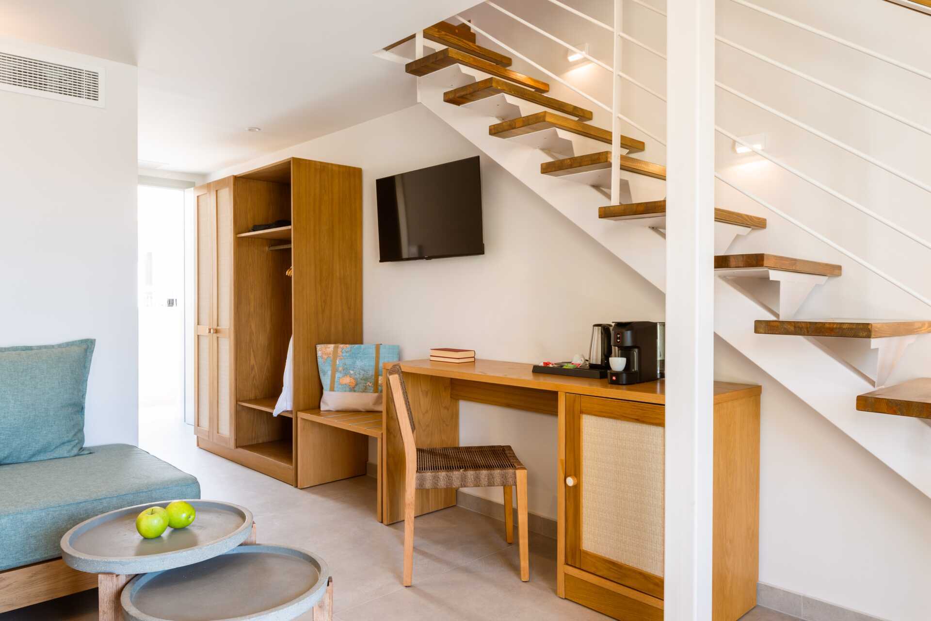 Tweepersoonskamer met balkon, sommige met zeezicht. Op de begane grond is een woonkamer met een bank, en een badkamer met haardroger, douche en toilet. Boven is een slaapzolder met een tweepersoonsbed en een badkamer met föhn, douche en toilet. Wifi, airconditioning en kluisje inbegrepen. Koelkast. Waterkoker en koffie en thee. Illy koffiezetapparaat - capsules inbegrepen bij aankomst en daarna te koop bij de receptie. Tv met internationale zenders. Hotelslippers. Schoonmaak 7 keer / week.