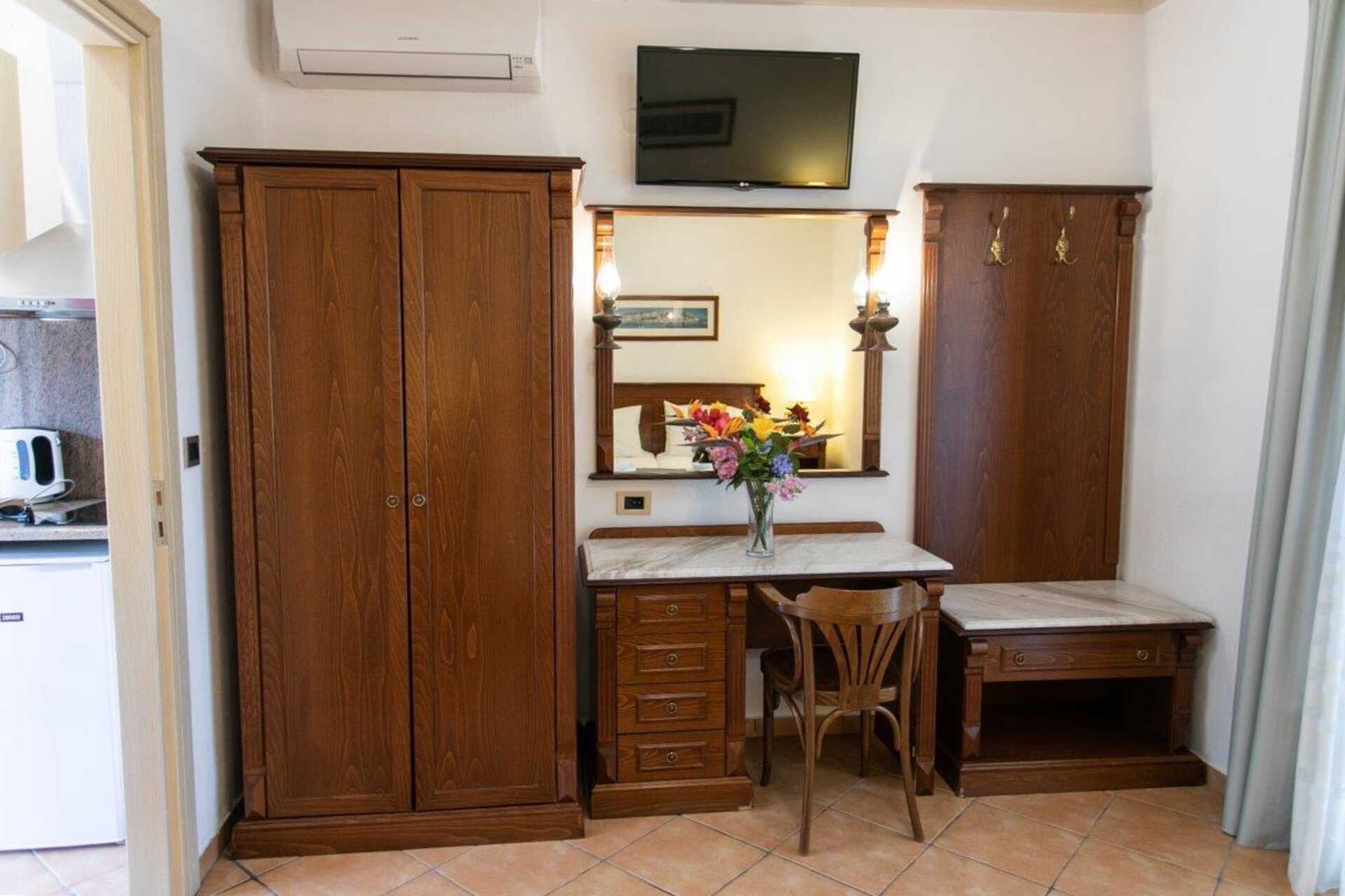 Superior éénkamerappartementen met balkon. Gecombineerde slaapkamer met woonkamer en kitchenette. Een tweepersoonsbed of twee eenpersoonsbedden. Mogelijkheid voor een extra bed in een eenpersoonsbed. Minikeuken met kookplaten, koelkast met vriesvak, magnetron, koffiezetapparaat, waterkoker, broodrooster en eenvoudige keukenapparatuur. Sommige appartementen hebben een oven en sommige hebben een magnetron. Wifi en airconditioning inbegrepen. Kluis tegen betaling. Plafondventilator. TV met internationale zenders. Föhn. Badkamer met bad of douche en toilet. Schoonmaak 6 keer/week. Kinderen jonger dan twee jaar zijn inbegrepen in het maximale aantal personen in het appartement.