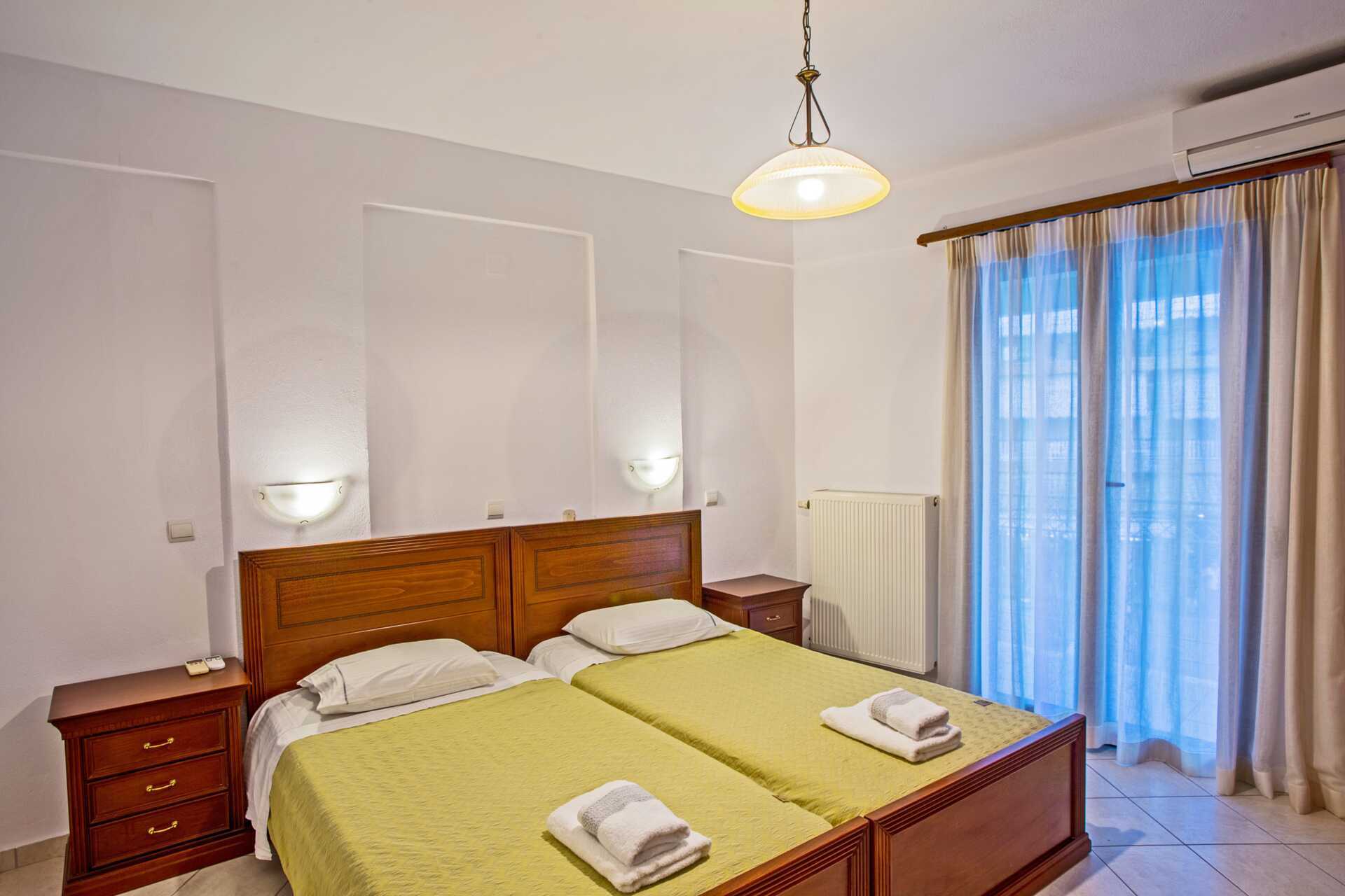Familiekamer op de tweede verdieping met balkon en uitzicht op zee, direct naast hotel Maistrali. Op de begane grond bevindt zich de woonkamer met twee banken, een minikeuken en een kleine badkamer met ligbad en toilet. Boven is er een slaapkamer met twee eenpersoonsbedden, een badkamer met douche en twee balkons, waarvan één met uitzicht op zee. Wifi, airconditioning en kluisje inbegrepen. Tv met internationale zenders. Föhn. Schoonmaak 7 keer/week.