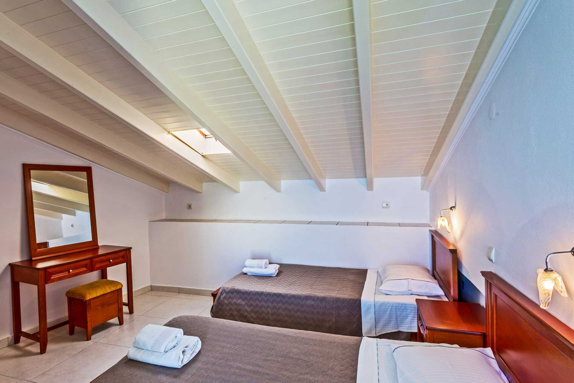 Deluxe kamer met balkon en uitzicht op zee. De luxe kamers op de bovenste verdieping van het huis hebben schuine plafonds. Een tweepersoonsbed of twee eenpersoonsbedden. In sommige kamers is het mogelijk een extra bed voor een kind te plaatsen. Houd er rekening mee dat de kamer krap wordt als er gebruik wordt gemaakt van het extra bed. Wifi, airconditioning en kluisje inbegrepen. Koelkast. Tv met internationale zenders. Föhn. Badkamer met douche en toilet. Schoonmaak 7 keer/week.