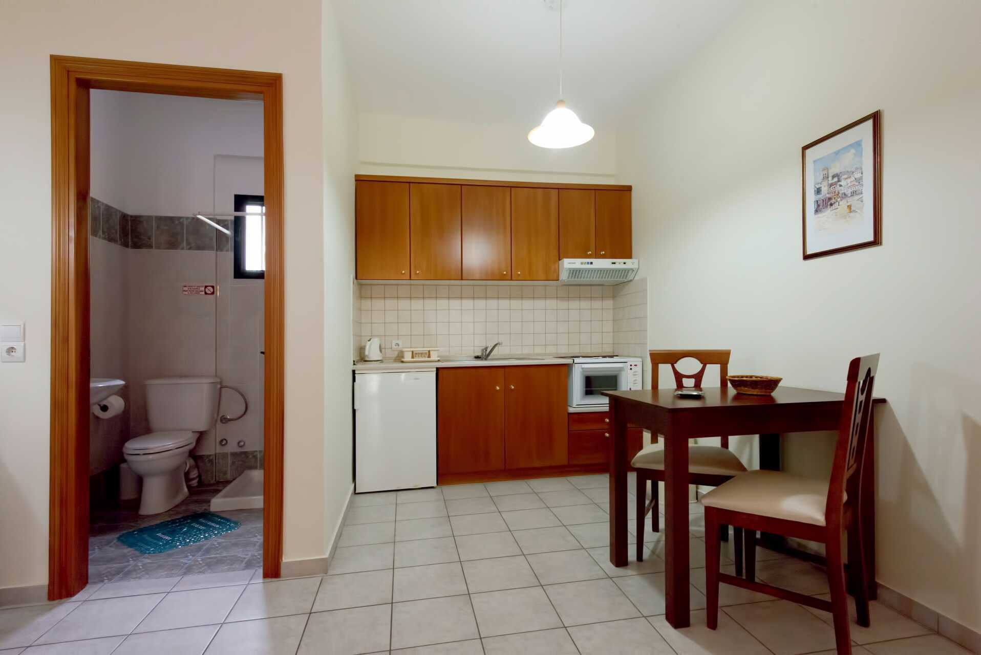 Studio met balkon of terras op de begane grond. Gecombineerde slaapkamer en minikeuken. Eén tweepersoonsbed of twee eenpersoonsbedden. Gratis wifi. Airconditioning en kluisje tegen betaling. Minikeuken met kookplaten, koelkast, waterkoker, tosti-ijzer en eenvoudig keukengerei. Tv met internationale zenders. Föhn. Badkamer met douche en toilet. Schoonmaak 6 keer/week.