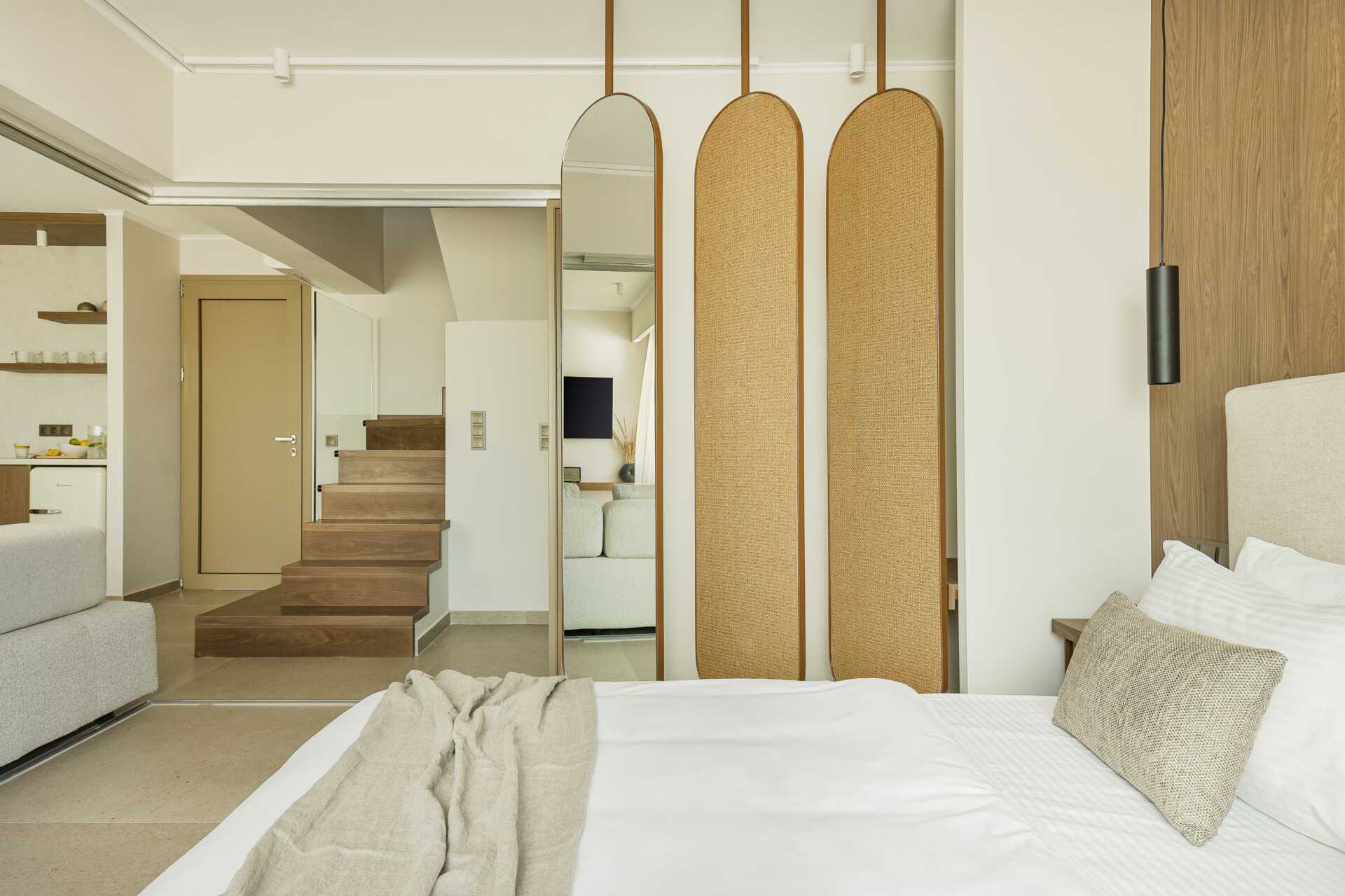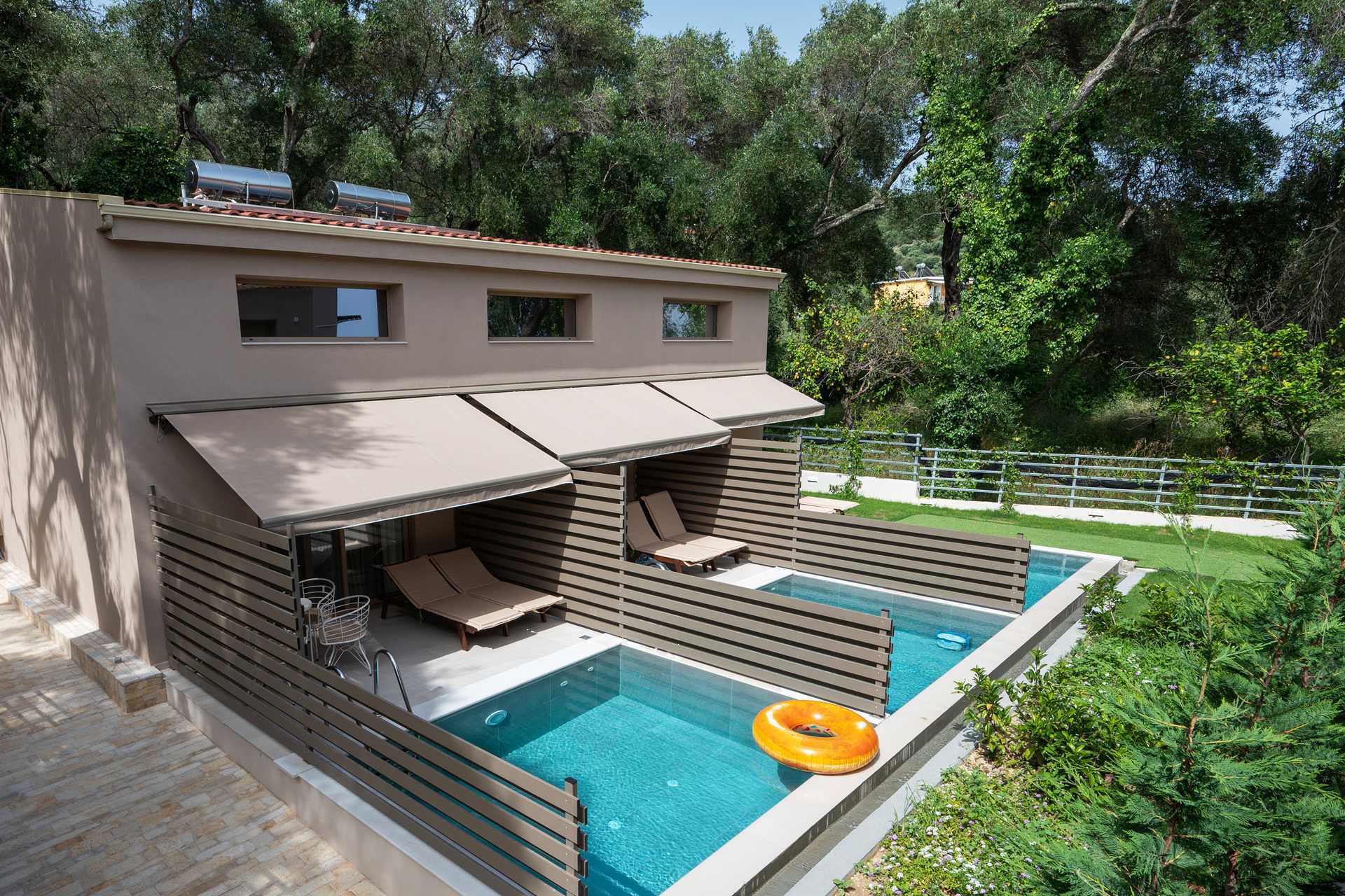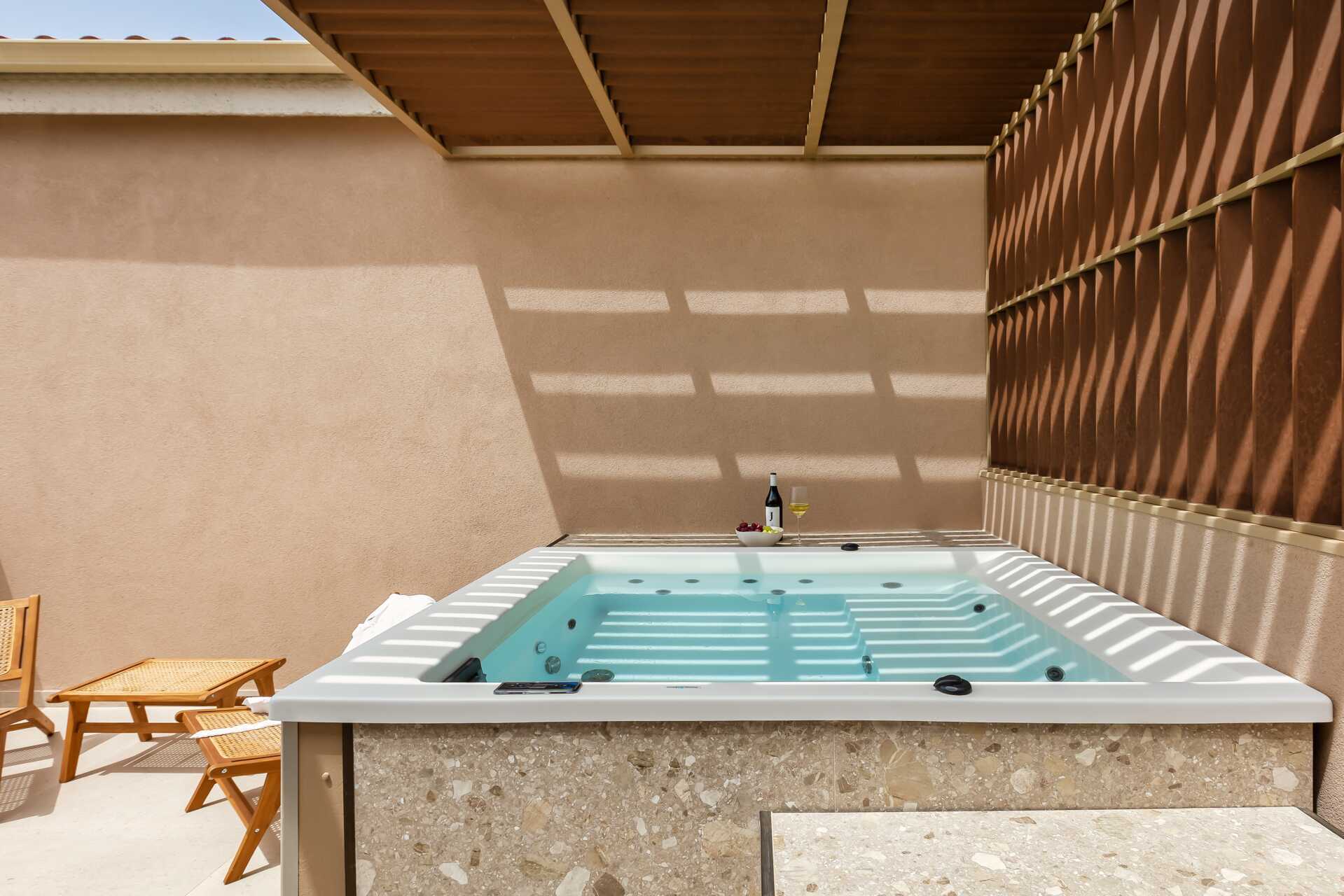 Suite met gelijkvloers terras, ligstoelen en privézwembad. Op de begane grond is er een tweepersoonsbed en een badkamer. Boven is er een slaapzolder met nog een tweepersoonsbed. Wifi, airconditioning (op de bovenverdieping) en kluisje inbegrepen. Koelkast. Waterkoker en koffie en thee. Espressomachine. TV met internationale zenders. Föhn. Badkamer met douche en toilet. Schoonmaak 7 keer/week.
