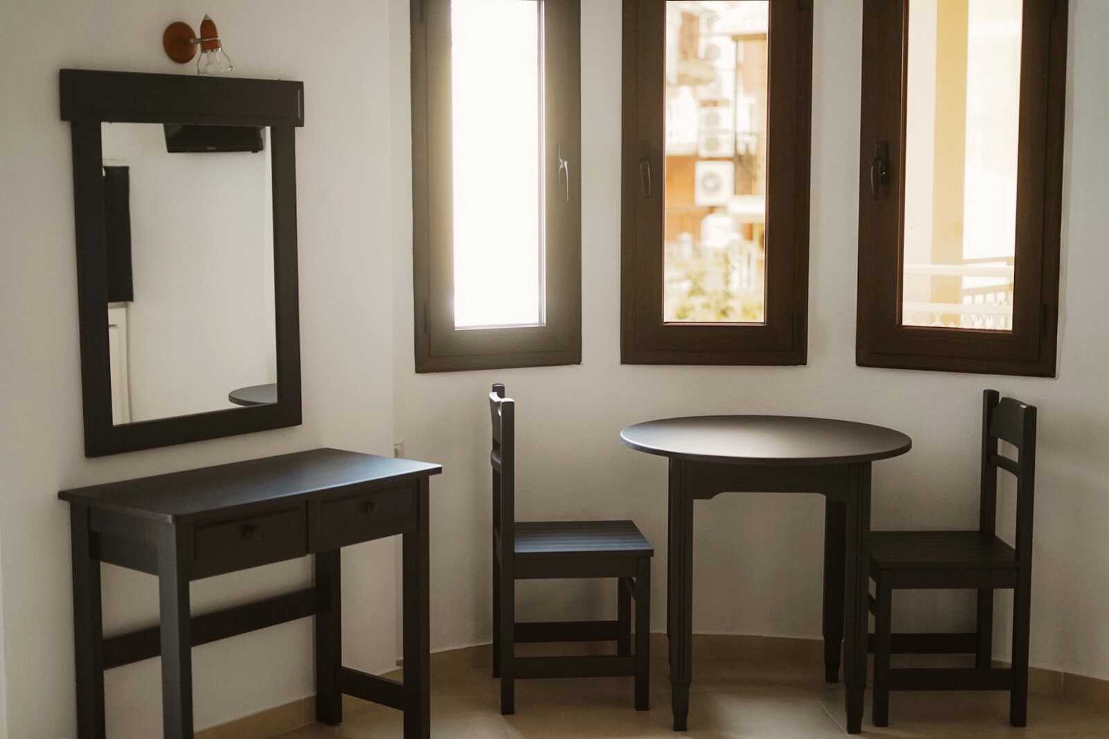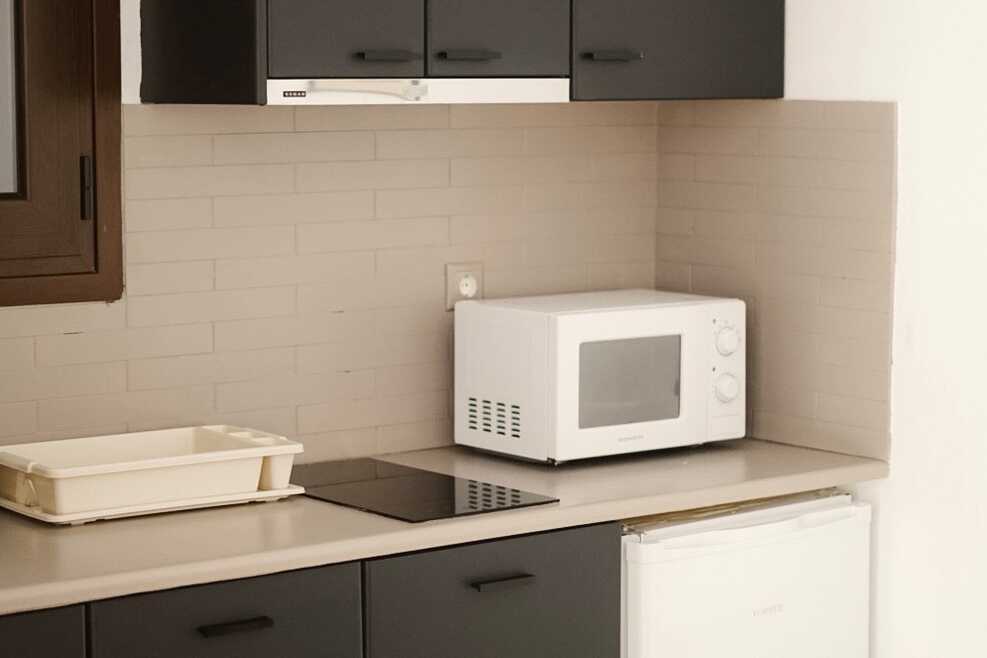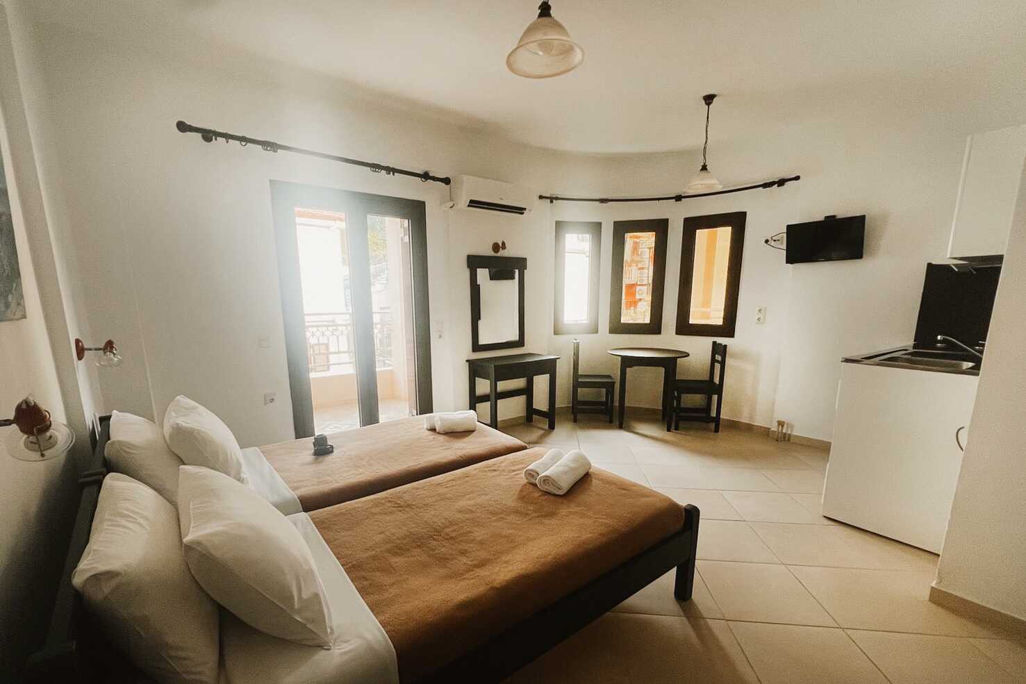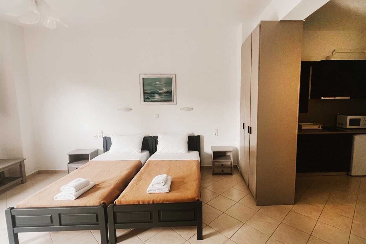 Studio met balkon. Twee eenpersoonsbedden. Gecombineerde slaapkamer met kitchenette. Kitchenette met koelkast, kookplaat, waterkoker en basiskeukengerei. Wifi inbegrepen. Airconditioning en kluisje tegen betaling. Tv met lokale zenders. Badkamer met douche en toilet. Schoonmaak 6 keer/week