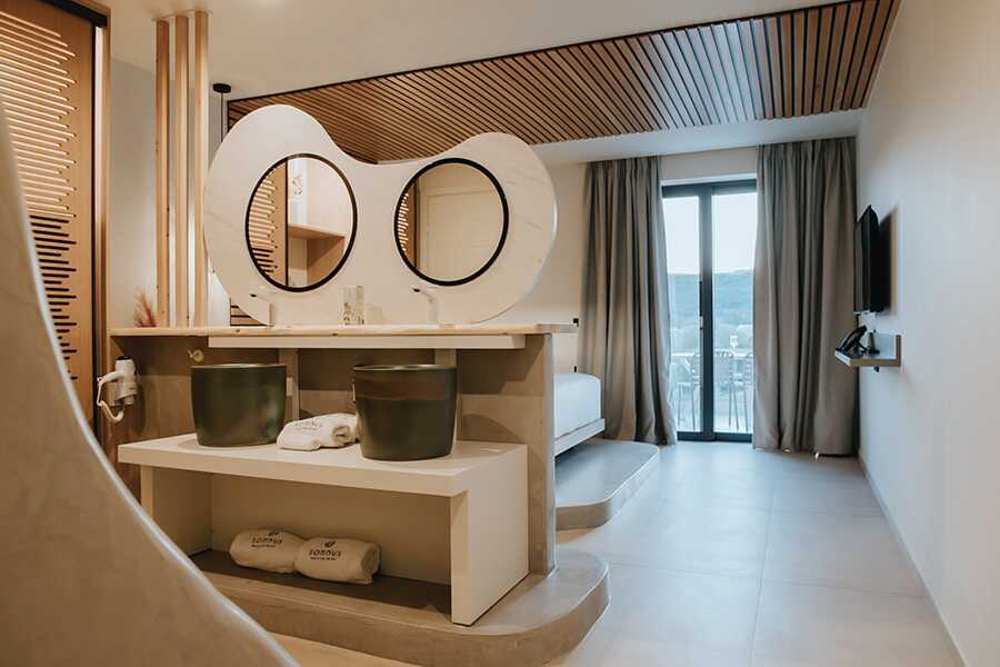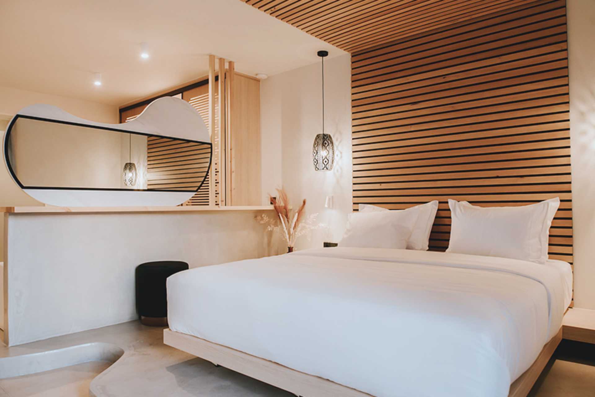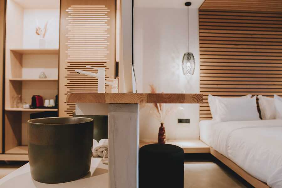 Tweepersoonskamer met klein privézwembad op de patio Een tweepersoonsbed. Wifi, kluisje en airconditioning inbegrepen. Koelkast. Espressomachine en waterkoker. Badkamer, gedeeltelijk open naar de kamer, met douche en toilet. Schoonmaak 7 keer/week.