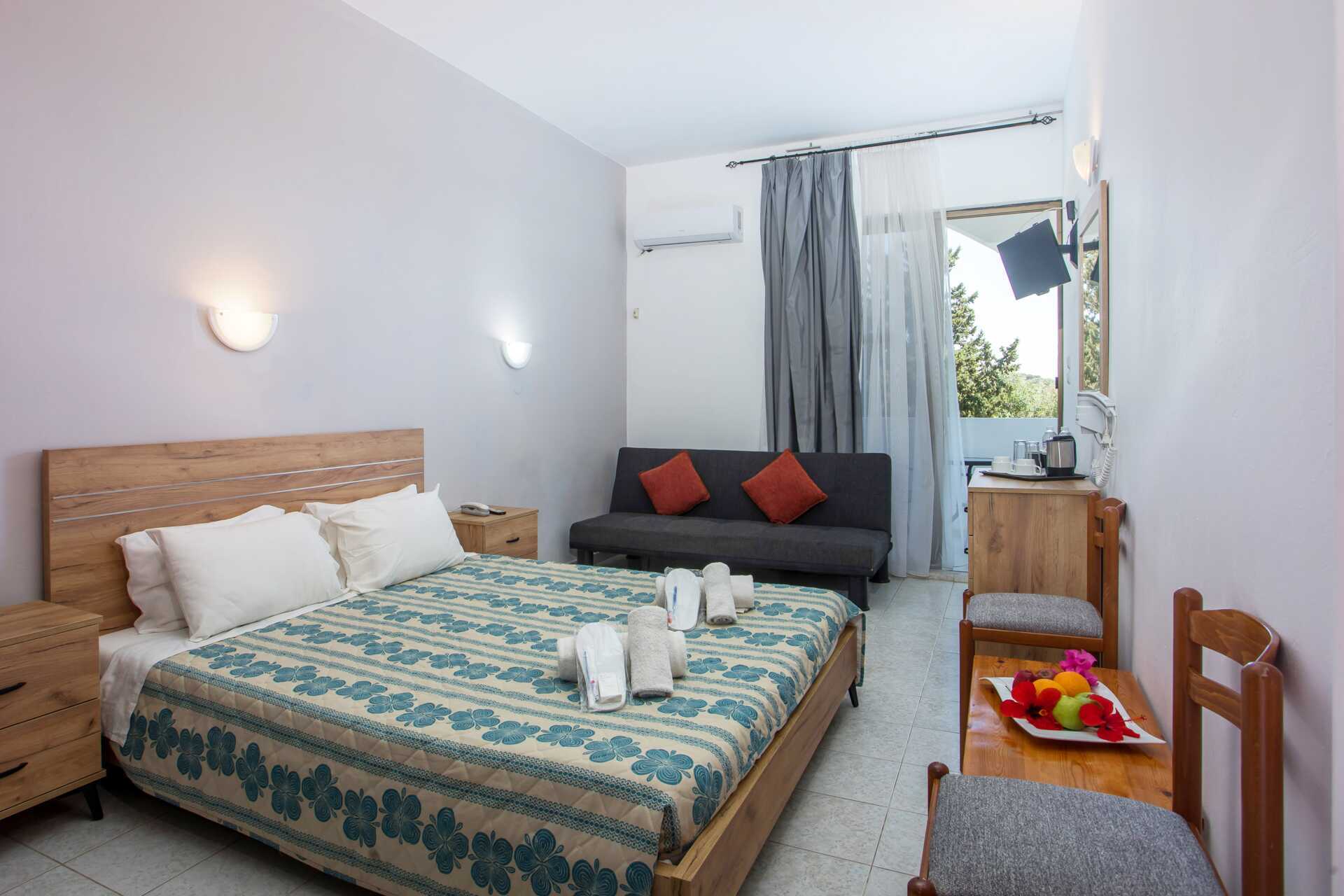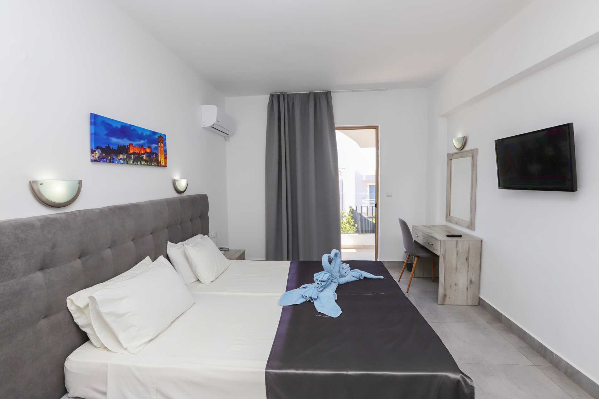 Tweepersoonskamer met balkon of terras. Een tweepersoonsbed of twee eenpersoonsbedden. Mogelijkheid tot extra bed in de vorm van een slaapbank. Wifi, airconditioning en kluisje inbegrepen. Koelkast en waterkoker. Tv met internationale zenders. Föhn. Badkamer met douche en toilet. Schoonmaak 6 keer/week.