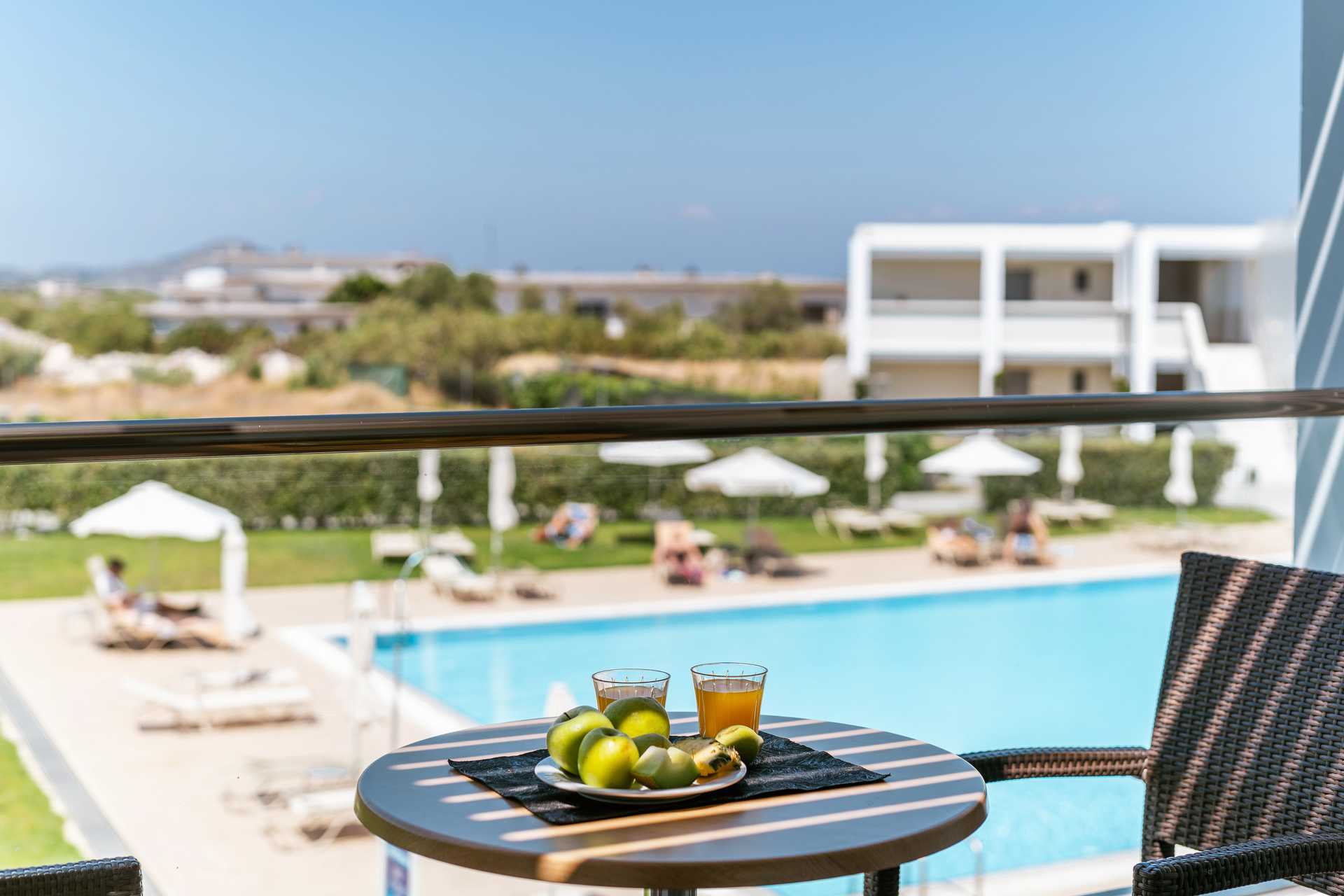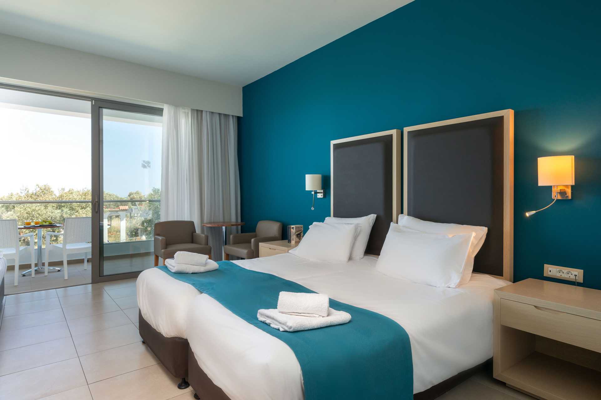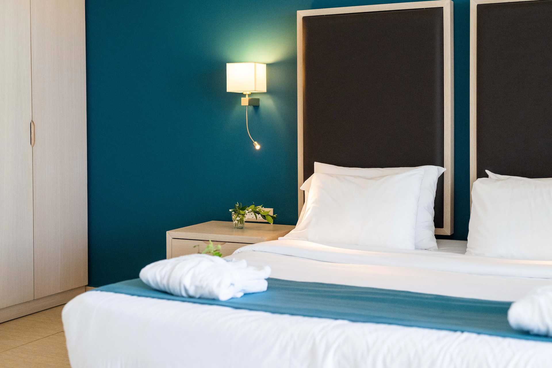 Tweepersoonskamers met balkon of terras. Sommige balkons hebben uitzicht op het zwembad, zeezicht of beperkt zeezicht. Twee eenpersoonsbedden, of één tweepersoonsbed. Slaapbank voor extra slaapplaats. Gratis wifi, airconditioning en kluisje. Kleine koelkast en een waterkoker. TV met internationale zenders. Föhn. Badkamer met bad of douche en met toilet. Schoonmaak 7 keer/week.