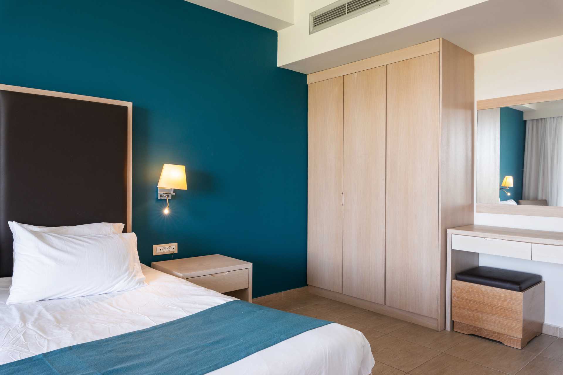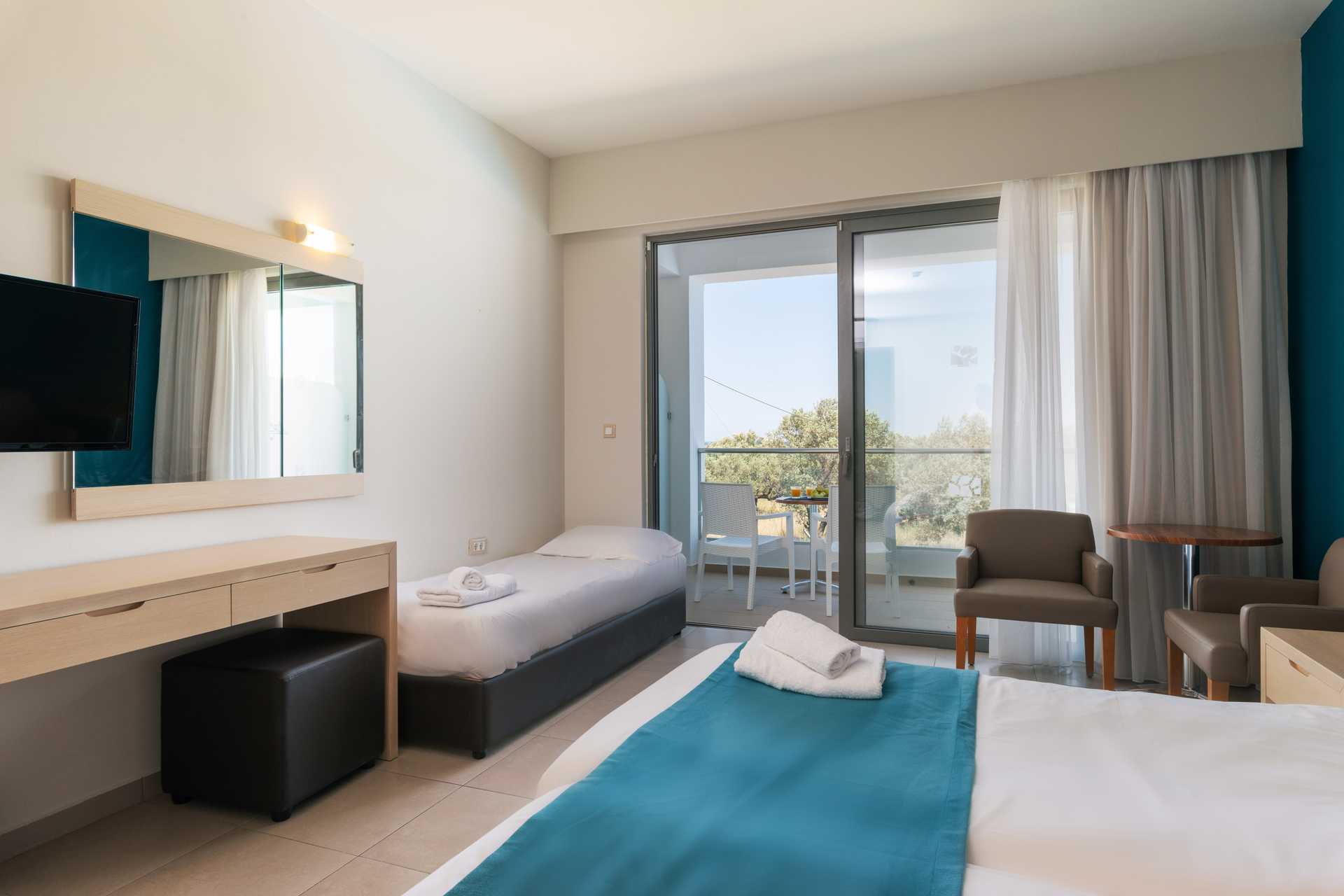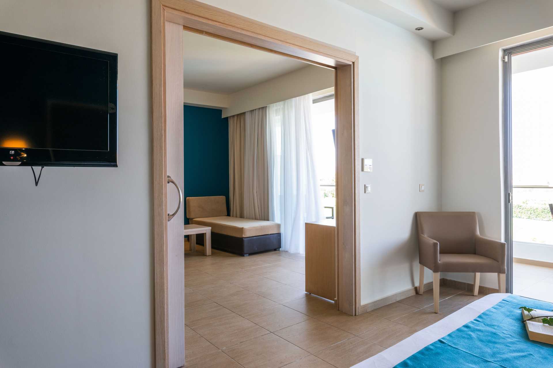 Familiekamer met balkon of terras op de begane grond. Sommige balkons hebben uitzicht op het zwembad, zeezicht of beperkt zeezicht. Een slaapgedeelte en een woongedeelte die gescheiden kunnen worden met een schuifdeur. Eén tweepersoonsbed of twee eenpersoonsbedden. Slaapbanken voor extra slaapplaatsen. Gratis wifi, airconditioning en kluisje. Kleine koelkast en waterkoker. TV met internationale zenders. Föhn. Badkamer met bad of douche en met toilet. Schoonmaak 7 keer/week.