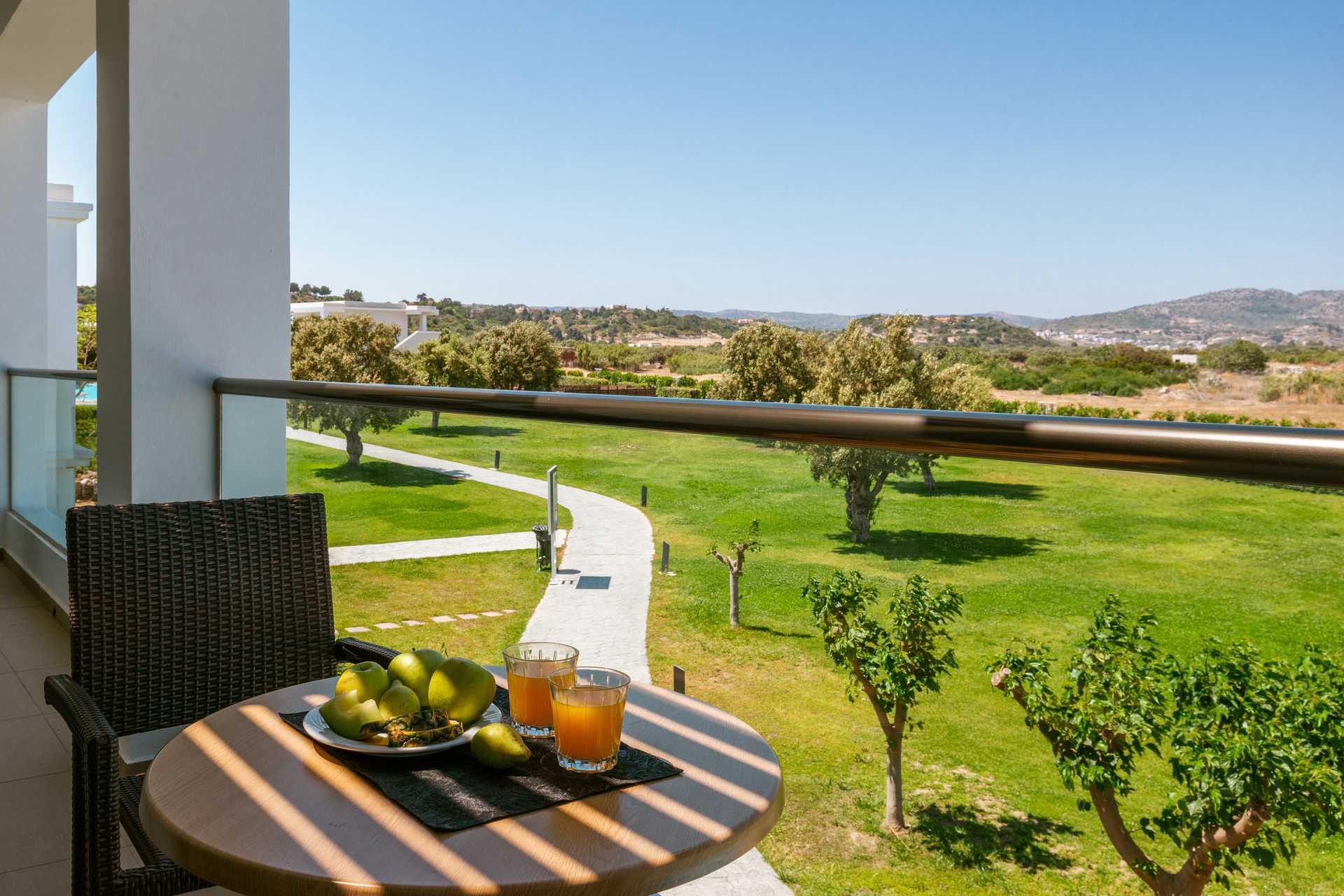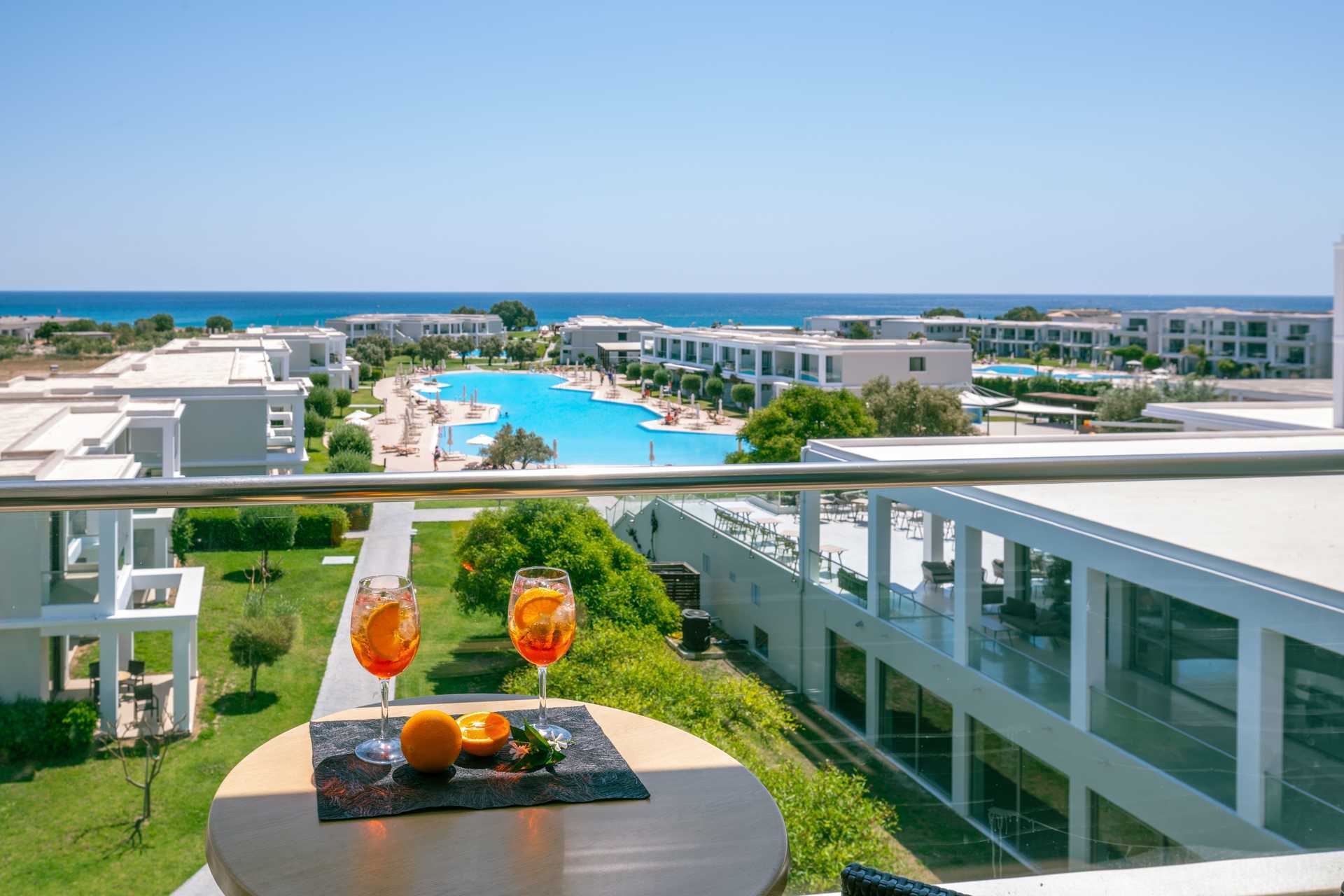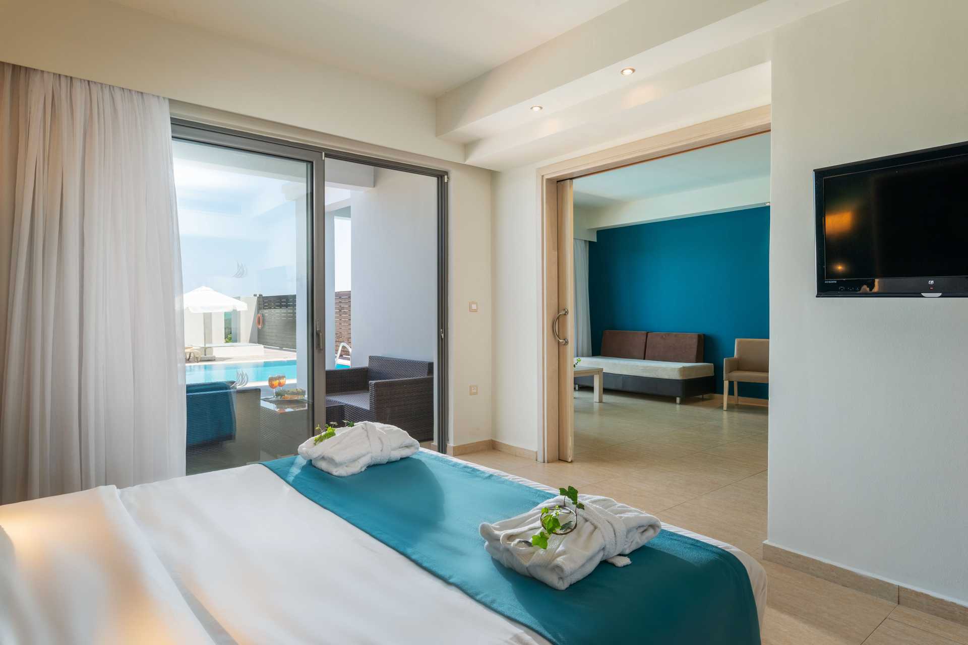 Familiekamer met balkon of terras op de begane grond. Sommige balkons hebben uitzicht op het zwembad, zeezicht of beperkt zeezicht. Een slaapgedeelte en een woongedeelte die gescheiden kunnen worden met een schuifdeur. Eén tweepersoonsbed of twee eenpersoonsbedden. Slaapbanken voor extra slaapplaatsen. Gratis wifi, airconditioning en kluisje. Kleine koelkast en waterkoker. TV met internationale zenders. Föhn. Badkamer met bad of douche en met toilet. Schoonmaak 7 keer/week.