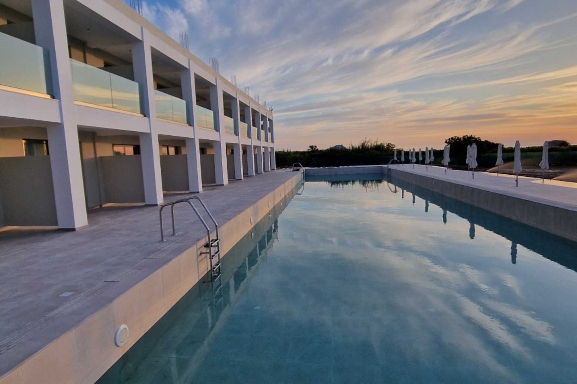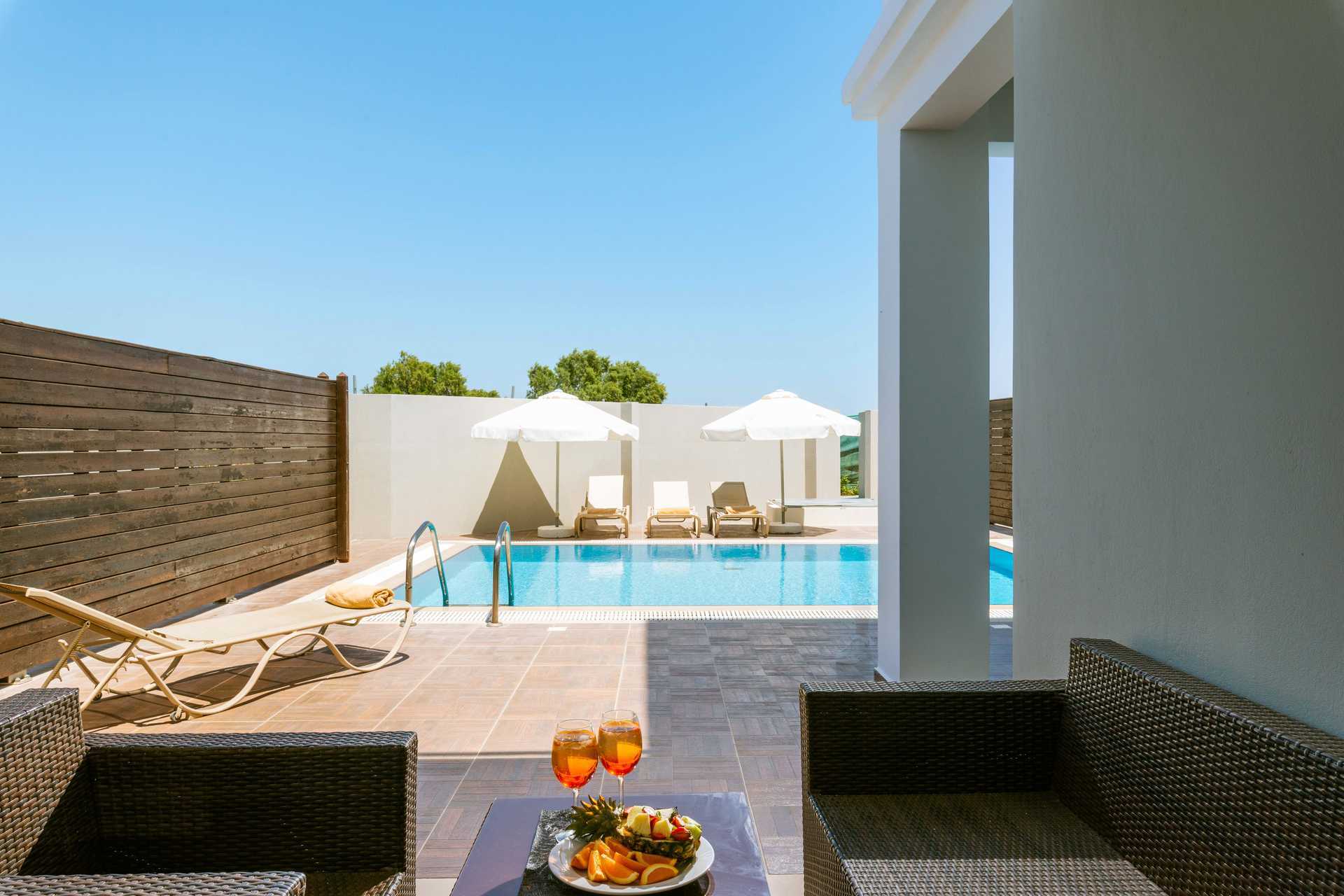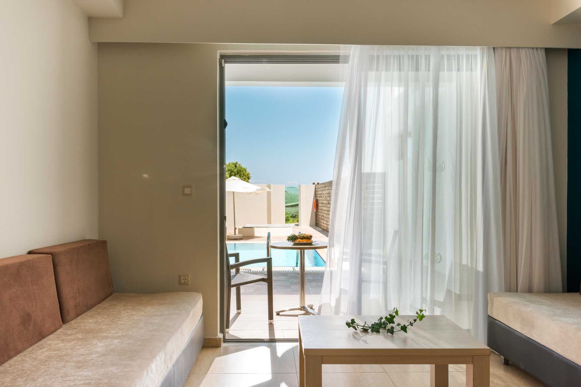 Familiekamer met patio en privé zwembad. De patio heeft comfortabele loungemeubelen en ligstoelen. Een slaapgedeelte en een woongedeelte die gescheiden kunnen worden door een schuifdeur. Een tweepersoonsbed. Mogelijkheid voor extra bedden op slaapbanken. Wifi, airconditioning en kluisje inbegrepen. Koelkast. Elektrische waterkoker. TV met internationale zenders. Föhn. Badkamer met bad of douche en toilet. Schoonmaak 7 keer/week.