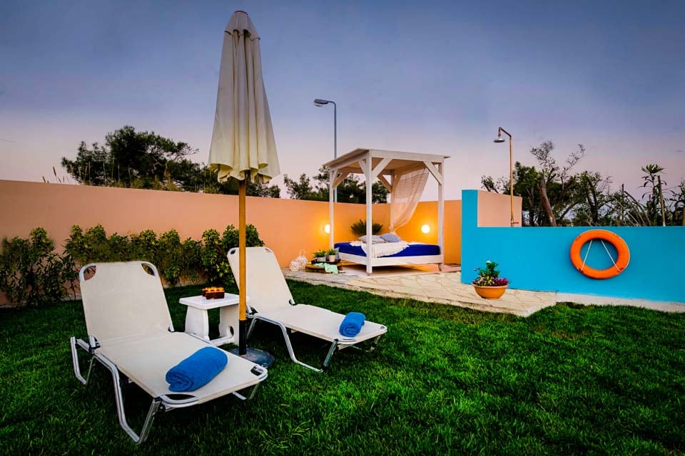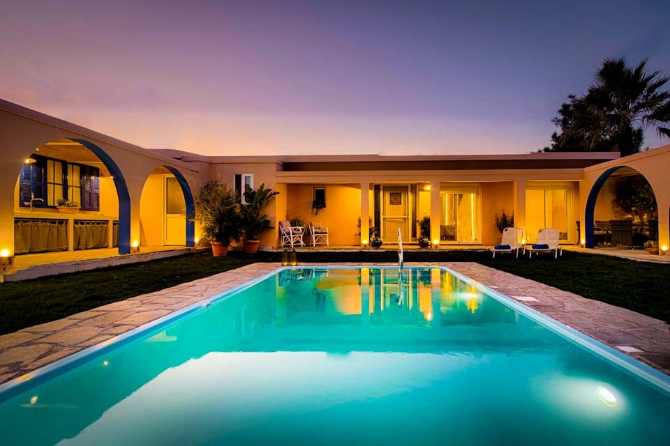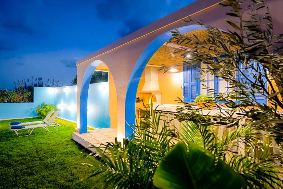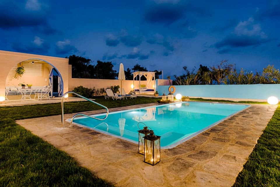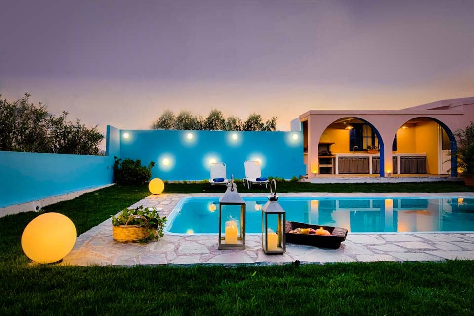 De buitenkant van de villa is gecentreerd rondom het uitnodigende privézwembad, dat omgeven is door gazon en talloze zitplekken om te ontspannen in de Griekse zon.