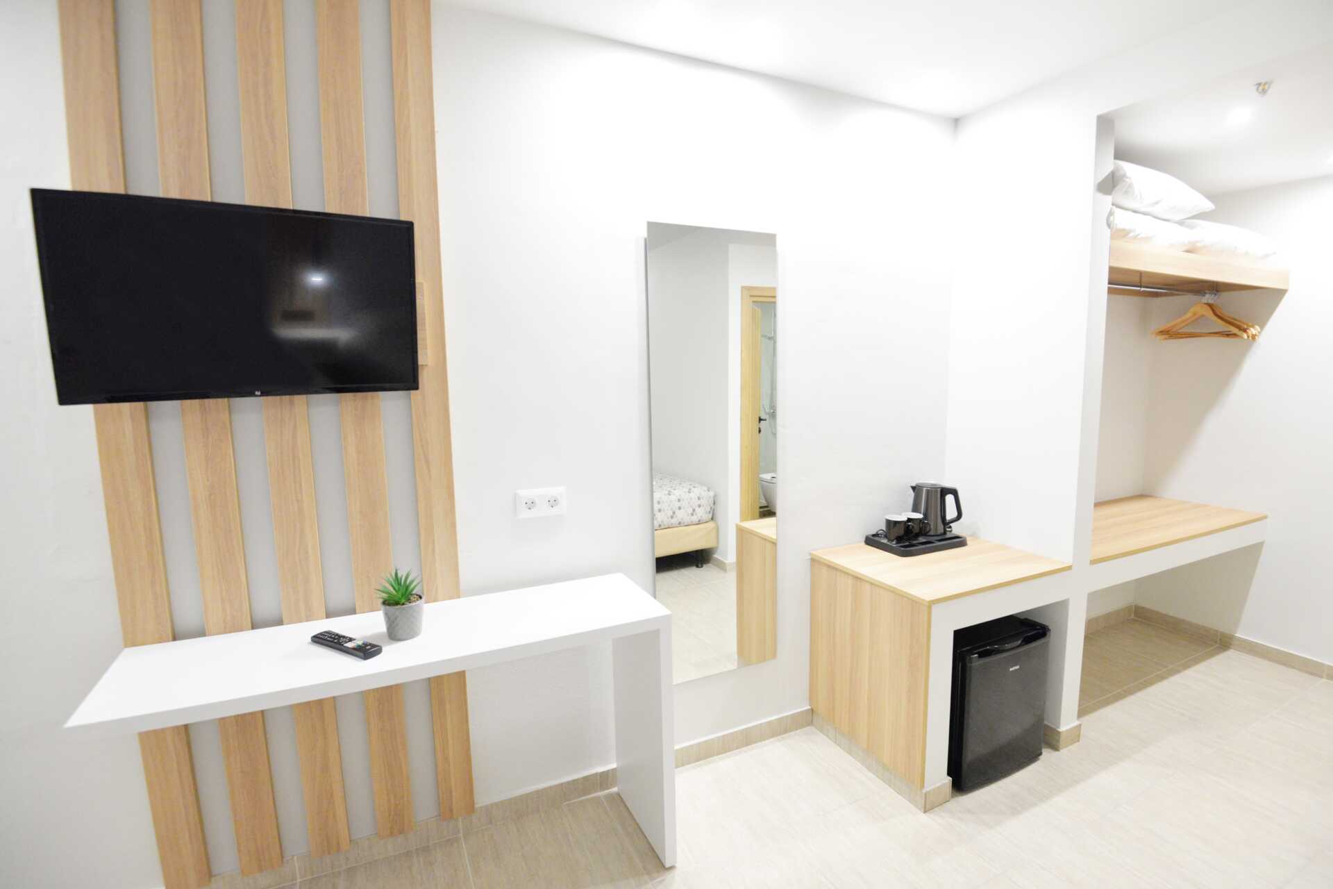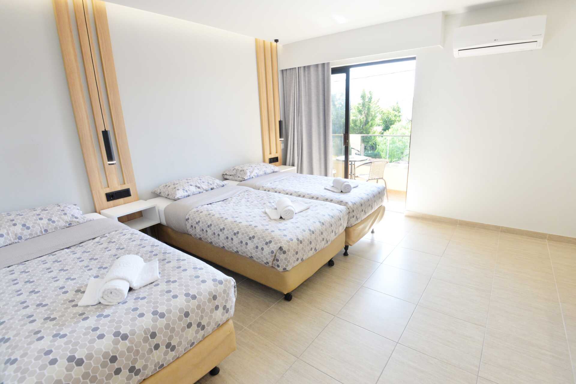 Gerenoveerde tweepersoonskamer met balkon. Een tweepersoonsbed of twee eenpersoonsbedden. Mogelijkheid voor een extra bed in een eenpersoonsbed. Wifi, airconditioning en kluisje inbegrepen. Koelkast. Waterkoker. Tv met lokale zenders. Föhn. Badkamer met douche en toilet. Schoonmaak 6 keer/week.