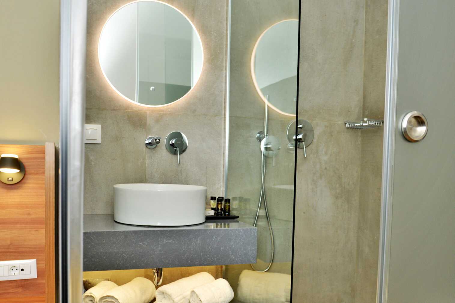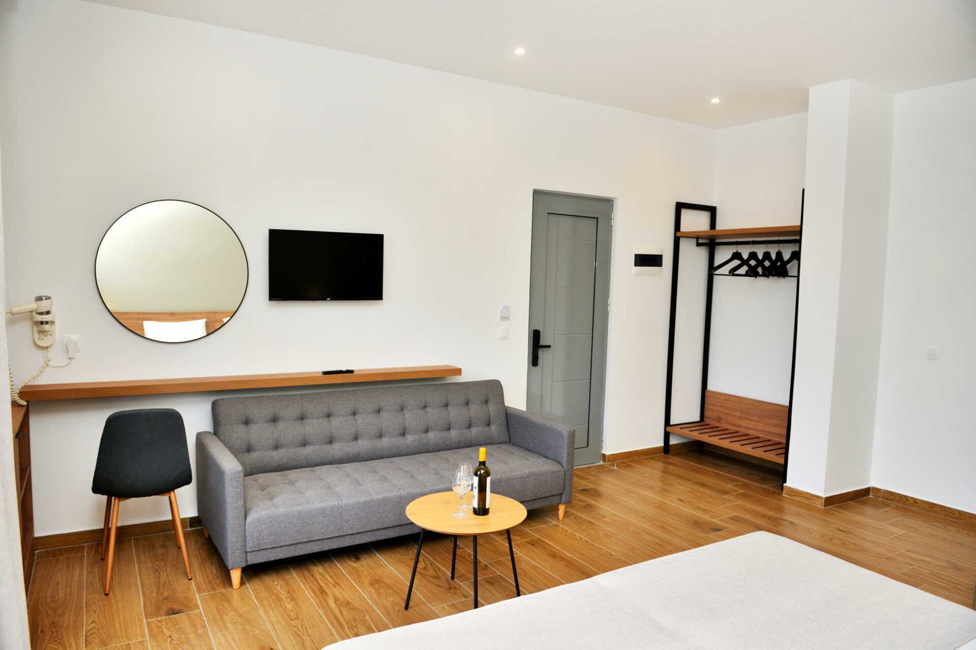 Superior kamer met terras op de begane grond en toegang tot gedeeld zwembad. De kamer kijkt uit op het zwembad aan de achterkant van het hotel. Twee eenpersoonsbedden of een tweepersoonsbed. Wifi, airconditioning en kluisje inbegrepen. Waterkoker. Tv met internationale zenders. Föhn. Glazen wand naar badkamer met bad of douche en toilet. Schoonmaak 5 keer/week.