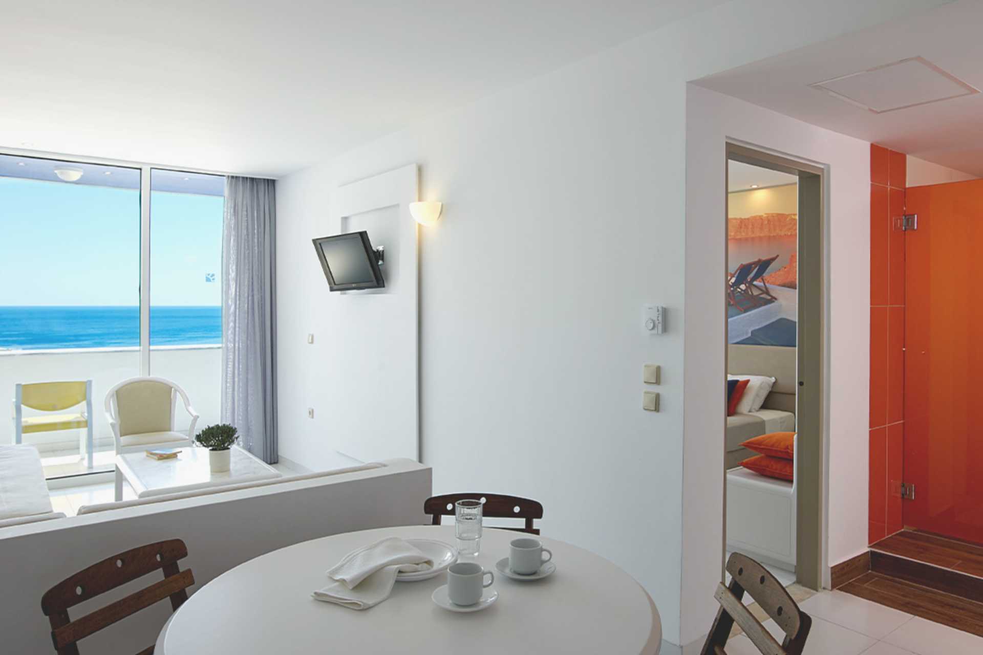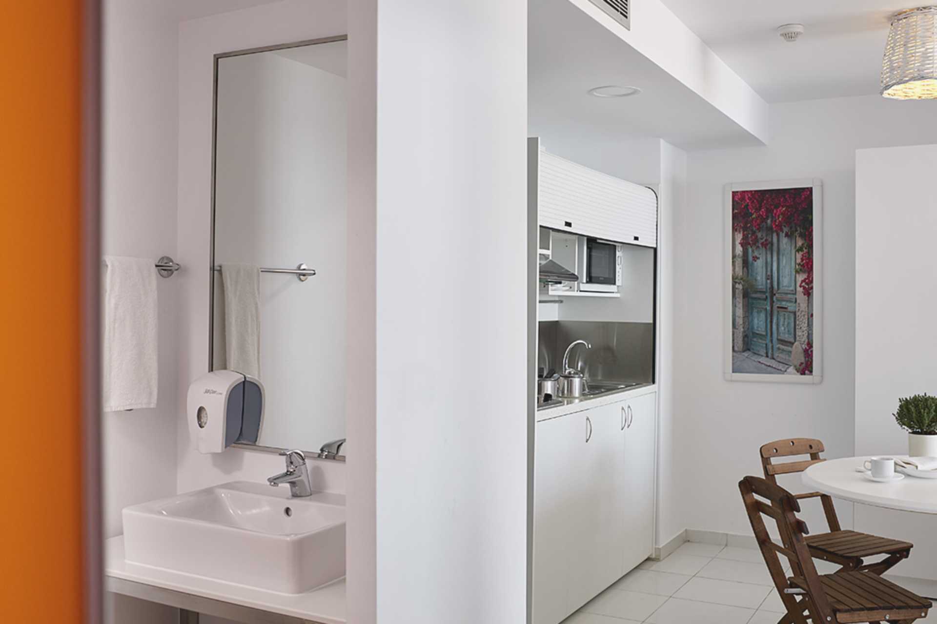 Tweekamerappartement met balkon, deels met zeezicht of beperkt zeezicht. Een slaapkamer en een gecombineerde woonkamer met kitchenette. Twee eenpersoonsbedden. Mogelijkheid voor extra bedden in slaapbank. Wifi, airconditioning (in de periode 1/6–15/9) en kluisje inbegrepen. Centrale airconditioning die in het appartement wordt geregeld. Minikeuken met koelkast, twee kookplaten, magnetron, waterkoker en basis keukenapparatuur. Tv met internationale zenders. Föhn. Badkamer met bad of douche en toilet. Schoonmaak 6 keer/week.