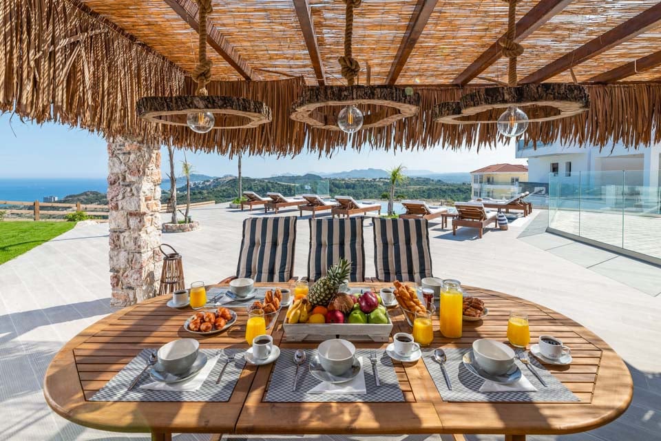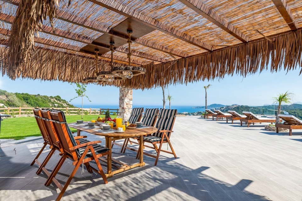 Buiten biedt deze villa een serene omgeving, omgeven door een panoramisch uitzicht op de zee en de bergen. Gelegen te midden van de ruige heuvels, wordt u verwelkomd met spectaculaire vergezichten zover het oog reikt, of u nu ontspant bij het zwembad of aan de rand van het overloopzwembad staat. Onder het schaduwrijke terras vindt u een eethoek in de buitenlucht, ideaal om te genieten van een ontbijt of een maaltijd bereid op de barbecue. Deze afgelegen tuin biedt u de mogelijkheid om moeiteloos te ontsnappen aan de drukte van het dagelijks leven.