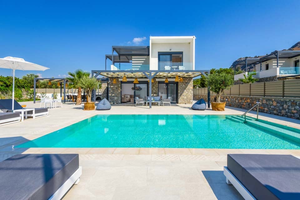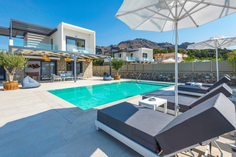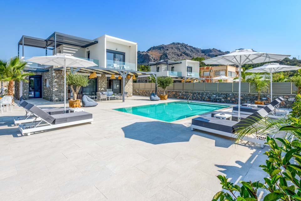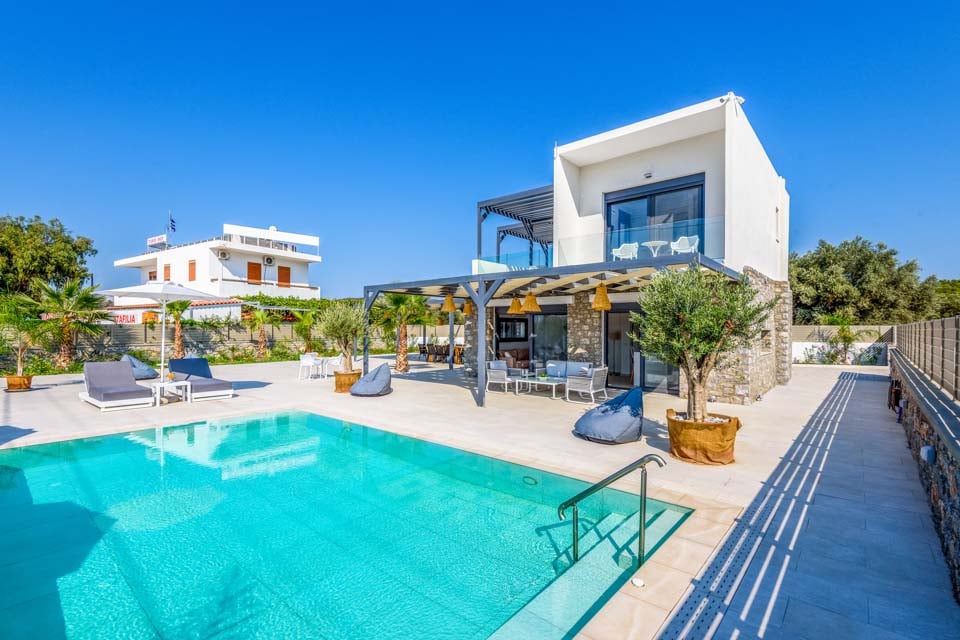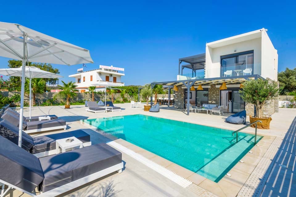 Deze villa beschikt over drie slaapkamers en twee badkamers en biedt plaats aan maximaal zeven gasten. Voor wie graag dicht bij vrienden wil verblijven of een uitgebreide familievakantie wil vieren, ligt deze accommodatie gunstig naast Villa Apollo Lindian Palms.
