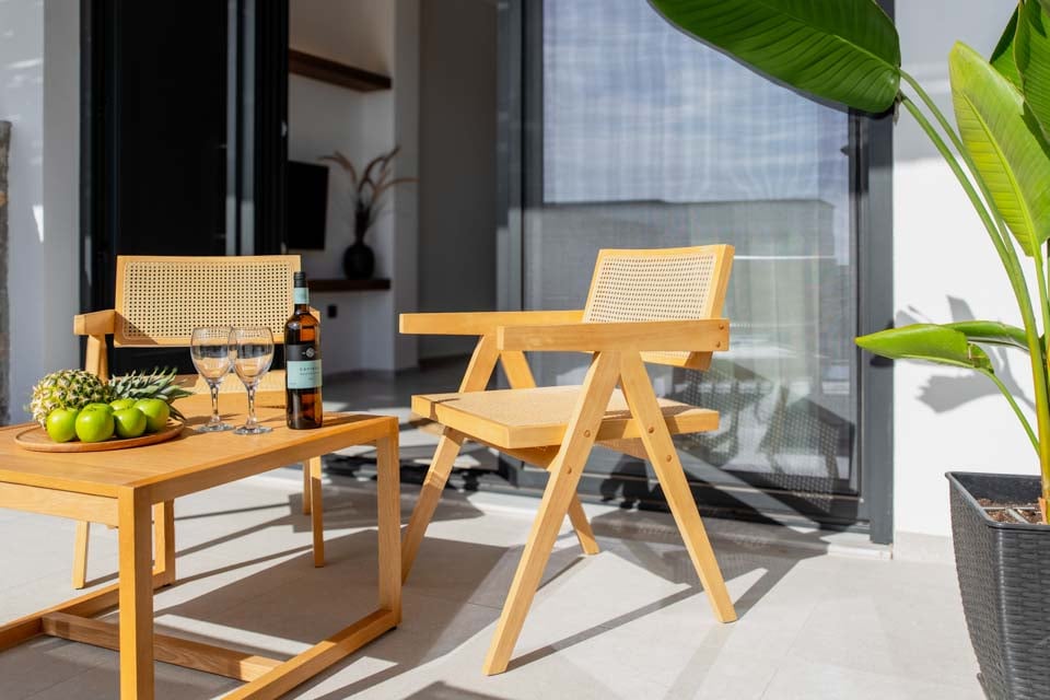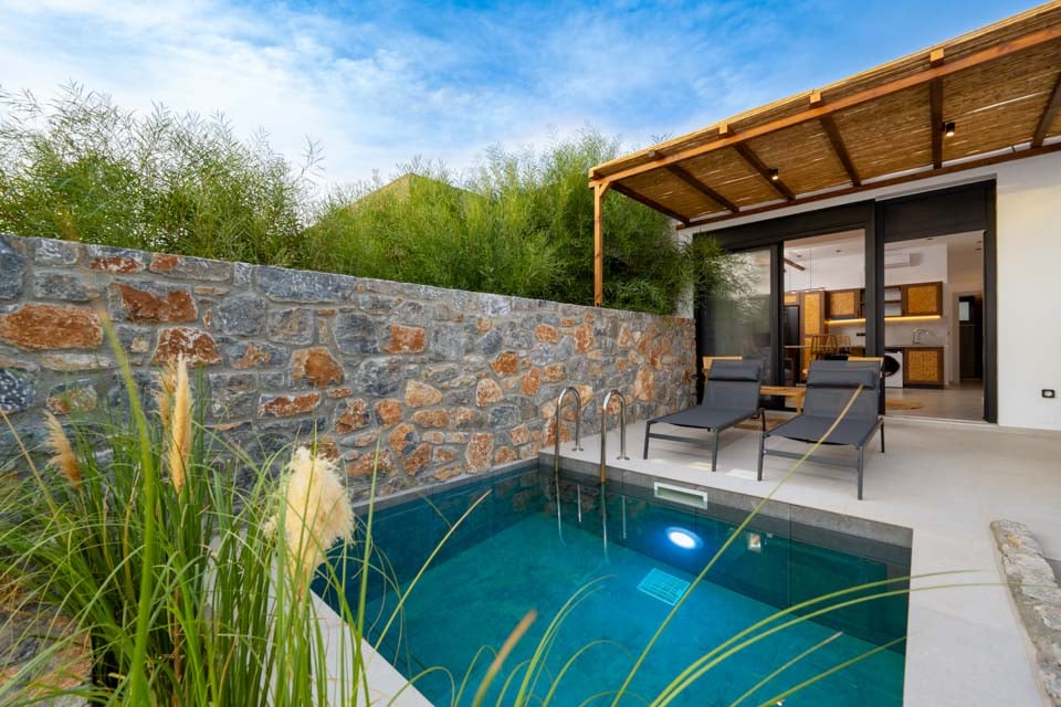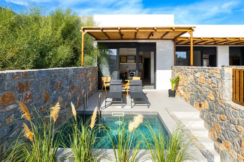 Buiten vind je je eigen dompelbad, met een afmeting van 2x2 meter een heerlijke plek om een duik te nemen en af te koelen in de middagzon. Deze villa is met liefde ontworpen en benut de ruimte binnen en buiten optimaal. Je vindt er je eigen bistroset in bohemienstijl voor je ochtendkoffie en voor ieder wat wils een ligstoel om van de zon te genieten en je kleurtje bij te werken.