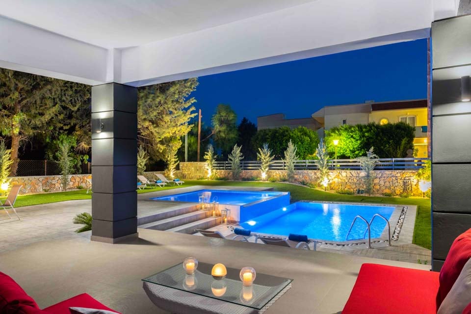 Een prachtige, moderne villa – een toplocatie op slechts een paar minuten lopen van winkels, restaurants en het strand van Lardos, maar toch afgelegen aan de rand van het dorp, omgeven door dennenbossen en volledig afgesloten voor optimale privacy.