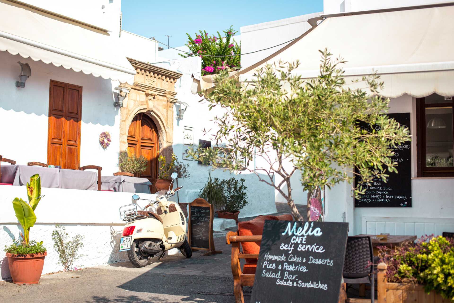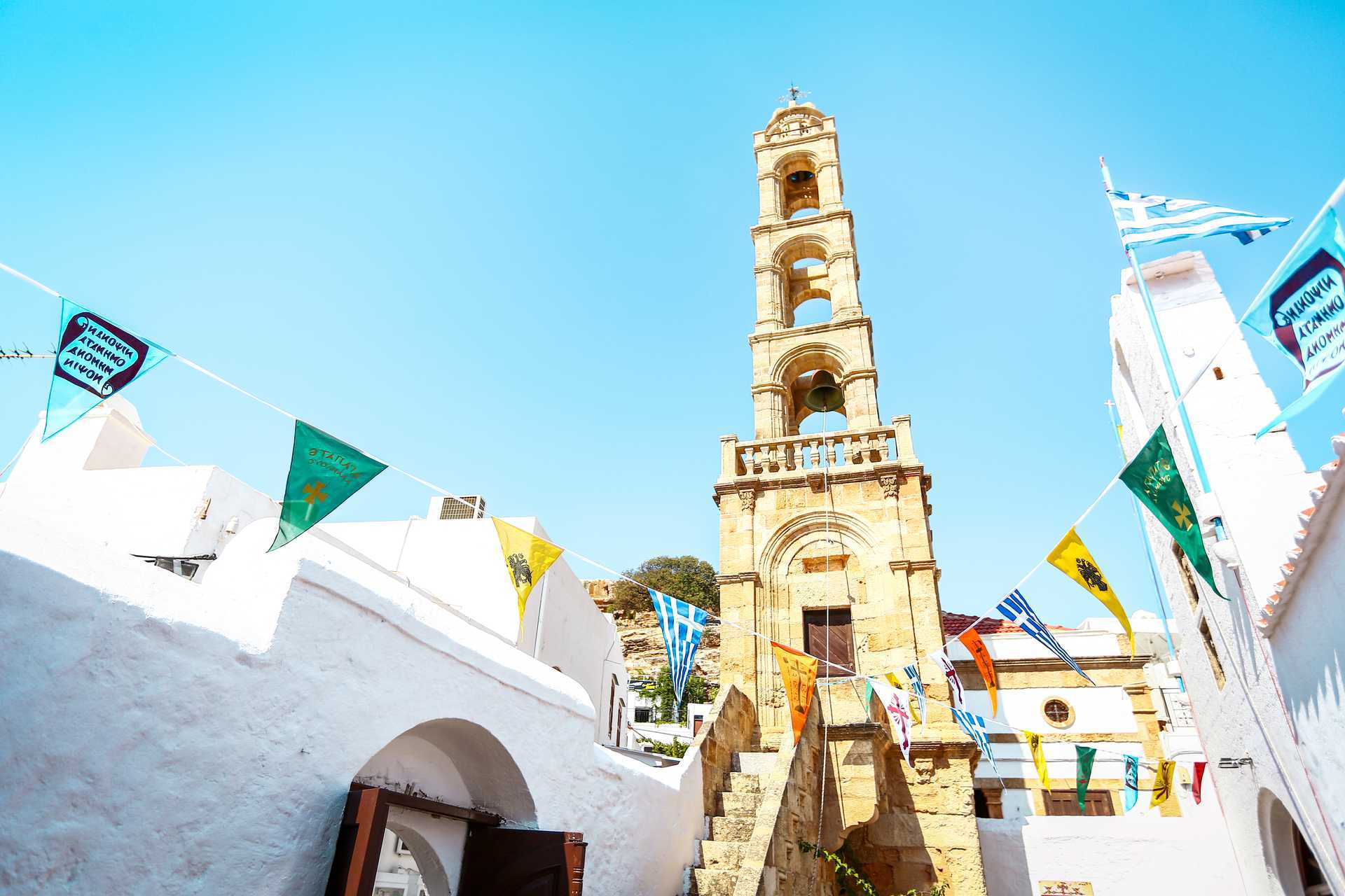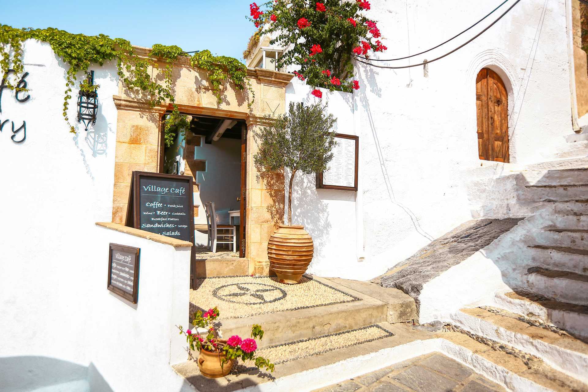Het is niet moeilijk om te zien waarom Lindos bekend staat als het 'witte dorp' - de witgekalkte huizen staan in smalle steegjes die tegen de heuvel omhoog slingeren. Het is een geweldige plek om rond te dwalen en misschien in een café te gaan zitten met een koel ijsje en te genieten van het prachtige uitzicht op zee.