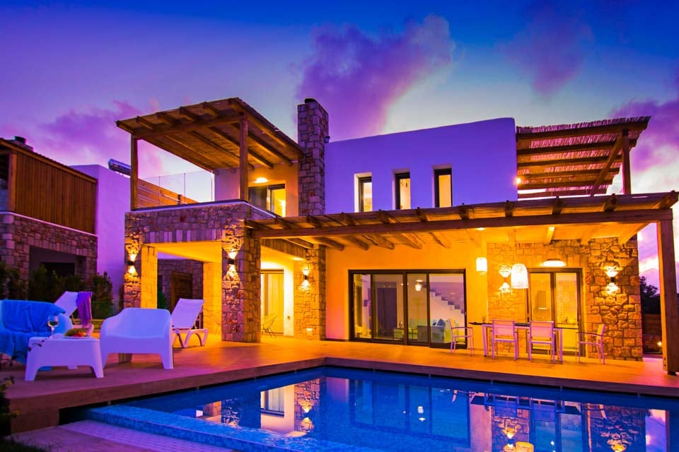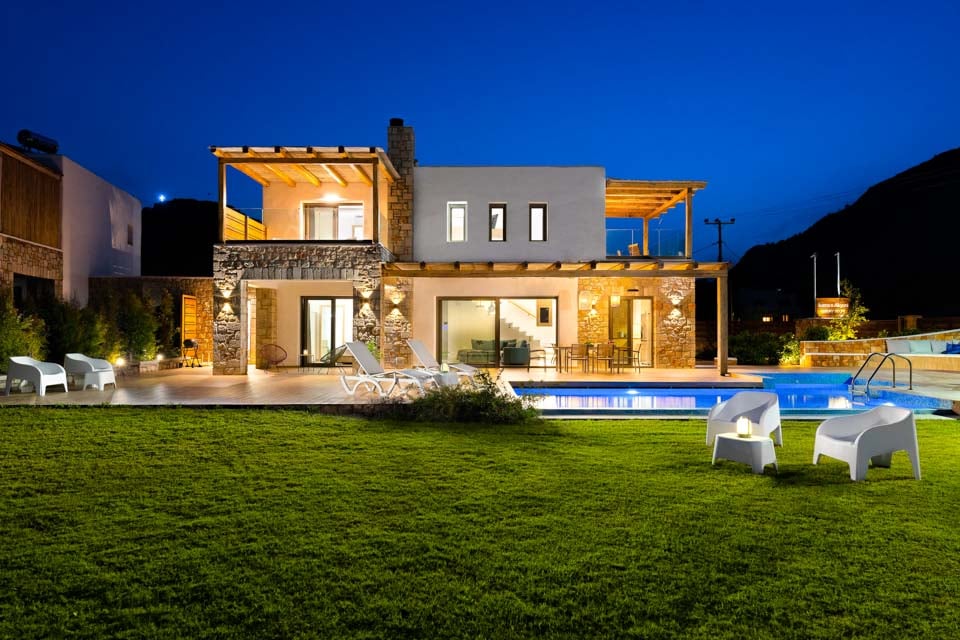 De villa is verdeeld over twee verdiepingen en biedt comfortabel plaats aan maximaal 6 personen. De begane grond bestaat uit 1 slaapkamer met airconditioning en eigen badkamer, een woonkamer met een comfortabele zithoek en een grote flatscreen-tv, een open, volledig uitgeruste keuken met eethoek en een gastentoilet. De woonkamer komt uit op een grote, gemeubileerde veranda met barbecuefaciliteiten, waar u kunt ontspannen en genieten van het prachtige uitzicht op de blauwe zee en de tuin. Hier vindt u tevens een groot, verwarmd privézwembad met jacuzzi, ligstoelen en parasols.
