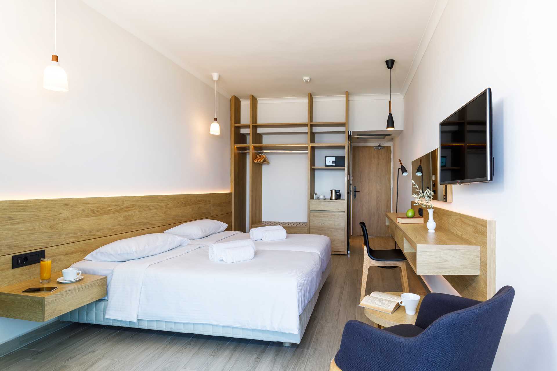 Tweepersoonskamer met balkon, sommige met zeezicht of beperkt zeezicht. De kamers bevinden zich op de eerste tot en met de derde verdieping. Twee eenpersoonsbedden. Wifi, kluisje en airconditioning van 20/5 tot 15/10 inbegrepen. Koelkast en waterkoker. Tv met internationale zenders. Föhn. Badkamer met douche en toilet. Schoonmaak 7 keer/week.