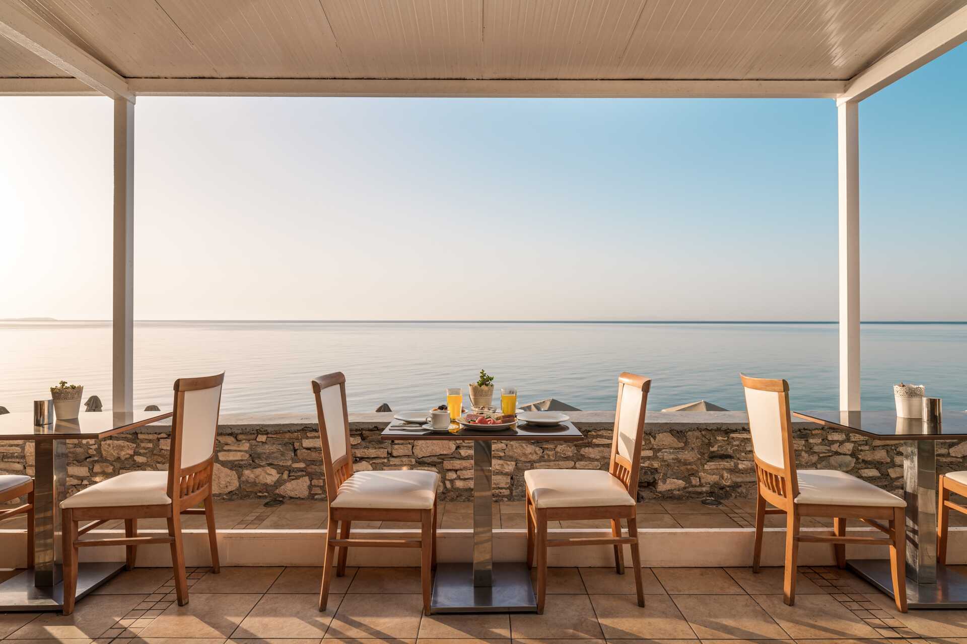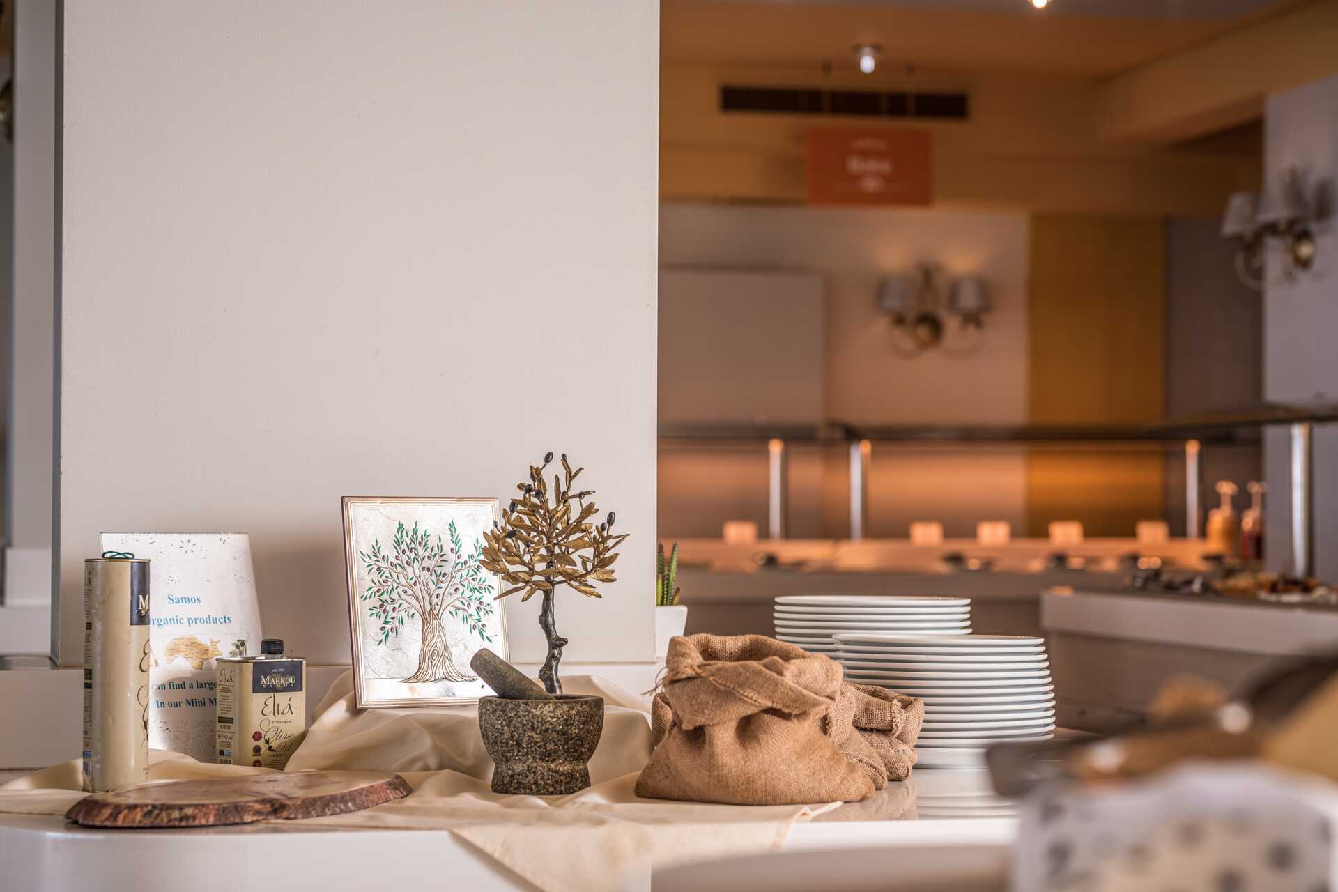Het buffetrestaurant van het hotel Samian Blue Seaside serveert ontbijt, lunch en diner met een prachtig uitzicht op zee. Pianobar en een bar op het strand waar koude drankjes worden geserveerd.