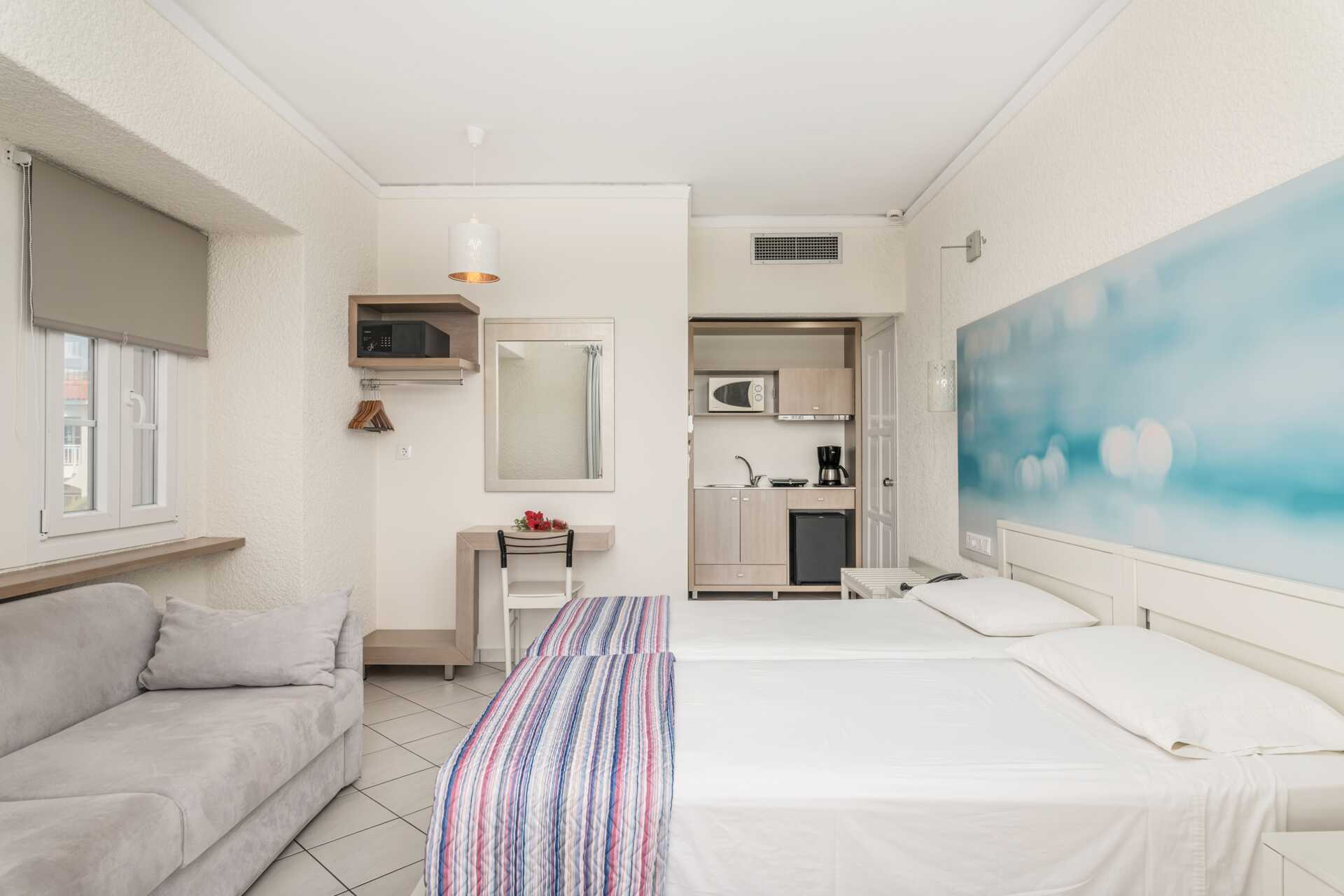 Studio met balkon of terras. Gecombineerde slaapkamer met kitchenette. Twee eenpersoonsbedden. Mogelijkheid voor een extra bed op de slaapbank. Minikeuken met kookplaten, koelkast, koffiezetapparaat, magnetron, broodrooster en basis keukenapparatuur. Wifi, airconditioning en kluis inbegrepen. TV met internationale zenders. Föhn. Badkamer met douche en wc. Schoonmaak 7 keer/week.