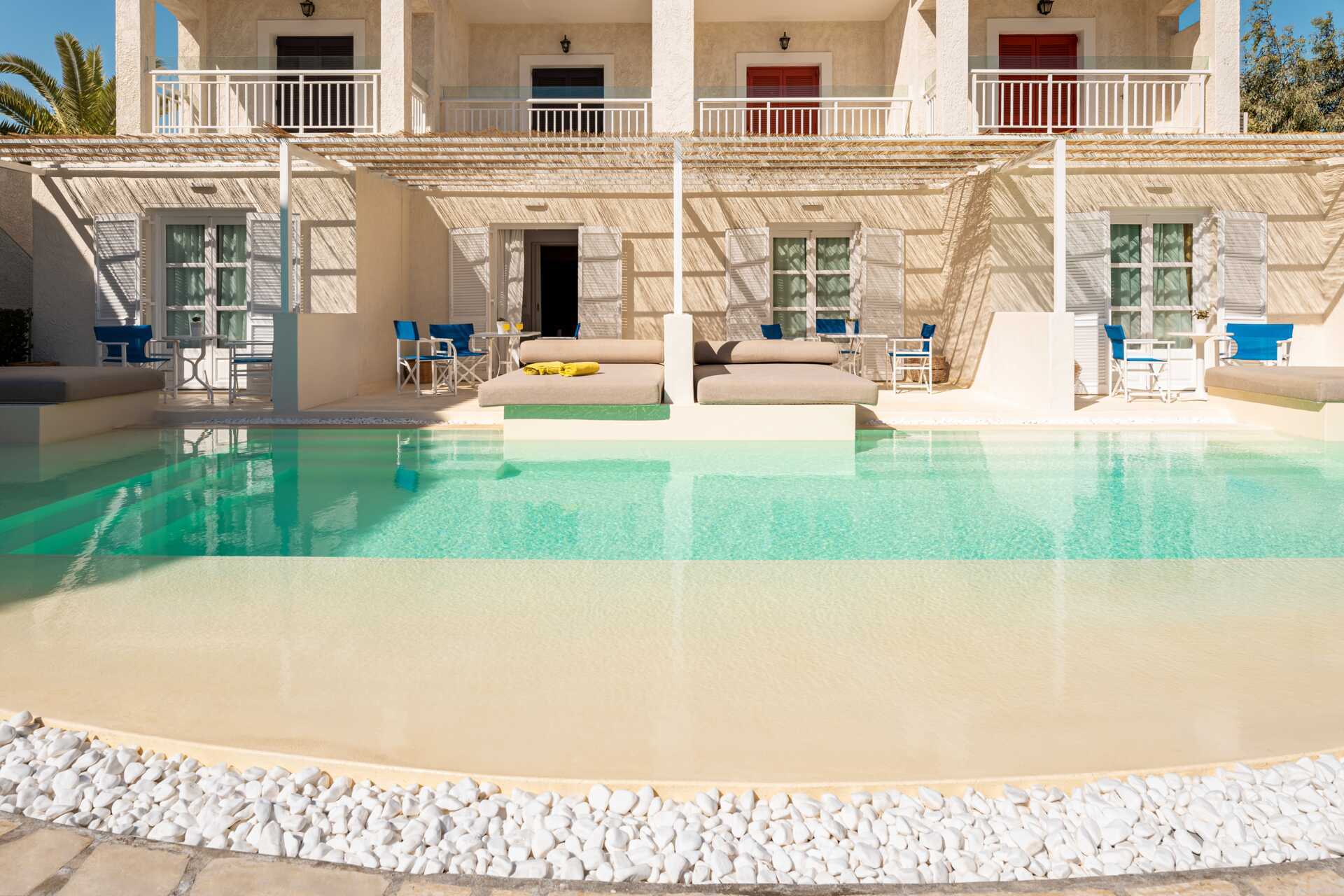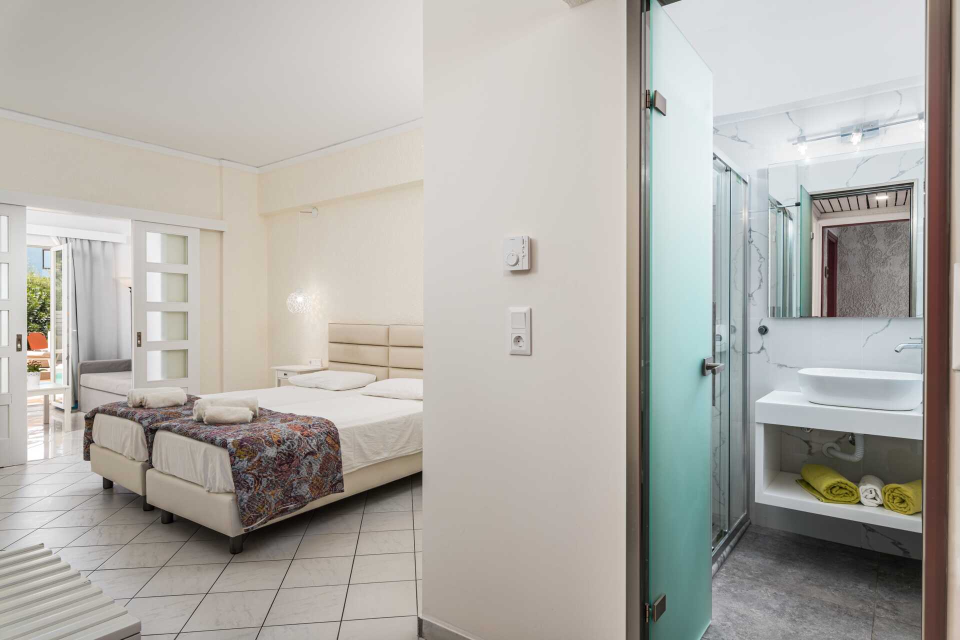 Tweekamerappartement met zwembadtoegang vanaf de patio. De minimumleeftijd voor dit kamertype is 16 jaar. Op het terras staat een comfortabele loungebank/bed en een tafel en stoelen. Trap naar beneden in het gemeenschappelijke zwembad. Gecombineerde slaapkamer en kitchenette, evenals een kleine woonkamer. Schuifdeuren tussen kamers. Twee eenpersoonsbedden. Mogelijkheid voor een extra bed op de slaapbank. Minikeuken met kookplaten, koelkast, koffiezetapparaat, magnetron, broodrooster en basis keukenapparatuur. Wifi, airconditioning en kluis inbegrepen. TV met internationale zenders. Föhn. Badkamer met douche en wc. Schoonmaak 7 keer/week.