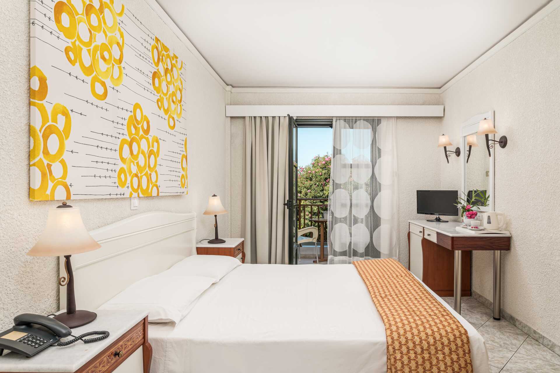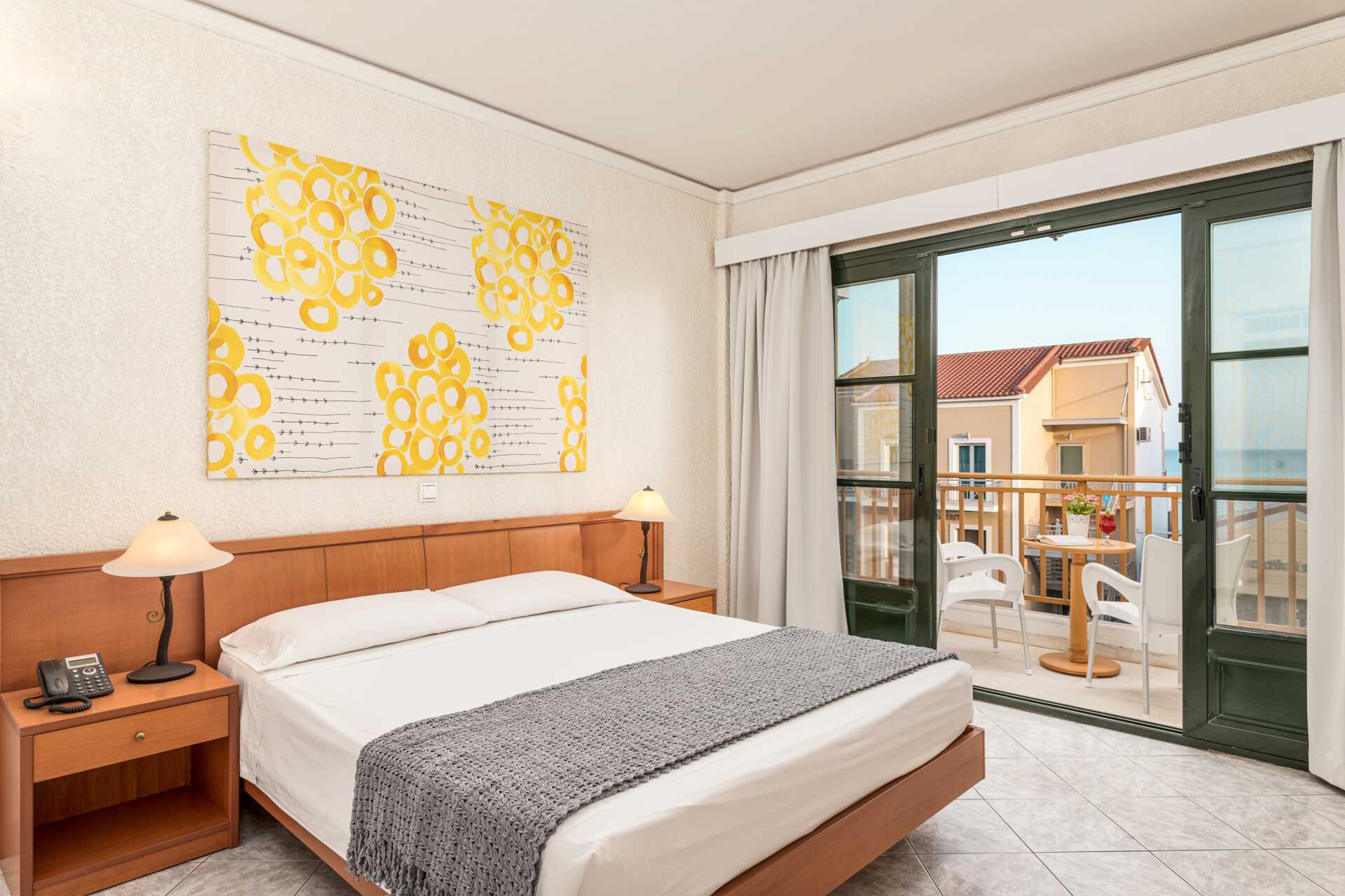 Tweepersoonskamer, voorzijde, met balkon en uitzicht op zee. De minimumleeftijd voor dit kamertype is 16 jaar. Een tweepersoonsbed. Wifi, airconditioning en kluis inbegrepen. Koelkast. TV met internationale zenders. Badjassen en slippers Föhn. Badkamer met douche en wc. Schoonmaak 7 keer/week.
