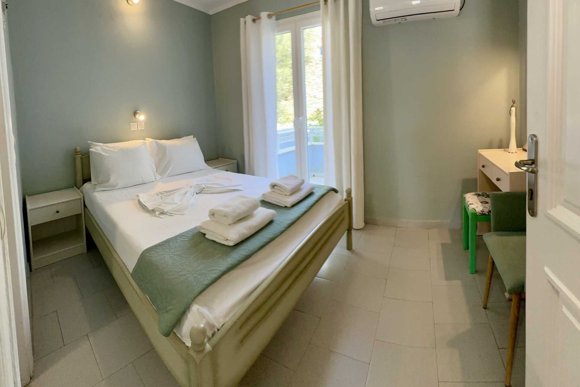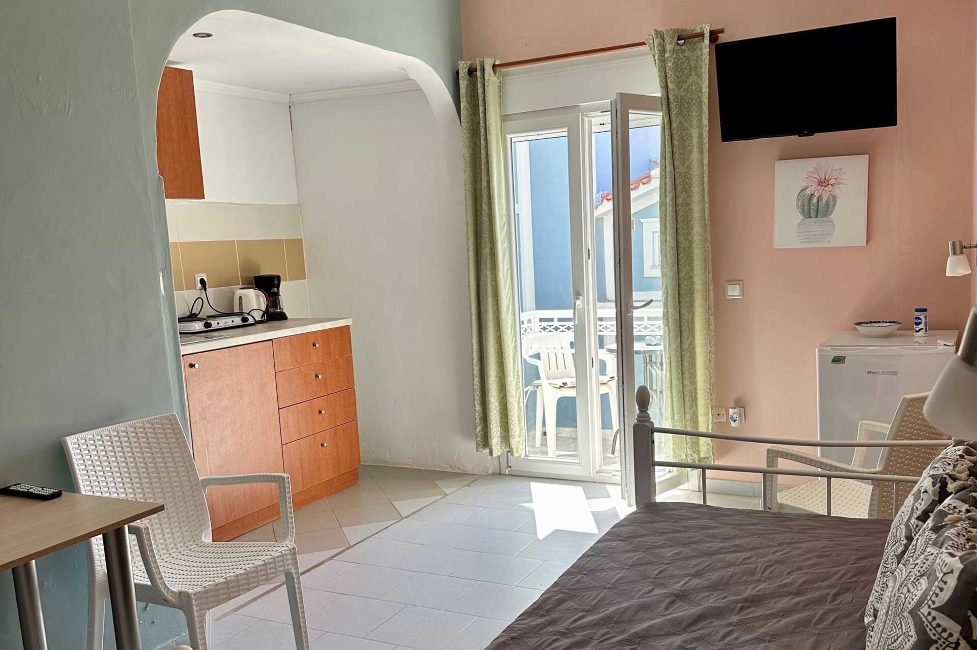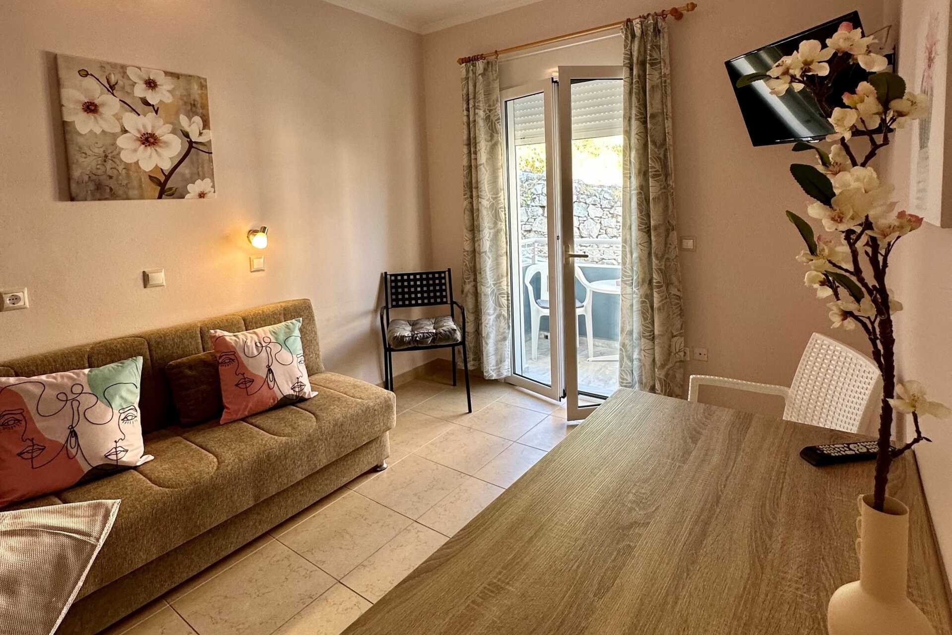 Tweekamerappartement met balkon of terras. Een slaapkamer en een gecombineerde woonkamer met kitchenette. Een tweepersoonsbed. Mogelijkheid tot extra bedden in slaapbank of eenpersoonsbed. Minikeuken met kookplaten, koelkast met vriesvak, magnetron, koffiezetapparaat, waterkoker, broodrooster en eenvoudige keukenapparatuur. Gratis wifi en airconditioning in de slaapkamer. Kluisje tegen betaling. Badkamer met smalle douchecabine en toilet. Schoonmaak 6 keer/week.