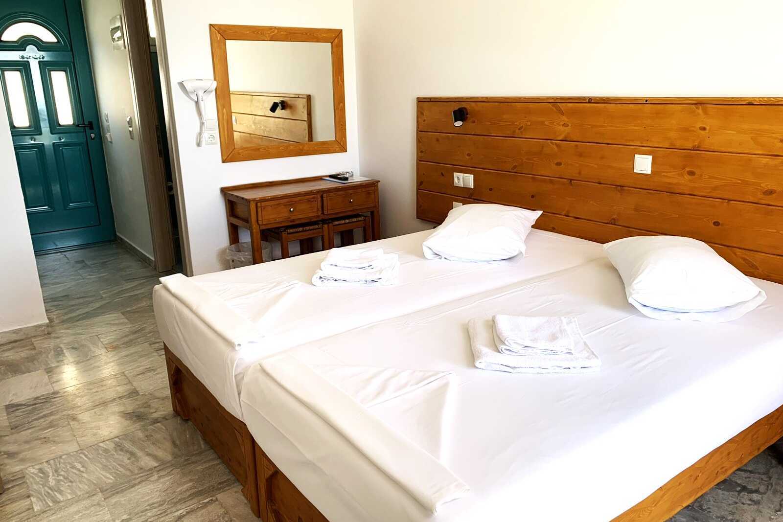 Gerenoveerde tweepersoonskamers met terras op de begane grond en beperkt uitzicht op zee. De kamers zijn vernieuwd voor de zomer van 2025, met onder andere nieuwe bedden. Twee eenpersoonsbedden. In sommige kamers is er de mogelijkheid voor een extra bed. Wifi en airconditioning inbegrepen. Kluisje tegen betaling. Koelkast. Tv met lokale zenders. Badkamer met douche en toilet. Schoonmaak 6 keer/week. Kinderen jonger dan twee jaar zijn inbegrepen in het maximale aantal personen in de kamer.