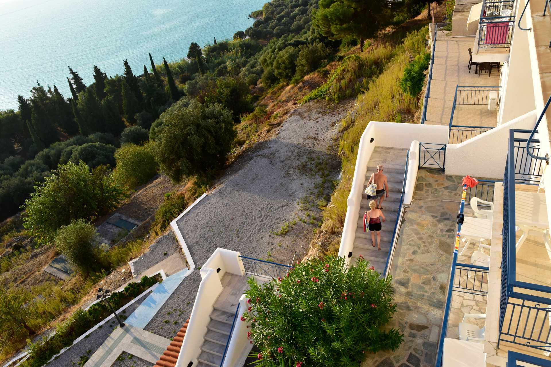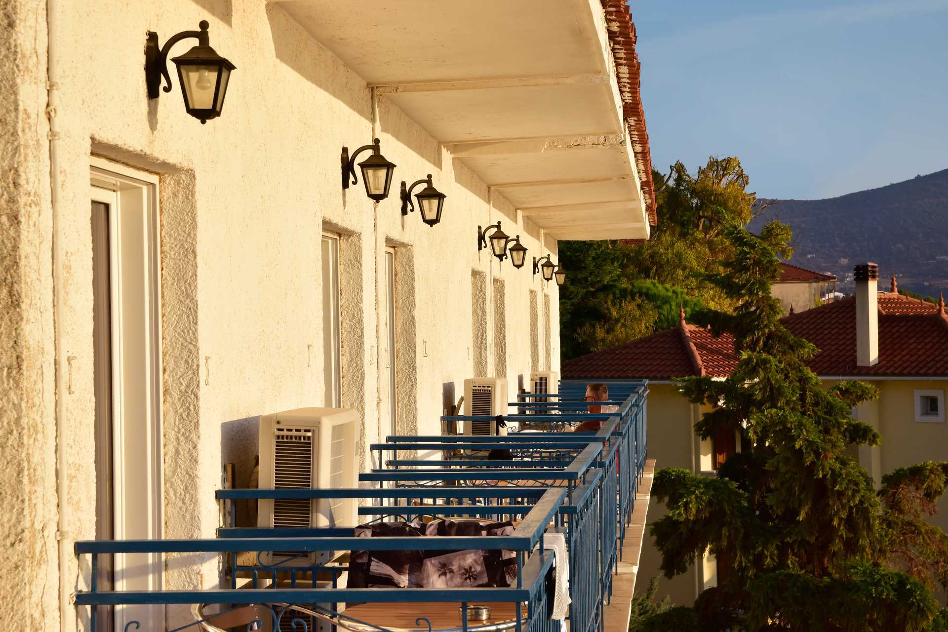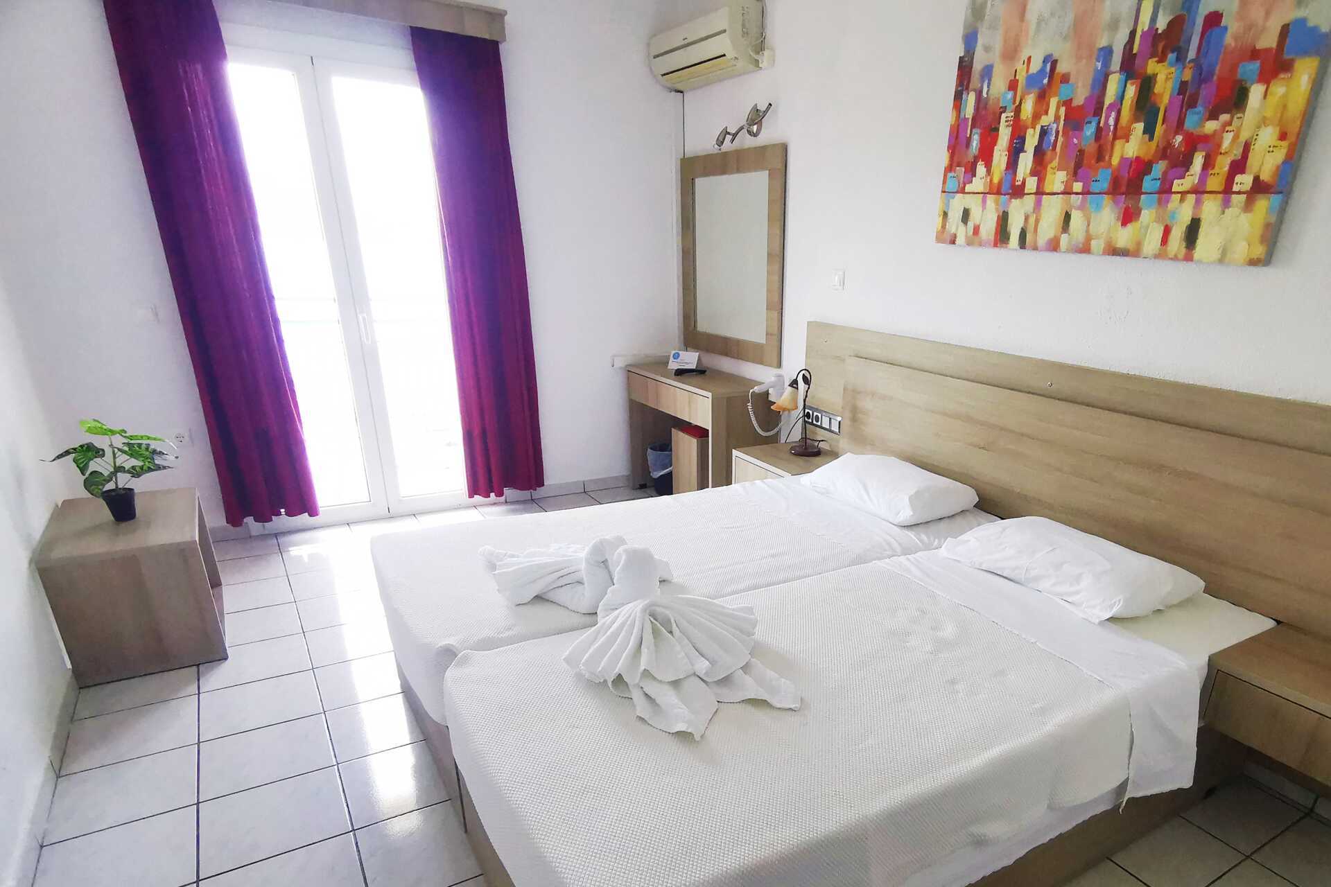 Tweepersoonskamer met balkon en uitzicht op zee. Twee eenpersoonsbedden. Mogelijkheid voor extra bedden in opklapbedden of op een slaapbank. Houd er rekening mee dat wanneer het extra bed wordt gebruikt, de kamer krap wordt. Wifi inbegrepen. Airconditioning tegen betaling. TV met internationale zenders. Koelkast. Föhn. Badkamer met douche en wc. Schoonmaak 6 keer/week.