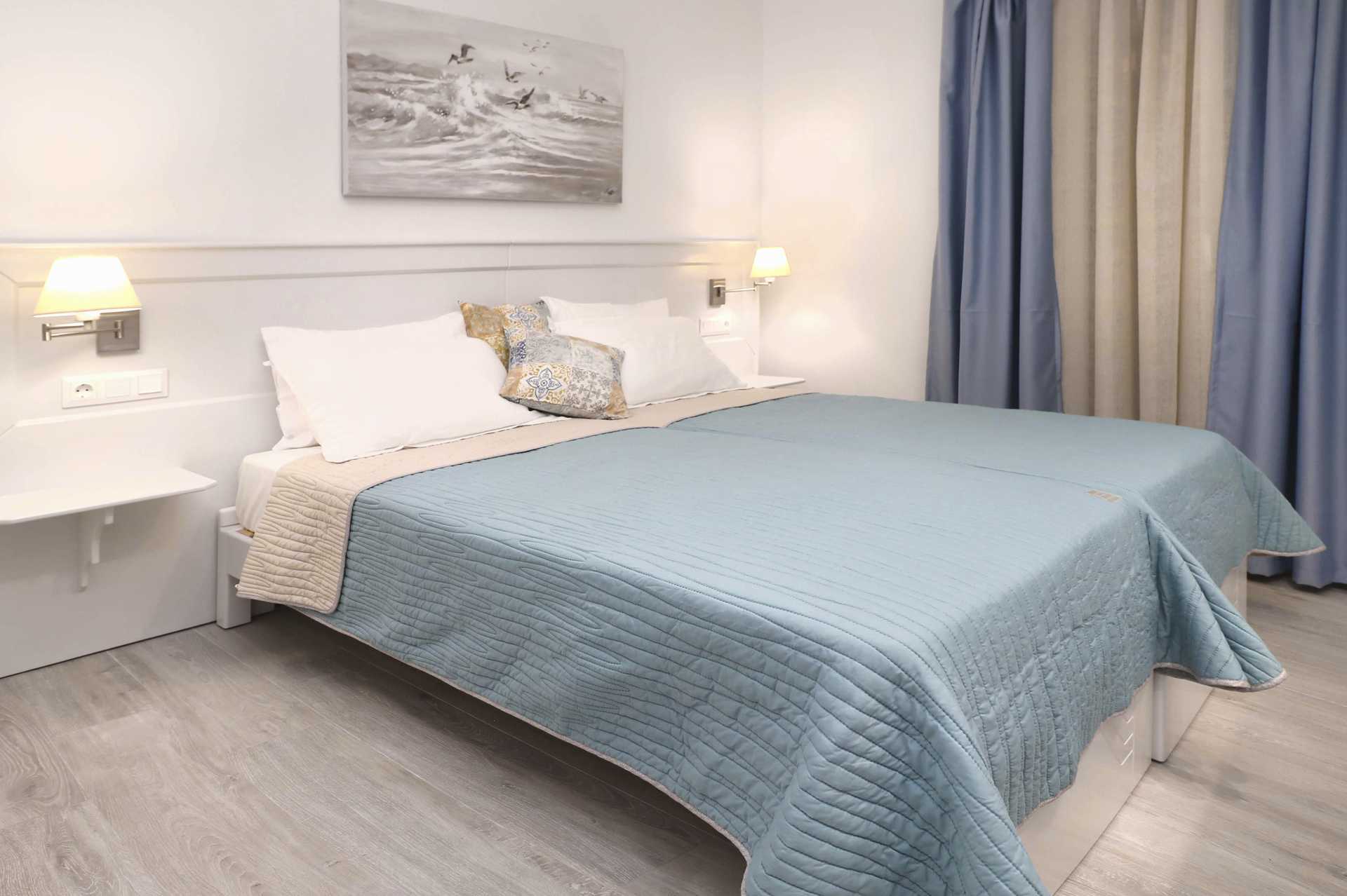 Driekamerappartement met gedeelde patio met zeezicht of terras met beperkt zeezicht. Twee slaapkamers en een gecombineerde woonkamer/minikeuken. Een tweepersoonsbed of twee aparte bedden in elke slaapkamer. Minikeuken met kookplaat, koelkast, koffiezetapparaat, waterkoker, broodrooster en eenvoudig keukengerei. Wifi, Kluisje en airconditioning inbegrepen. Föhn. Badkamer met bad of douche en toilet. Schoonmaak 6 keer/week.