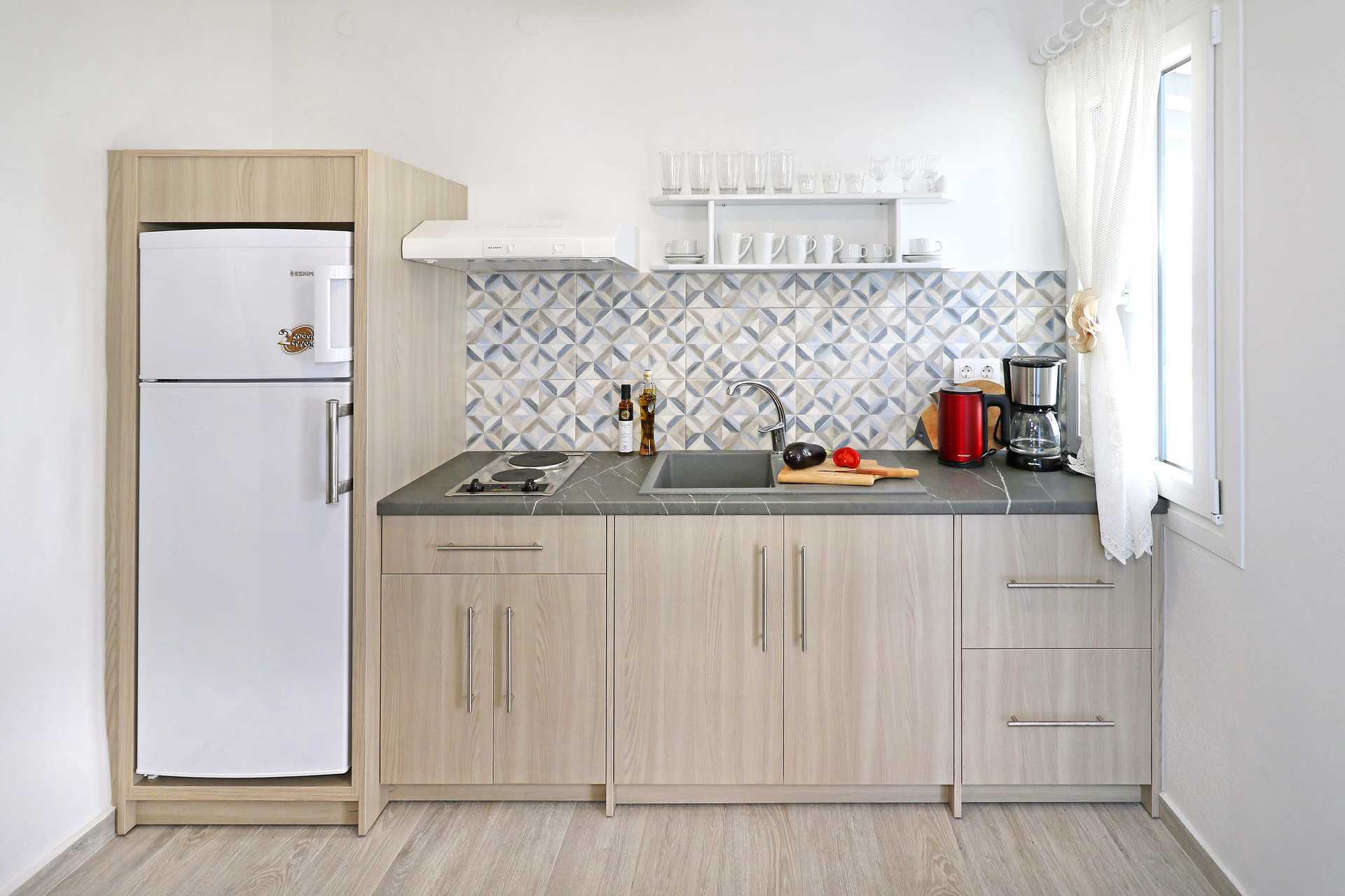 Studio met gedeelde patio met zeezicht of terras met beperkt zeezicht. Slaapkamer gecombineerd met minikeuken. Eén tweepersoonsbed of twee eenpersoonsbedden. Minikeuken met kookplaat, koelkast, koffiezetapparaat, waterkoker, broodrooster en eenvoudig keukengerei. Wifi, kluisje en airconditioning inbegrepen. Föhn. Badkamer met bad of douche en toilet. Schoonmaak 6 keer/week.
