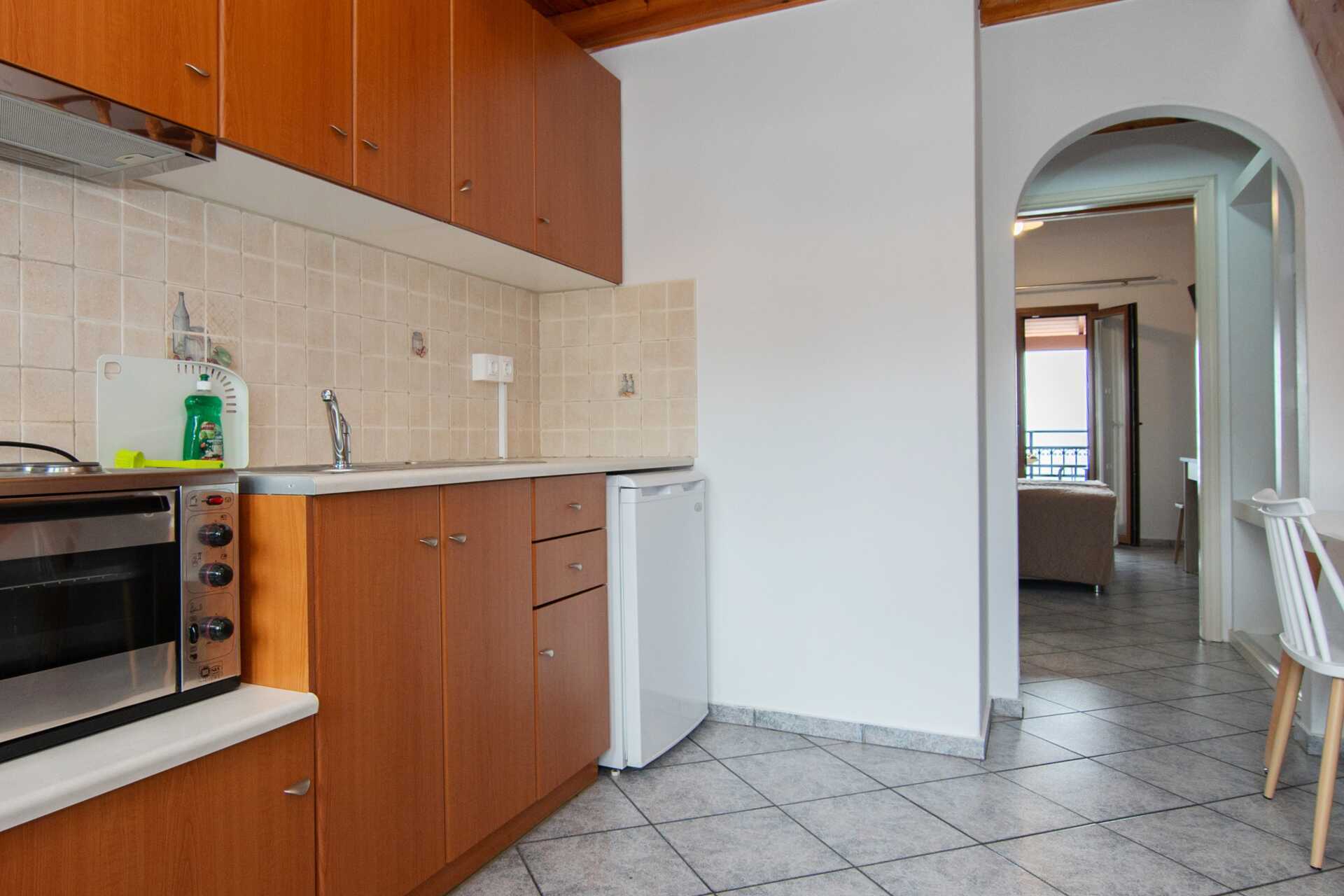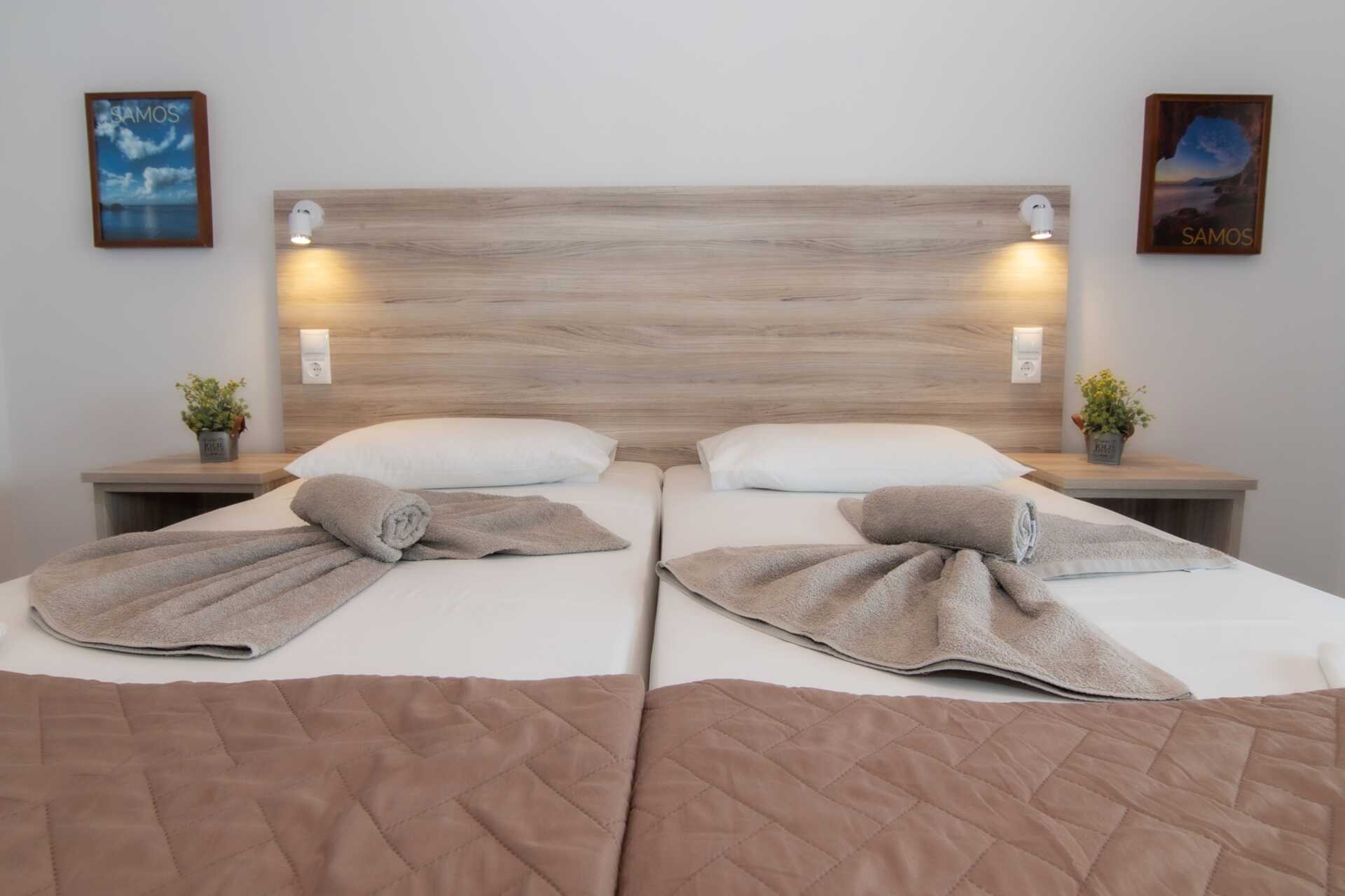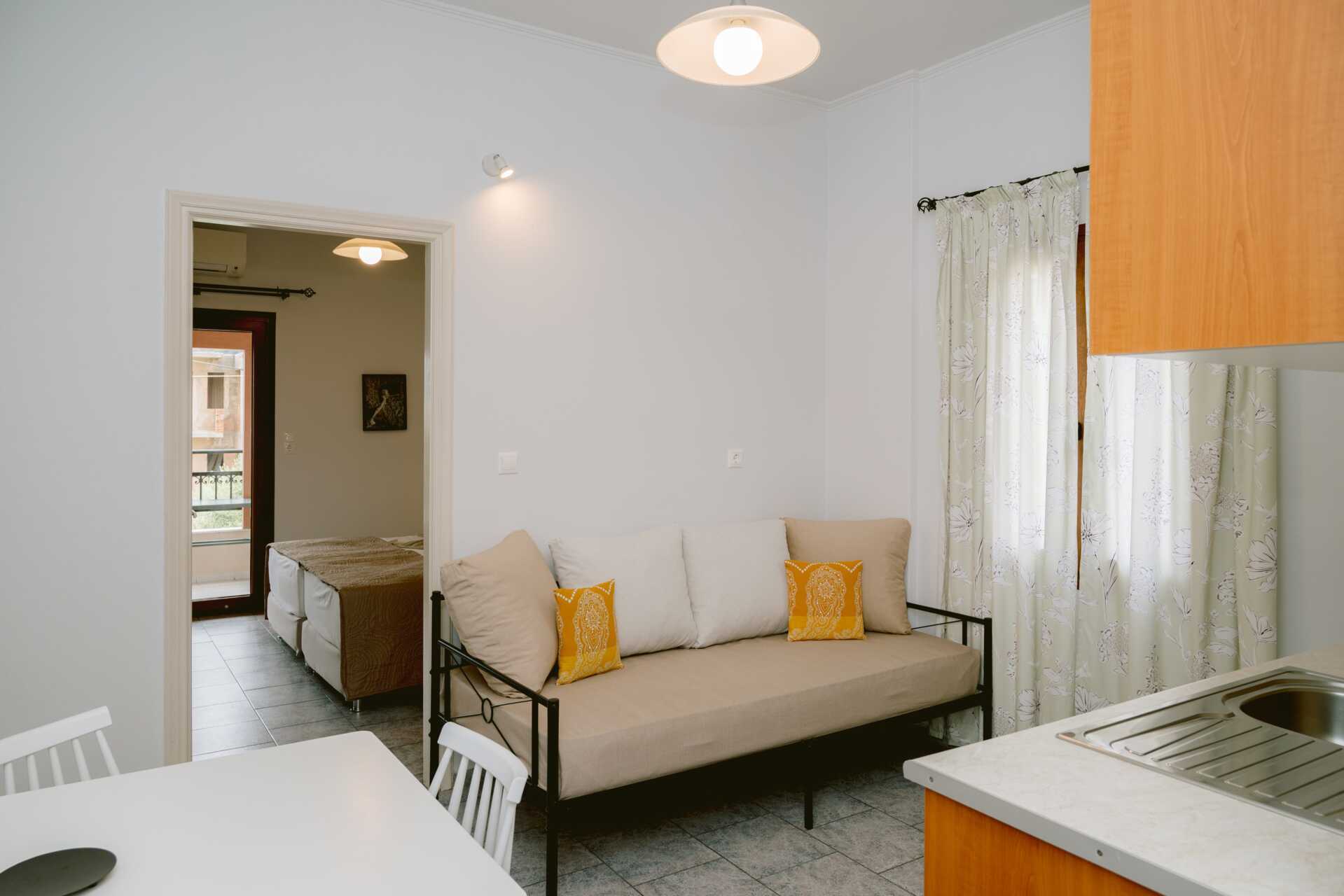 Tweekamerappartement met balkon en uitzicht op zee. Een slaapkamer en een woonkamer gecombineerd met een minikeuken. Een tweepersoonsbed of twee eenpersoonsbedden. Mogelijkheid voor extra bedden in de slaapbank. Minikeuken met kookplaten, koelkast, koffiezetapparaat en basis keukenfaciliteiten. TV met lokale zenders. Wifi, airconditioning en kluisje inbegrepen. Badkamer met douche en toilet. Schoonmaak 6 keer/week.