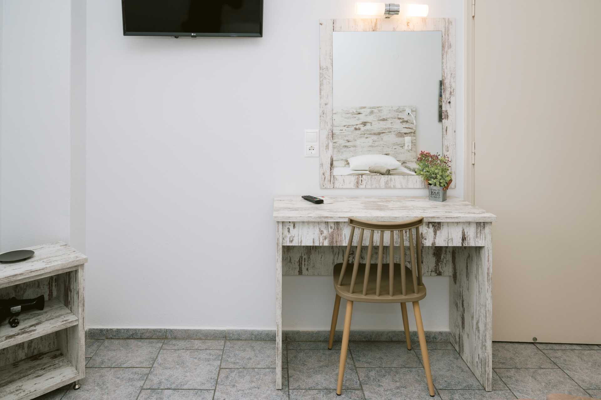 Studio met balkon. Slaapkamer gecombineerd met een mini-keuken. Een tweepersoonsbed of twee eenpersoonsbedden. Mogelijkheid voor extra bed in eenpersoonsbed. Minikeuken met kookplaten, koelkast, koffiezetapparaat en basiskeukengerei. Wifi, airconditioning en kluisje inbegrepen. Tv met lokale zenders. Badkamer met douche en toilet. Schoonmaak 6 keer/week.
