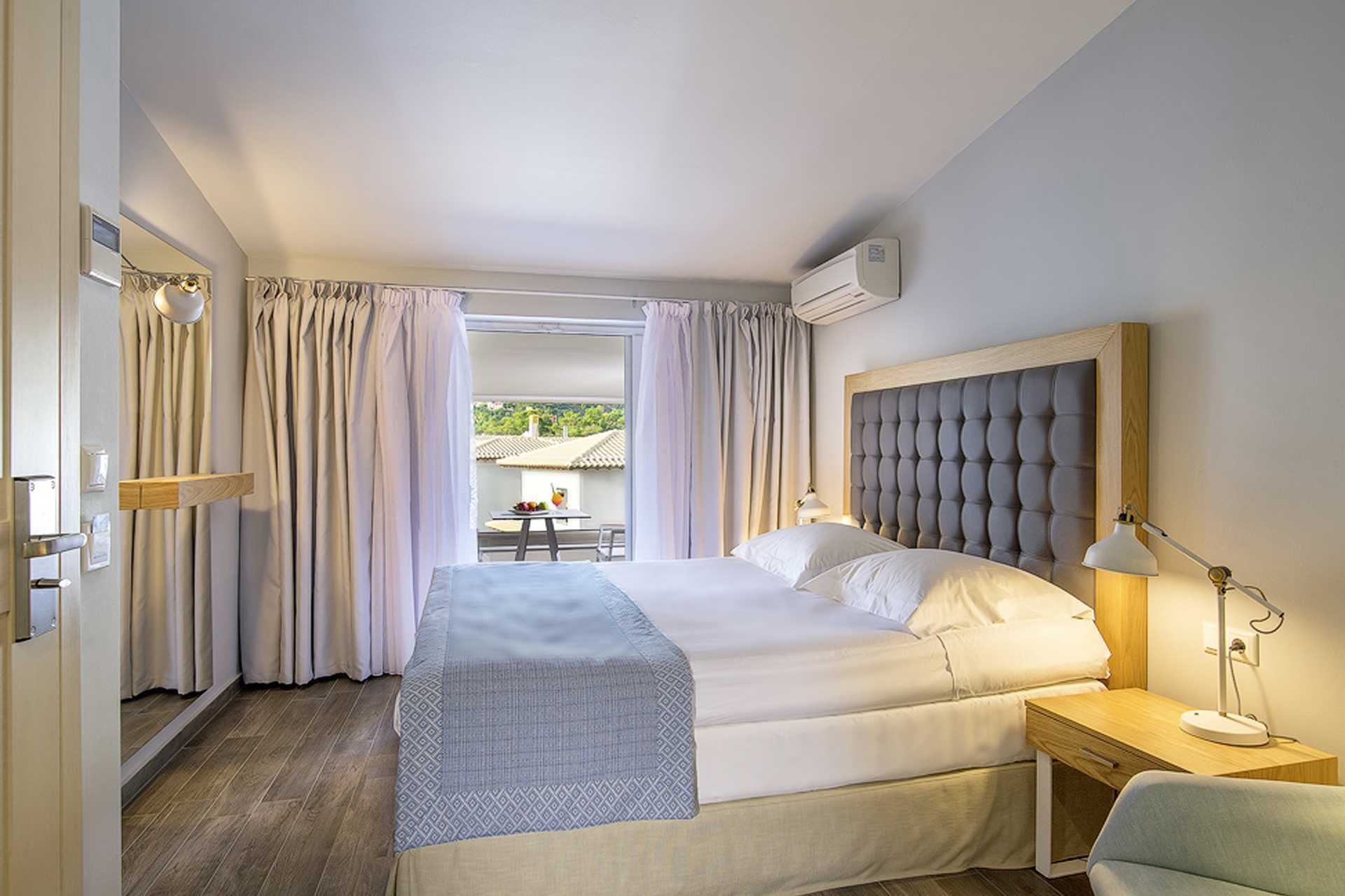 Tweepersoonskamer met balkon of grondterras. Eén tweepersoonsbed. Mogelijkheid voor extra bed in éénpersoonsbed. Wifi en kluisje inbegrepen. Airconditioning tegen betaling. Koelkast. Tv met internationale zenders. Föhn. Kleine badkamers met douche en toilet. Schoonmaak 7 keer / week.