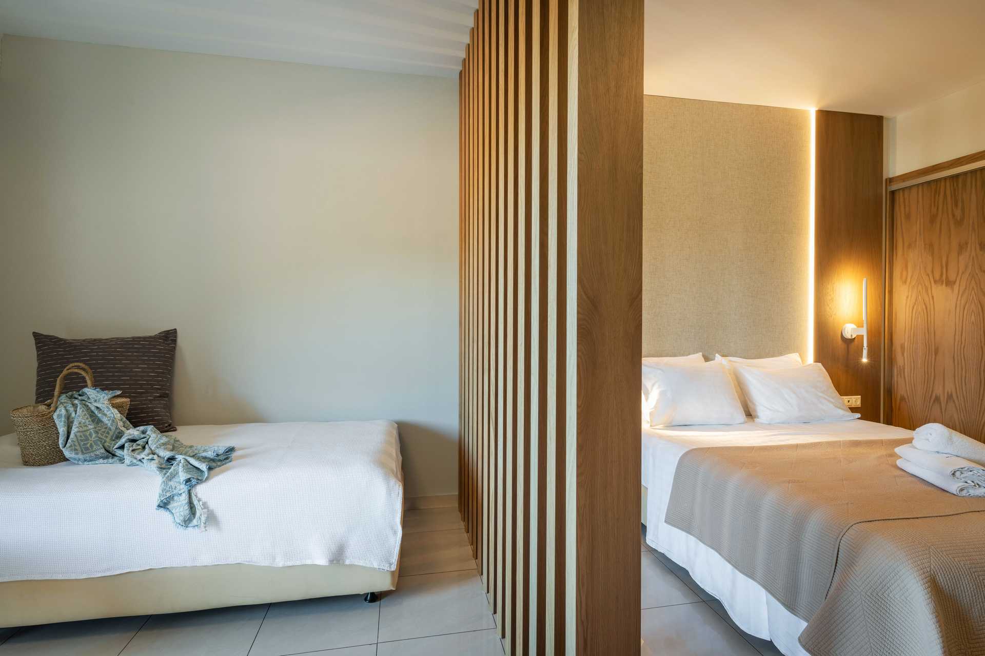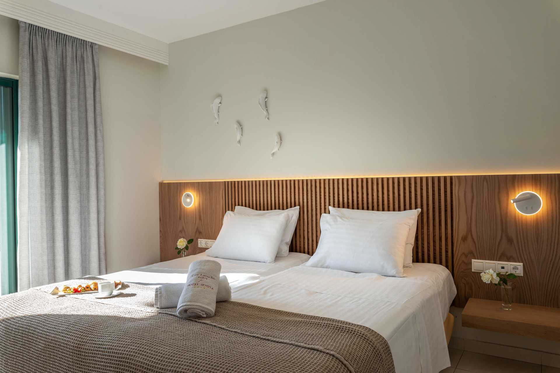 Deluxe kamer met balkon. Twee eenpersoonsbedden. Mogelijkheid voor een extra bed op de slaapbank. Wifi, airconditioning en kluisje inbegrepen. Koelkast. Tv met internationale zenders. Föhn. Badkamer met douche en toilet. Schoonmaak 7 keer/week.
