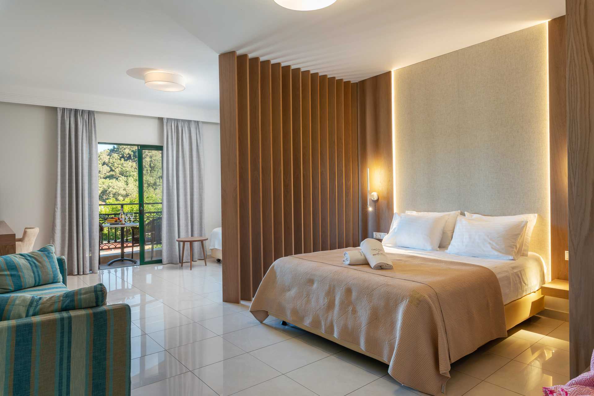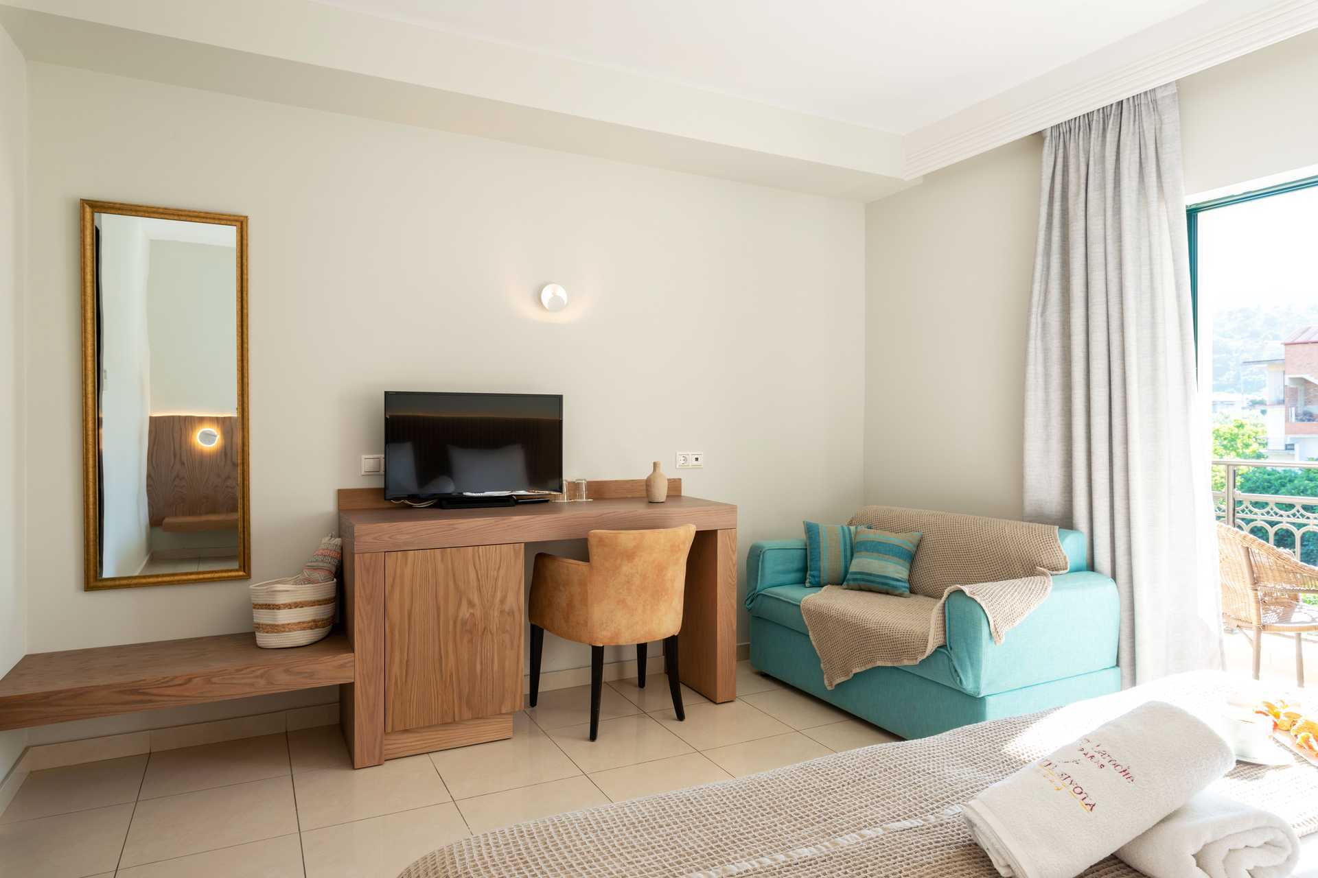 Deluxe familiekamer met balkon. De familiekamer bestaat uit een slaapkamer en een woonkamer. Een tweepersoonsbed. Mogelijkheid voor een extra bed op de slaapbank. Wifi, airconditioning en kluisje inbegrepen. Koelkast. Tv met internationale zenders. Föhn. Badkamer met douche en toilet. Schoonmaak 7 keer/week.
