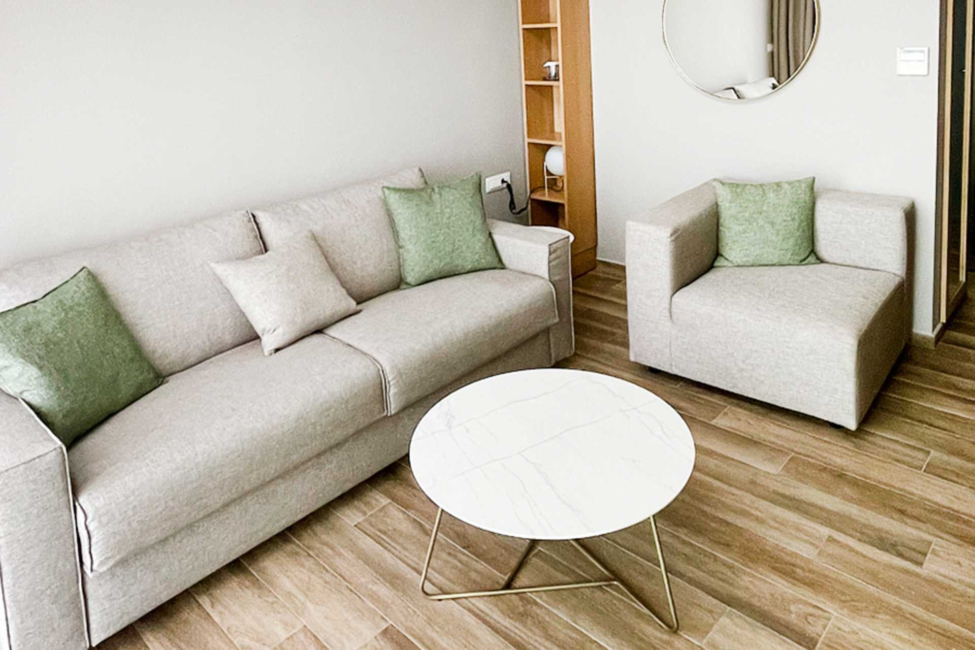 Tweepersoonskamer met balkon aan zee. Het slaapcomfort is hoog met een comfortabel tweepersoonsbed en beddengoed van CocoMat. Wifi, kluis en airconditioning inbegrepen. Koffiezetapparaat, capsules bij aankomst daarna tegen betaling. Koelkast. Tv met internationale zenders. Bluetooth speakers zijn te leen bij de receptie tegen een borg. Föhn. Badkamer met douche en toilet. Schoonmaak 7 keer / week.