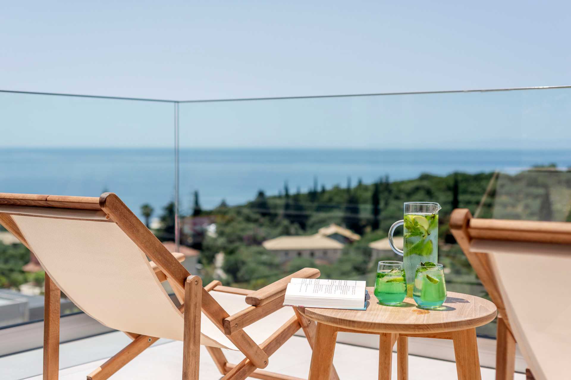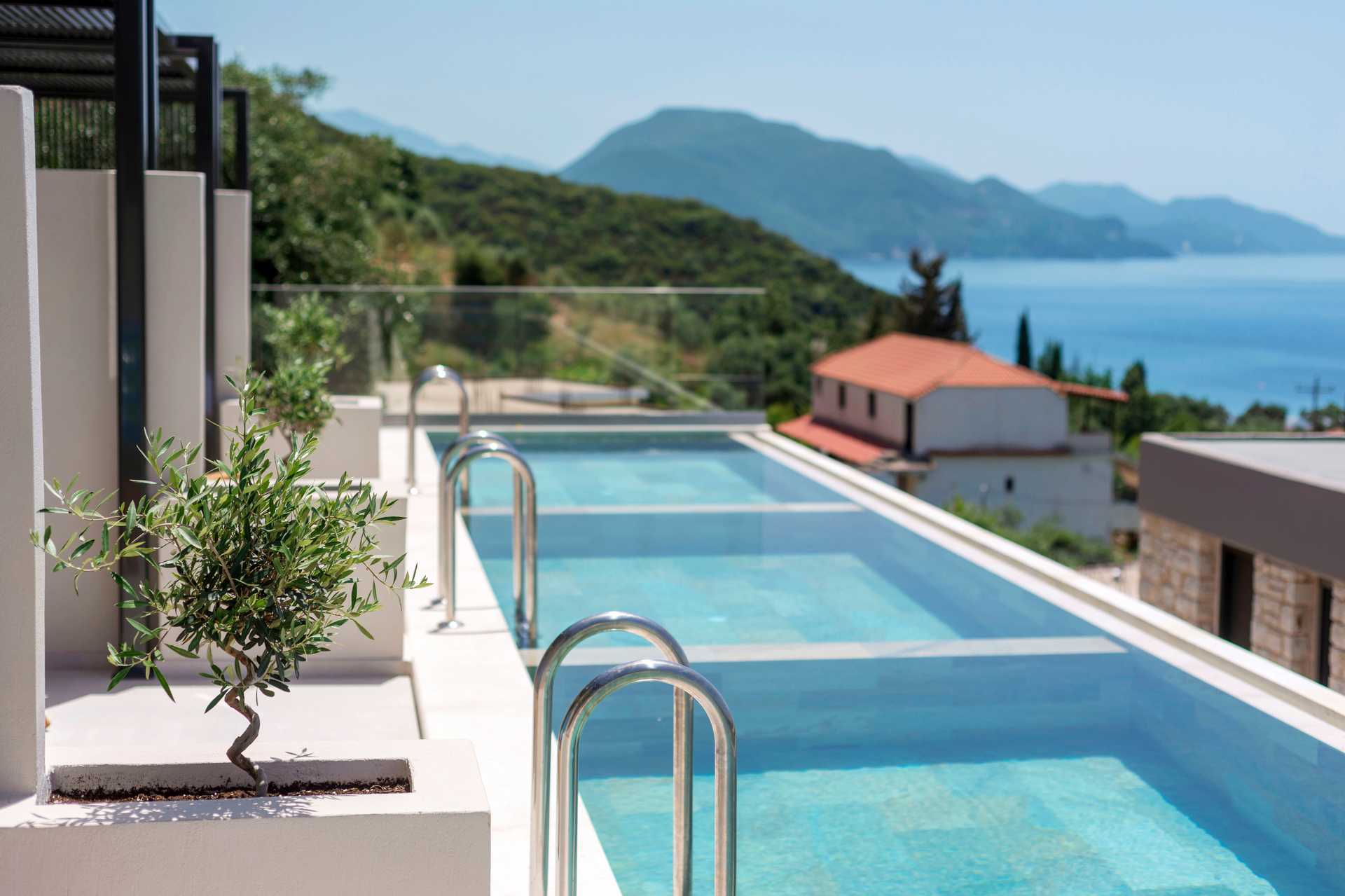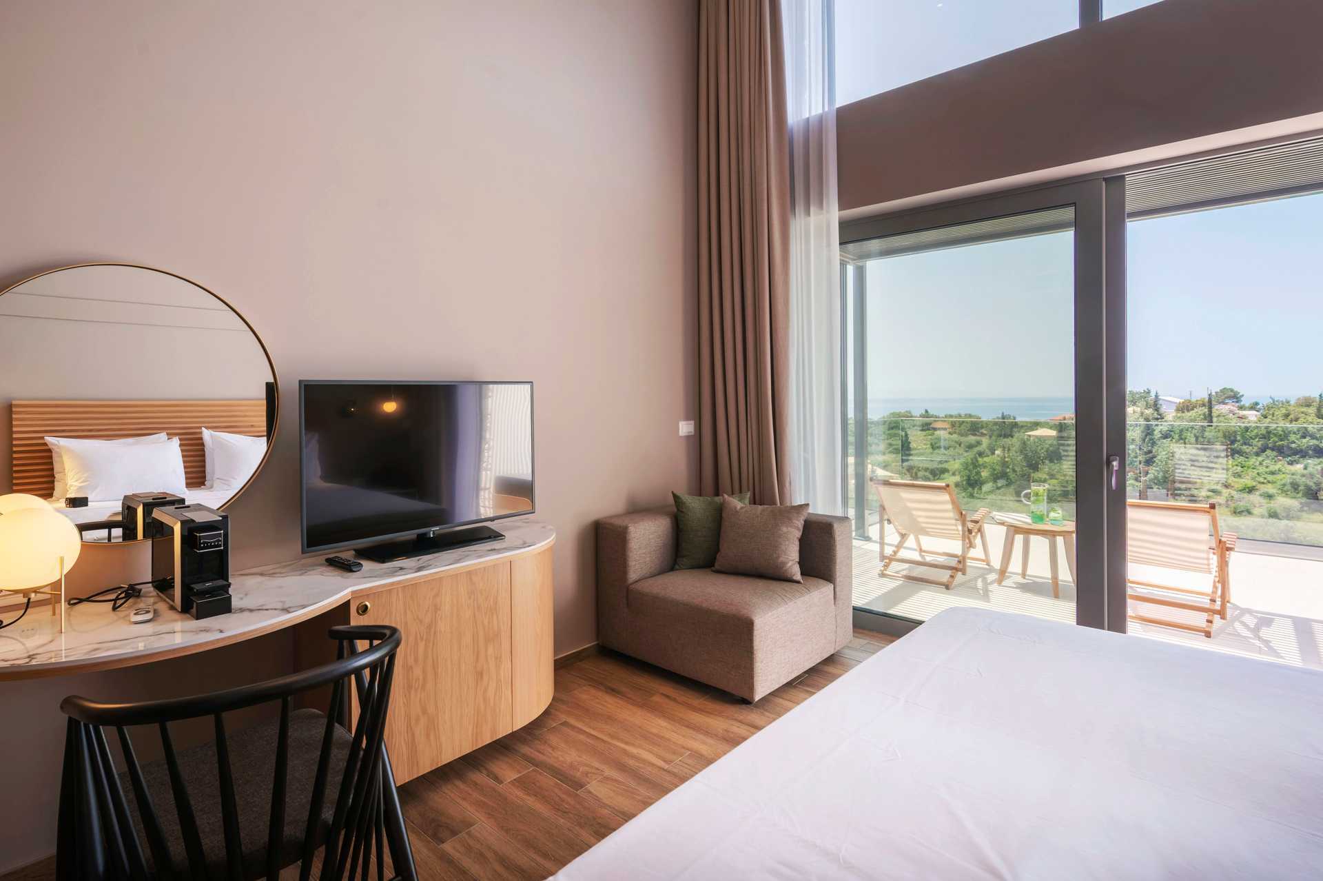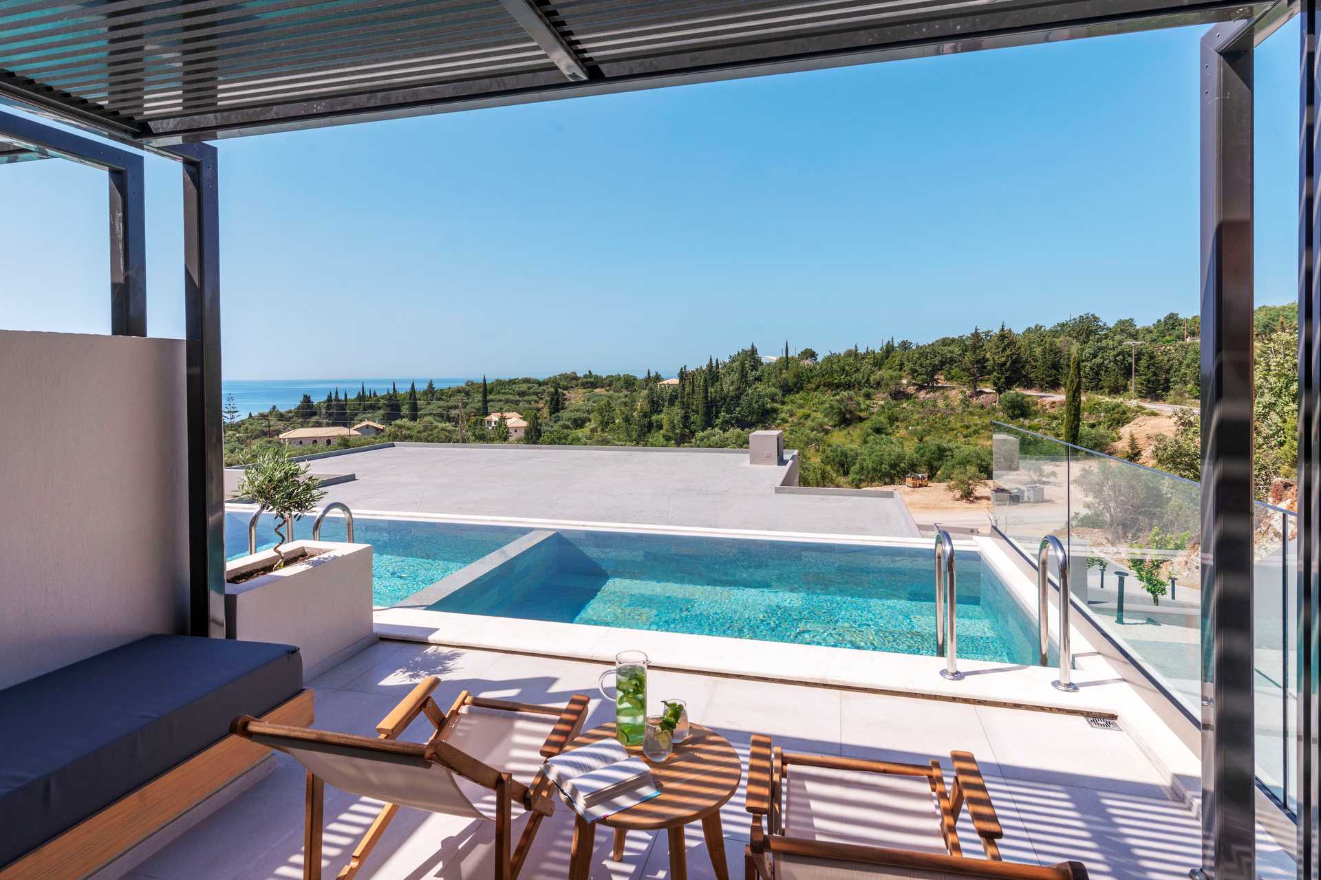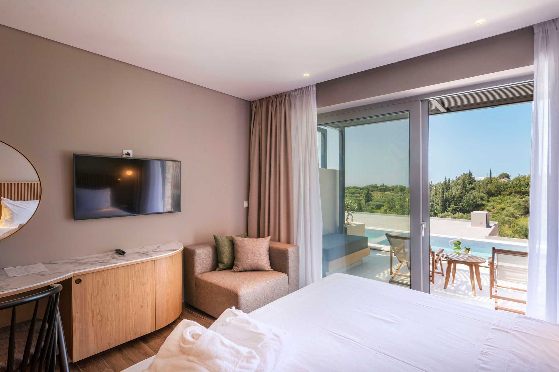 Tweepersoonskamer met terras met privézwembad en uitzicht op het zwembad en de zee. Het slaapcomfort is hoog met een comfortabel tweepersoonsbed en beddengoed van CocoMat. Wifi, kluis en airconditioning inbegrepen. Koffiezetapparaat, capsules bij aankomst daarna tegen betaling. Koelkast. Tv met internationale zenders. Bluetooth speakers kunnen tegen borg geleend worden bij de receptie. Föhn. Badkamer met douche en toilet. Schoonmaak 7 keer / week.
