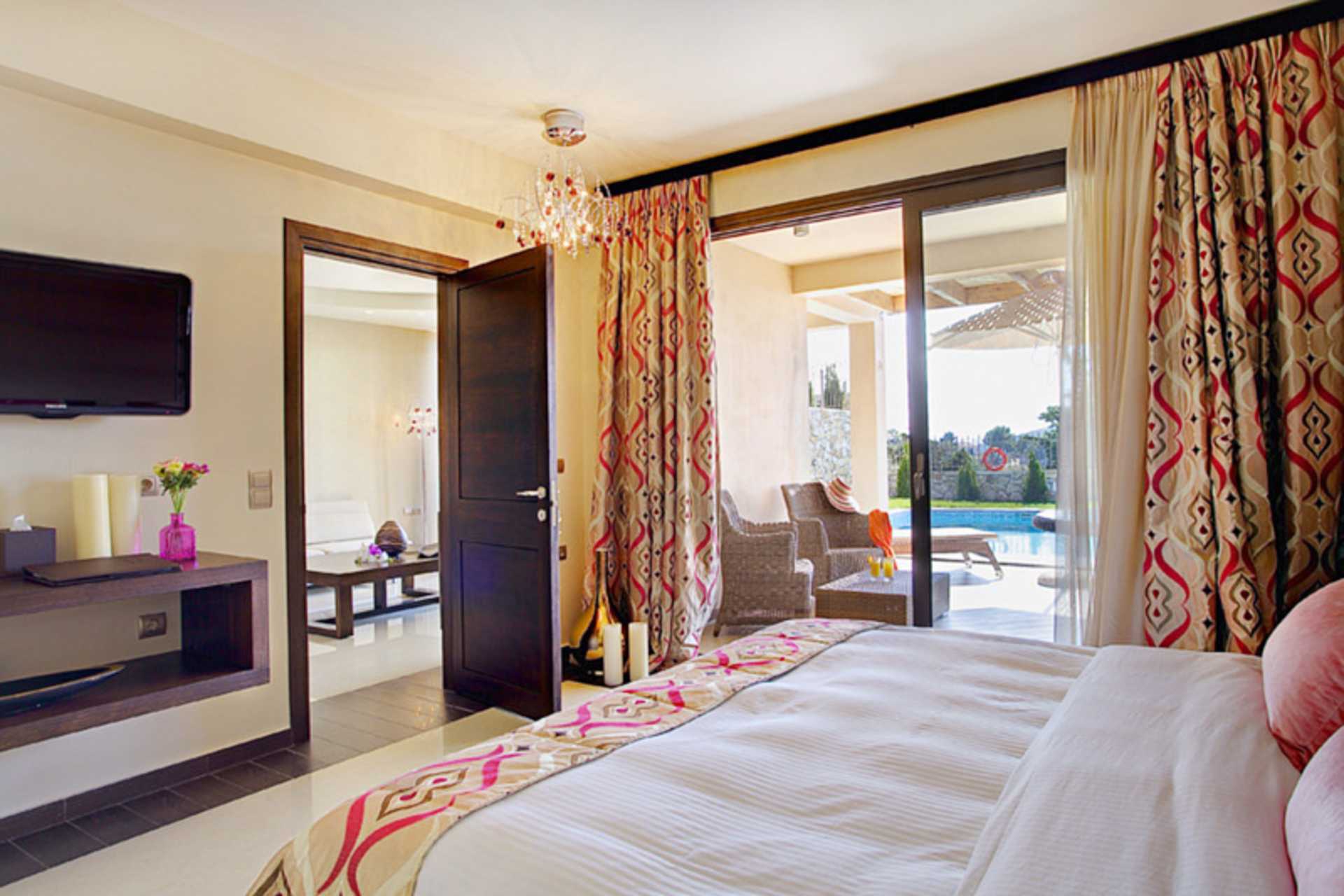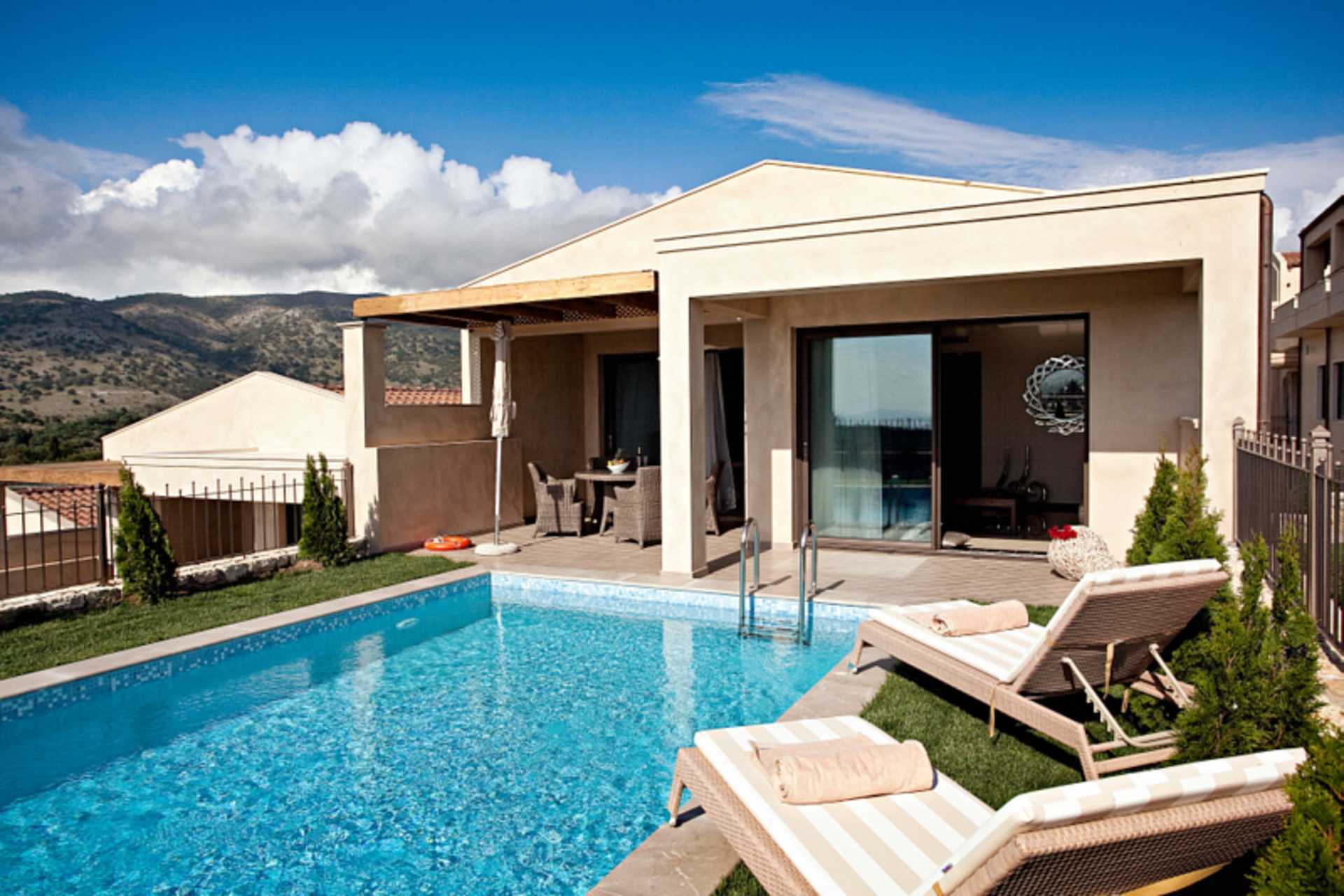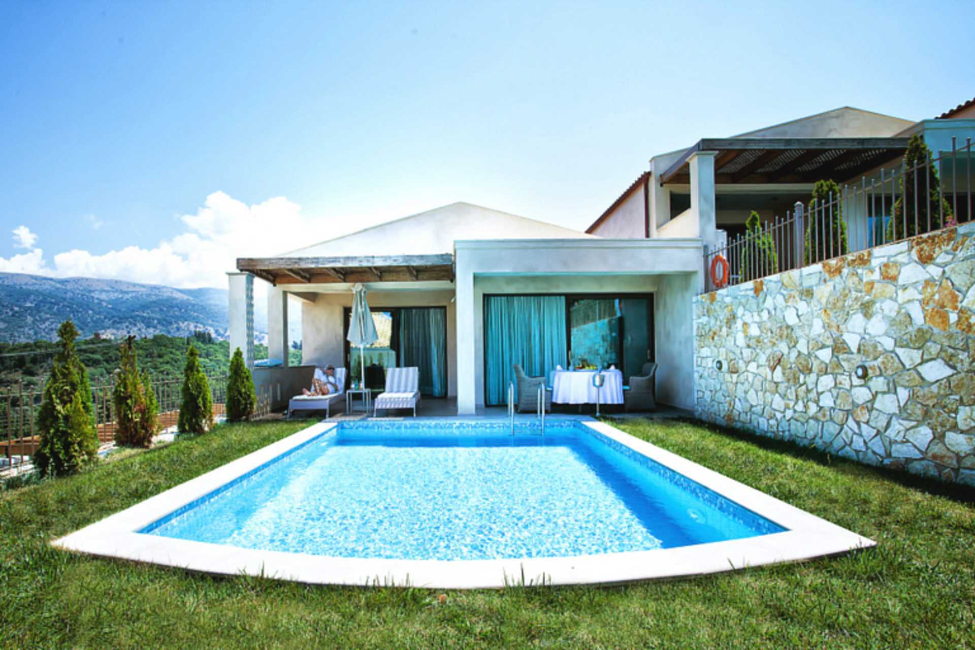 Villa met twee slaapkamers en een tuinterras met privé zwembad (ongeveer 24 m2), ligstoelen en eethoek en een ladder naar beneden in het zwembad. De villa bestaat uit een slaapkamer en een woonkamer en ligt naast het hoofdgebouw. Eén tweepersoonsbed. Mogelijkheid voor extra bedden in twee slaapbanken. Wifi, kluisje en airconditioning inbegrepen. Twee koelkasten. Espressoapparaat. Ketel. Een tv met internationale zenders in elke kamer. Badjassen en slippers. Föhn. Badkamer met jacuzzi, aparte douche en WC. Schoonmaak 7 keer per week.