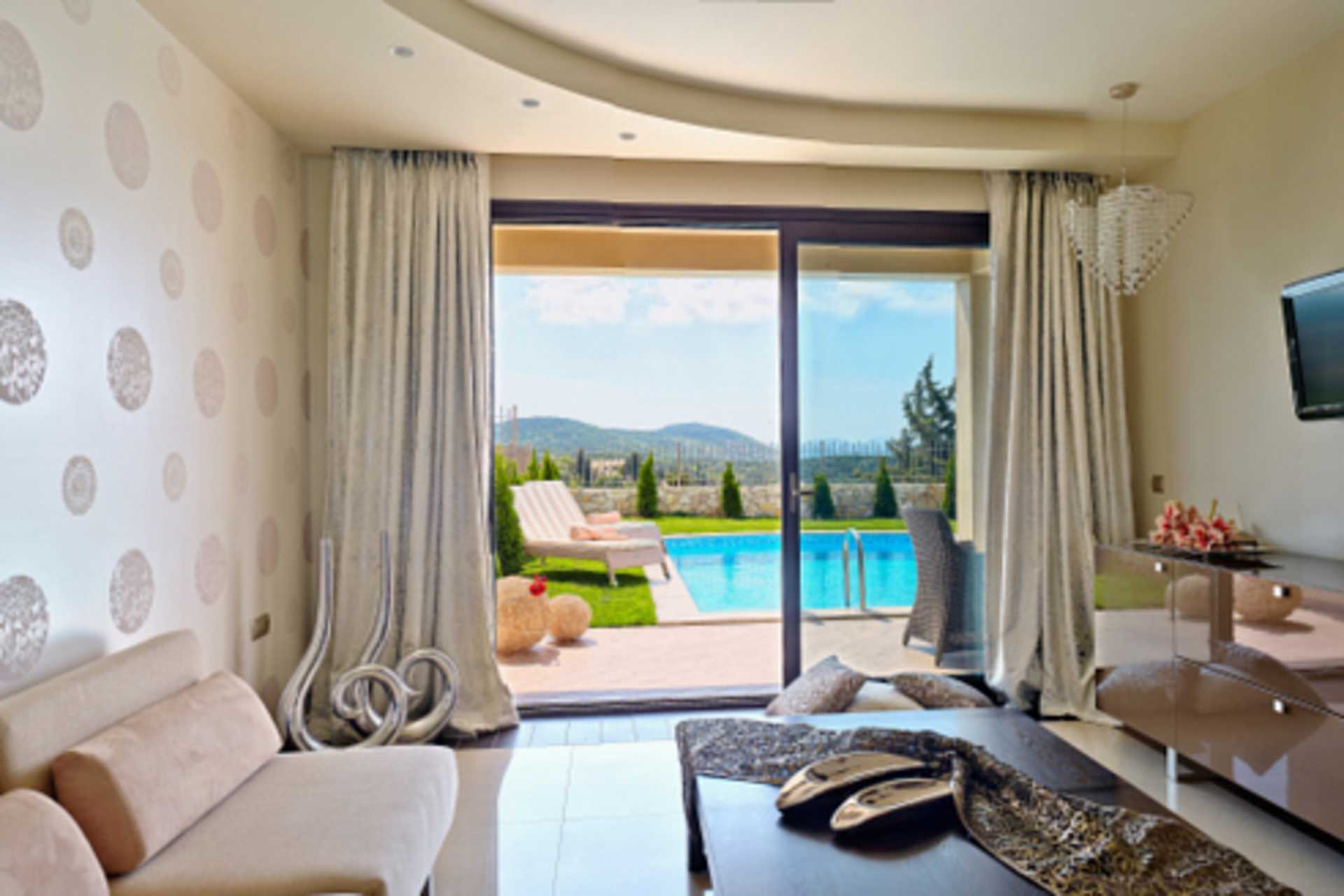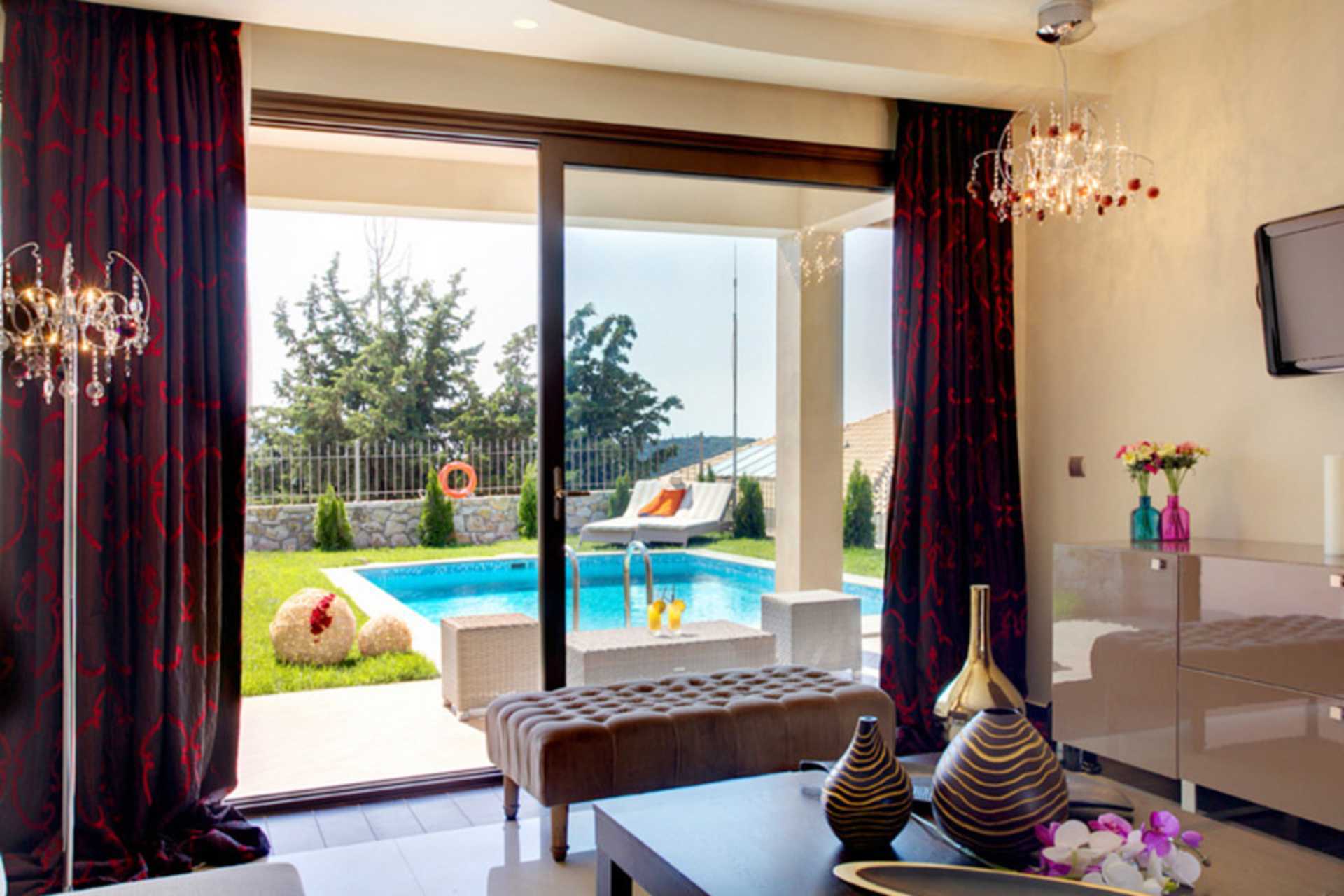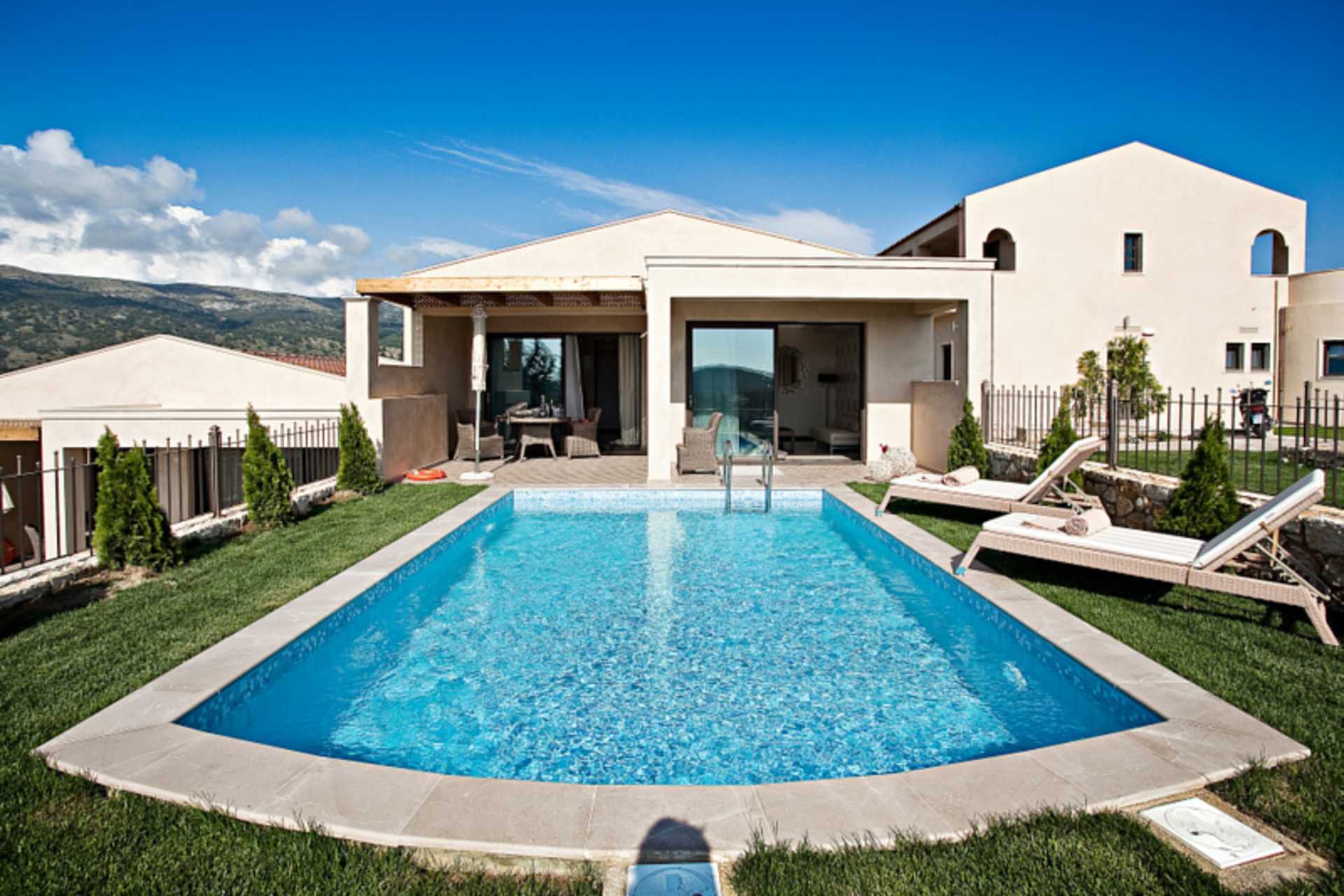 Villa met twee slaapkamers en een tuinterras met privé zwembad (ongeveer 24 m2), ligstoelen en eethoek en een ladder naar beneden in het zwembad. De villa bestaat uit een slaapkamer en een woonkamer en ligt naast het hoofdgebouw. Eén tweepersoonsbed. Mogelijkheid voor extra bedden in twee slaapbanken. Wifi, kluisje en airconditioning inbegrepen. Twee koelkasten. Espressoapparaat. Ketel. Een tv met internationale zenders in elke kamer. Badjassen en slippers. Föhn. Badkamer met jacuzzi, aparte douche en WC. Schoonmaak 7 keer per week.